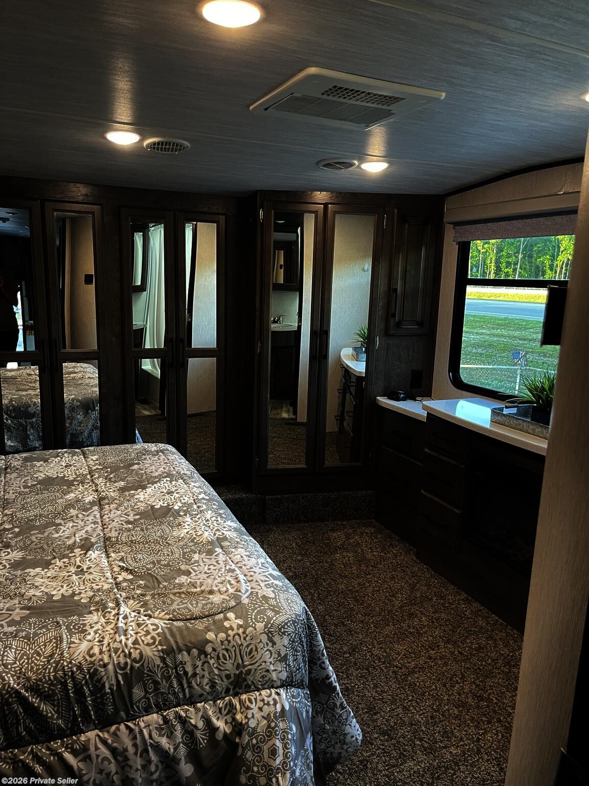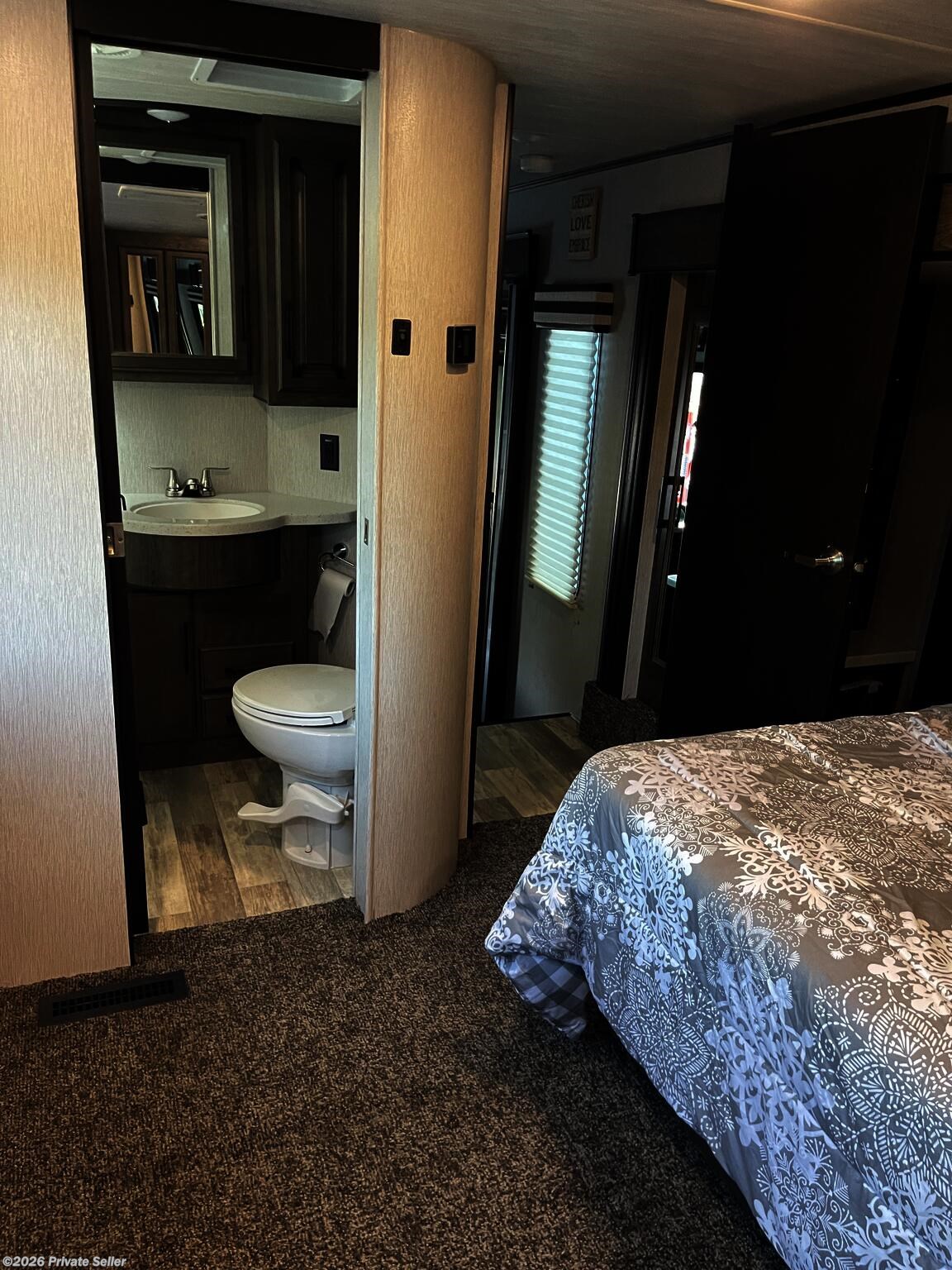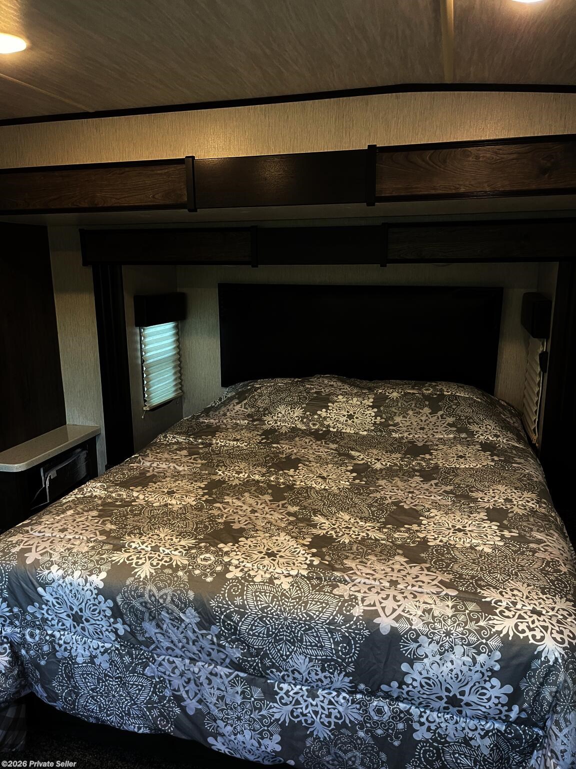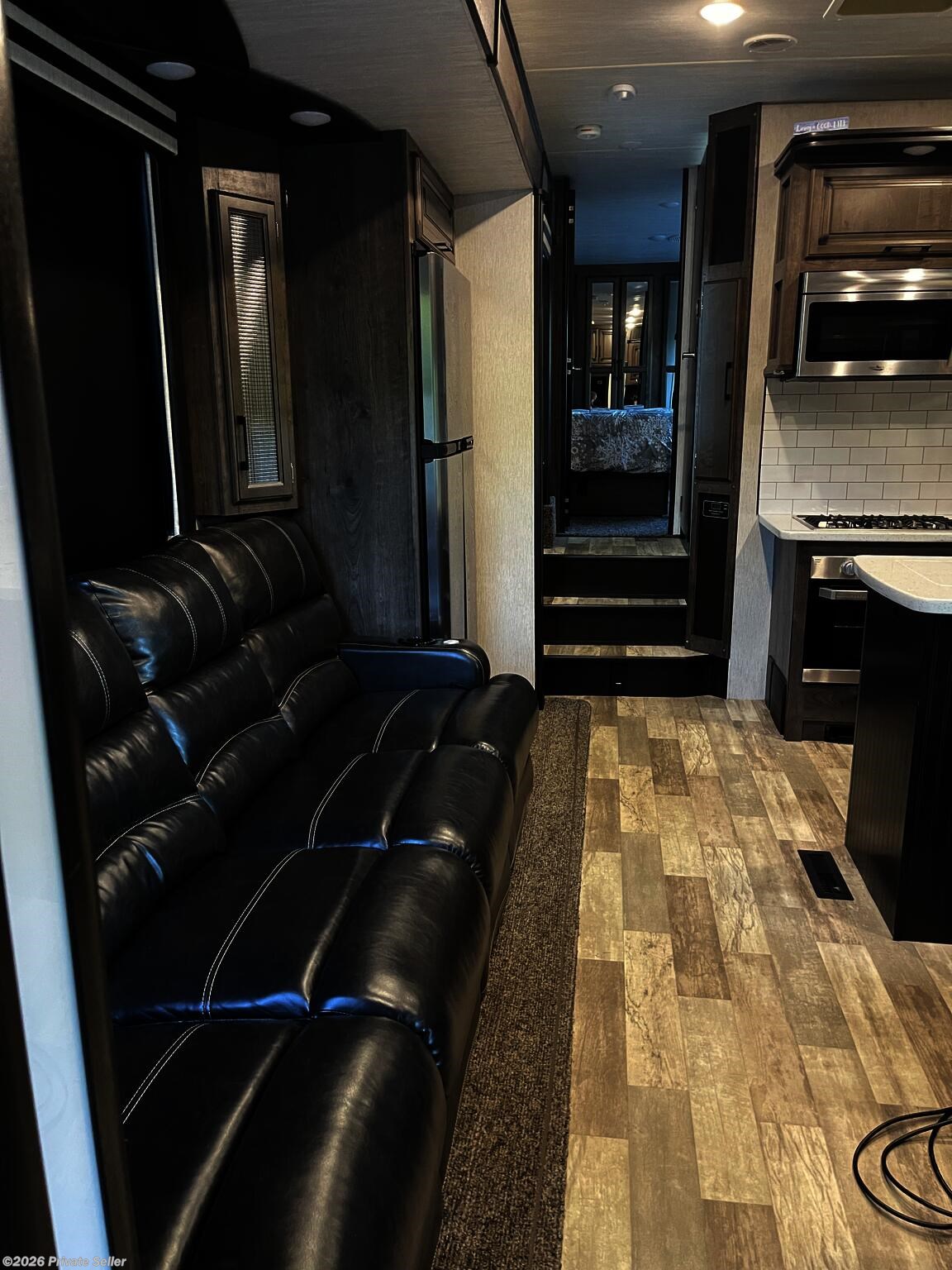 Luxury toy hauler fifth wheel in excellent shape. Kitchen has lots of cabinet space and all applicances clean and in working order. Den area has couch that reclines on each end and large tv. Bose sound bar that connects to outdoor speakers. Bedroom has 2 slides which makes it roomy with queen size bed and electric fireplace. Blackout shades and 3 ac units keep rig nice and cool on hot days. Washer/dryer hookups located in the closet. Toy hauler is 13 feet and has 1/2 bath, mounted tv, and has a bed and bench seating that is on hydraulic lift. Small loft area with a bed also in garage. Patio off back of garage with awning. 2 awnings on side and outdoor kitchen with mini fridge. Storage compartment for large propane tank. Gas powered generator