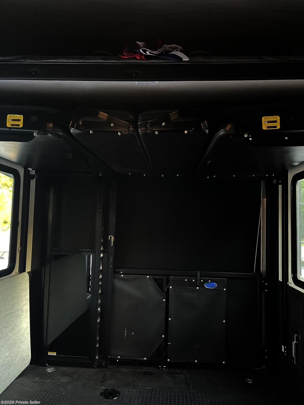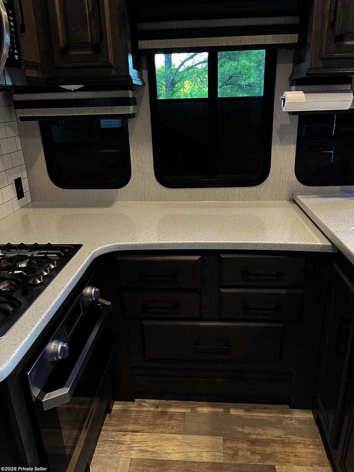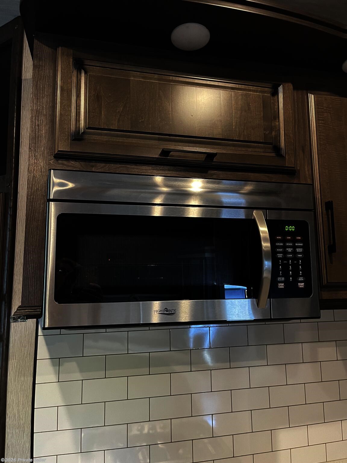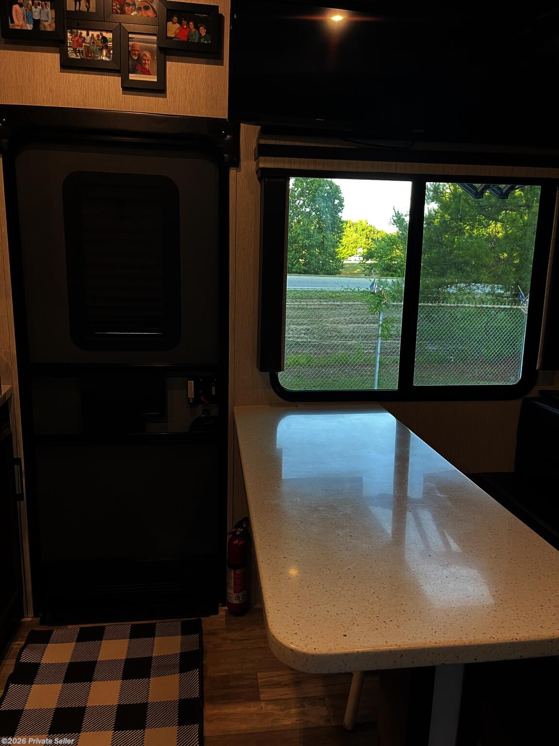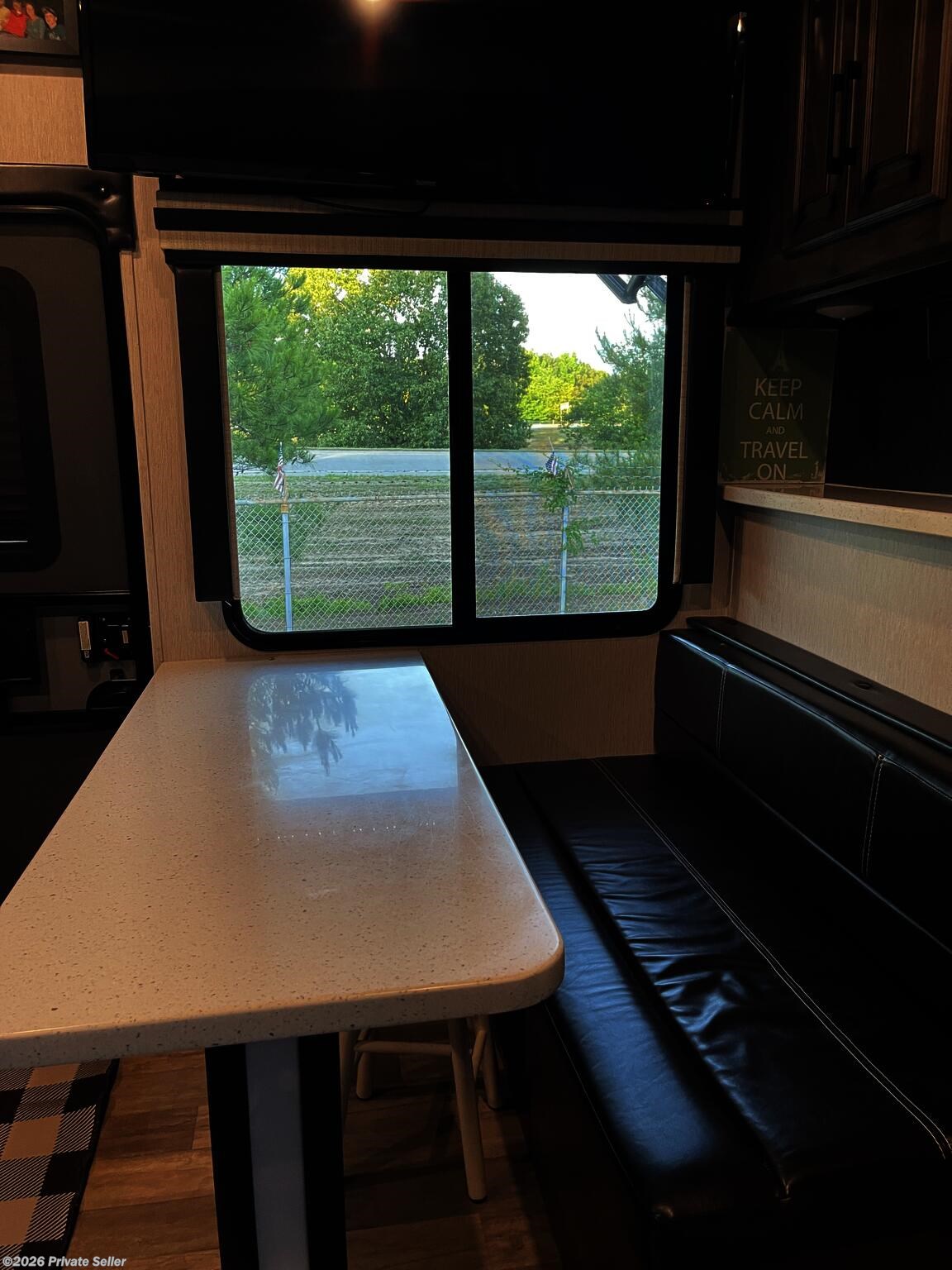 Luxury toy hauler fifth wheel in excellent shape. Kitchen has lots of cabinet space and all applicances clean and in working order. Den area has couch that reclines on each end and large tv. Bose sound bar that connects to outdoor speakers. Bedroom has 2 slides which makes it roomy with queen size bed and electric fireplace. Blackout shades and 3 ac units keep rig nice and cool on hot days. Washer/dryer hookups located in the closet. Toy hauler is 13 feet and has 1/2 bath, mounted tv, and has a bed and bench seating that is on hydraulic lift. Small loft area with a bed also in garage. Patio off back of garage with awning. 2 awnings on side and outdoor kitchen with mini fridge. Storage compartment for large propane tank. Gas powered generator