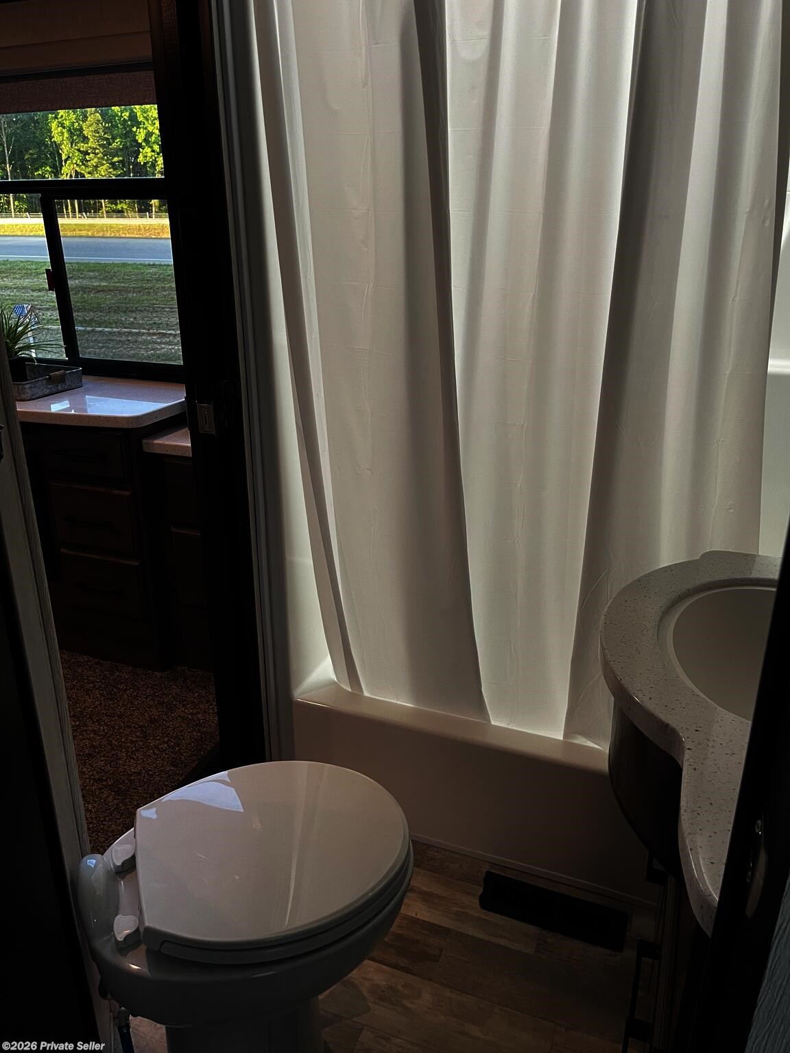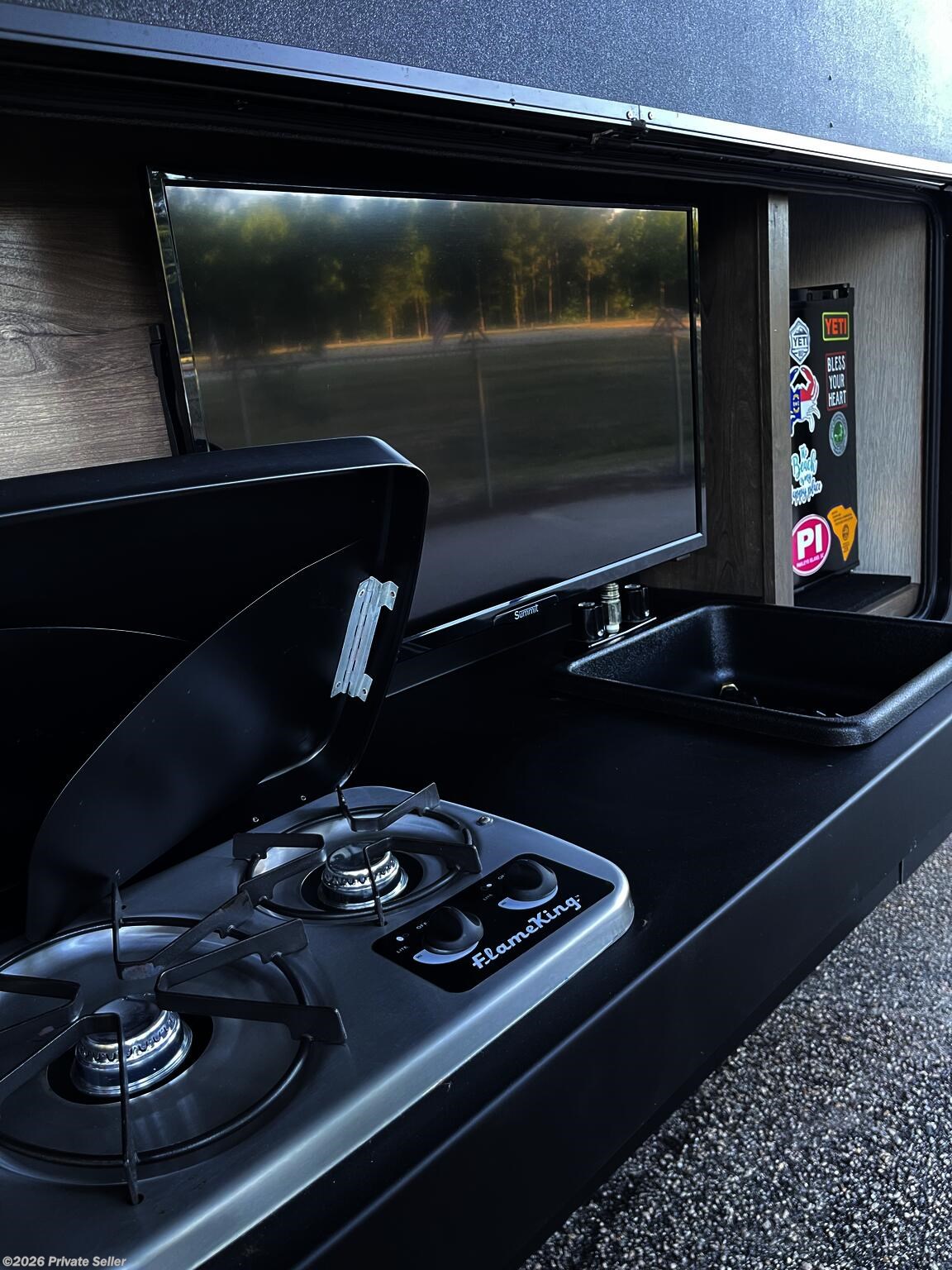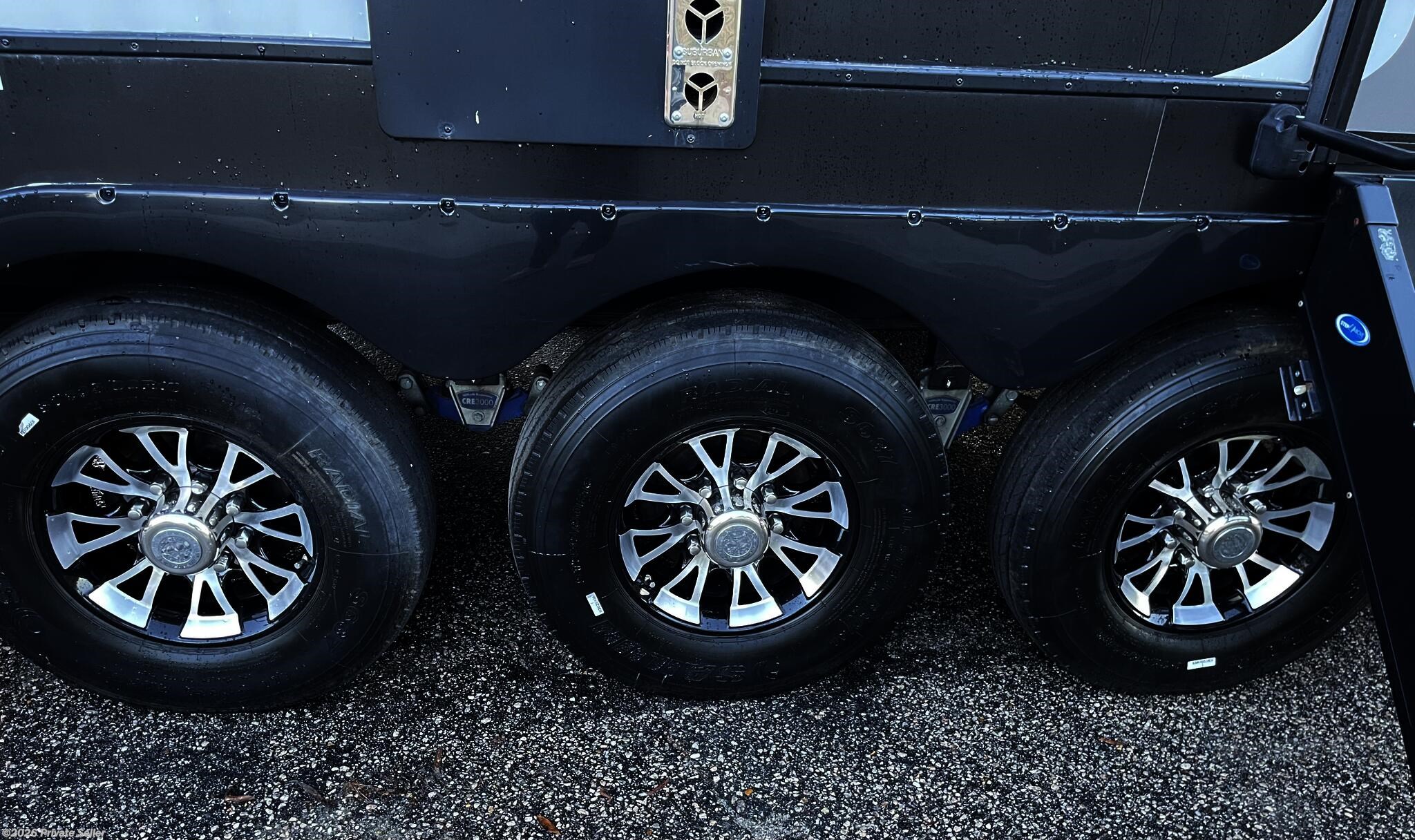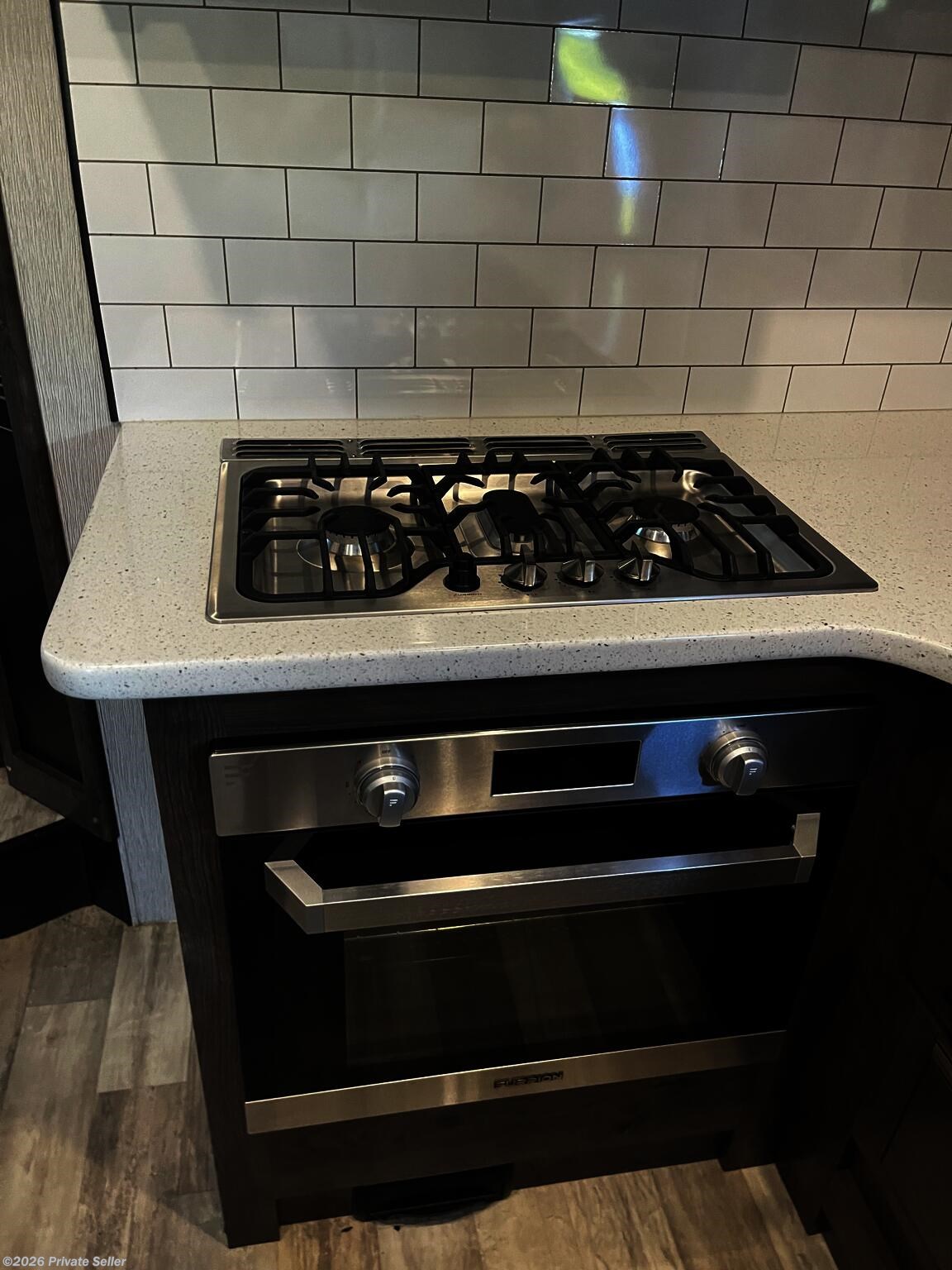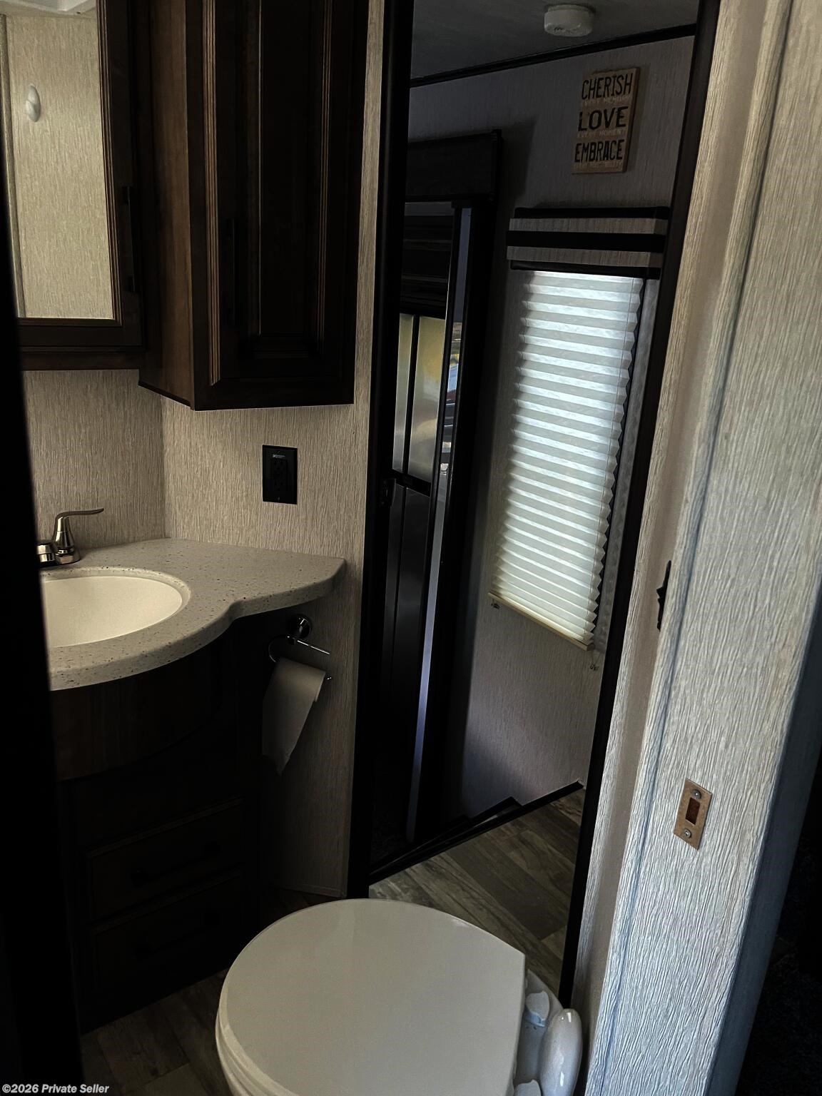 Luxury toy hauler fifth wheel in excellent shape. Kitchen has lots of cabinet space and all applicances clean and in working order. Den area has couch that reclines on each end and large tv. Bose sound bar that connects to outdoor speakers. Bedroom has 2 slides which makes it roomy with queen size bed and electric fireplace. Blackout shades and 3 ac units keep rig nice and cool on hot days. Washer/dryer hookups located in the closet. Toy hauler is 13 feet and has 1/2 bath, mounted tv, and has a bed and bench seating that is on hydraulic lift. Small loft area with a bed also in garage. Patio off back of garage with awning. 2 awnings on side and outdoor kitchen with mini fridge. Storage compartment for large propane tank. Gas powered generator