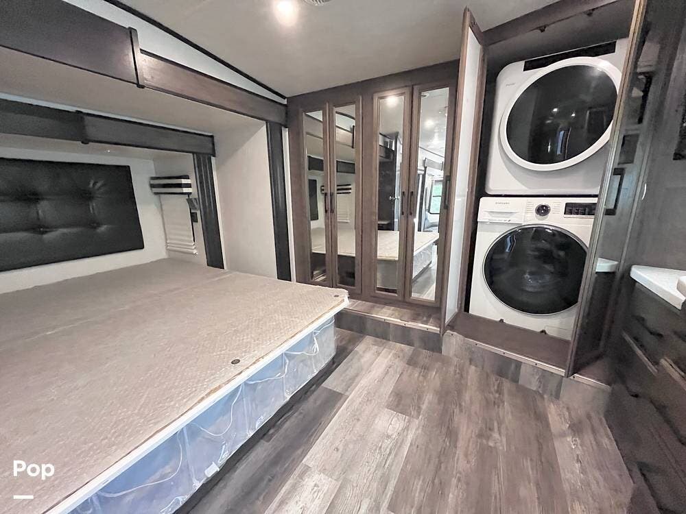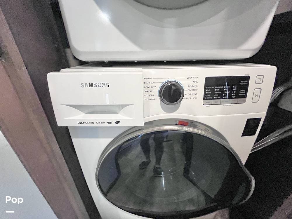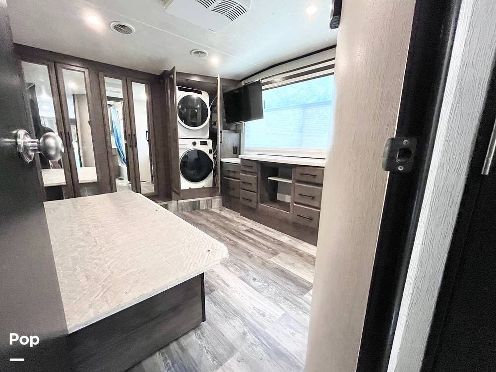 Access the king bedroom suite from the hallway or through the full bath. Large closet space, a washer, dryer, and wardrobe space are ready for the fortunate occupants of this coach.