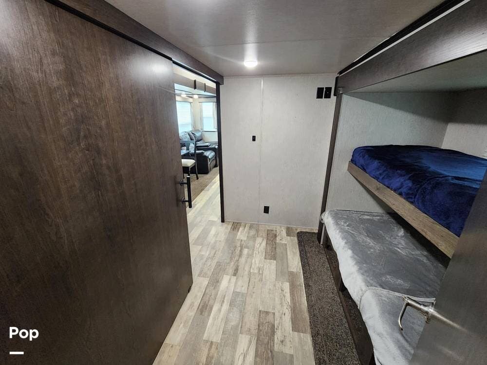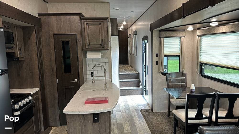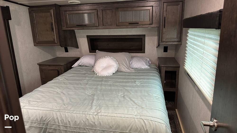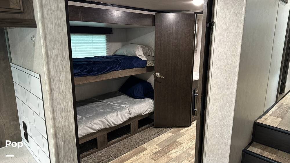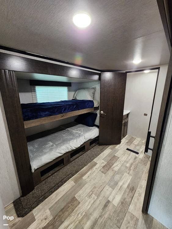 With sleeping space for up to eight, it's designed to accommodate both large families and guests, providing everyone with a comfortable place to rest after a day of adventure. The unique mid-bunk floor plan adds flexibility, offering a private room that can serve as a second bedroom, an office, or a quiet hideaway.