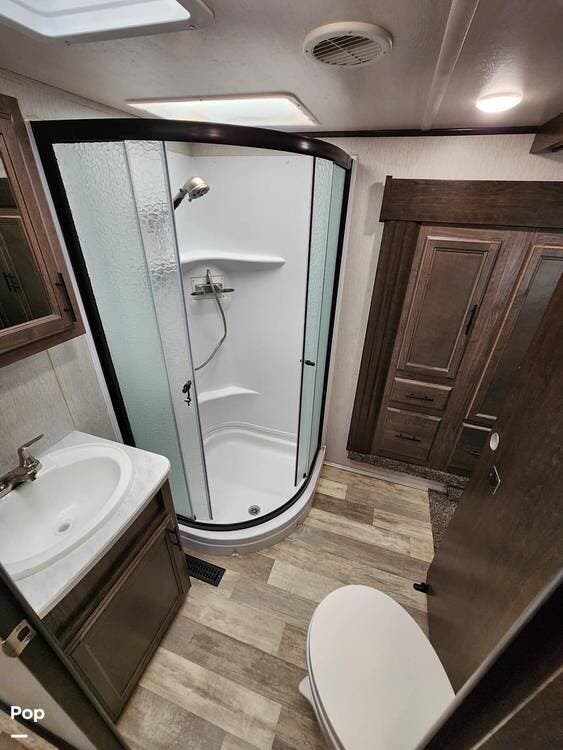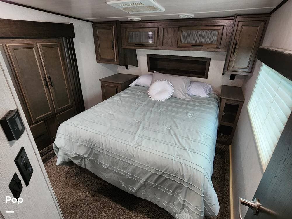 The master suite provides a peaceful retreat, offering ample space and storage to keep things organized on the road. Combined with the spacious bathroom and quality finishes throughout, this fifth wheel offers both convenience and comfort.