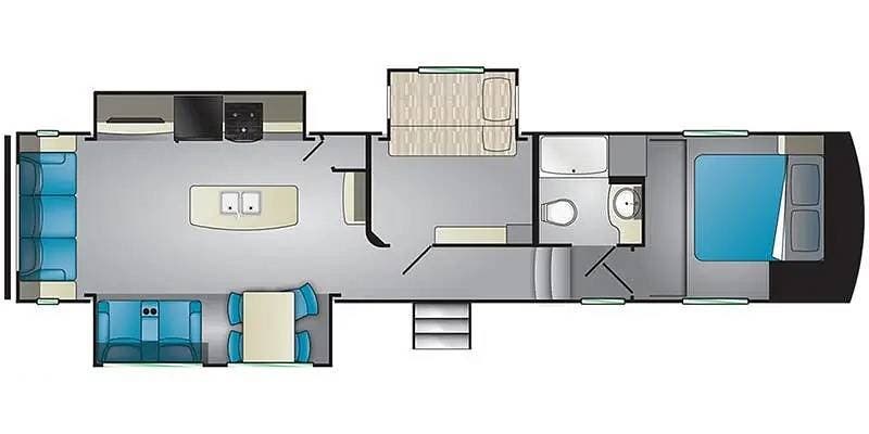 The Pioneer PI355 floorplan is very desirable due to the fact it has a mid-bunk room located between the kitchen and bathroom. The two bunks can also be left up or removed to make an office or bonus room.