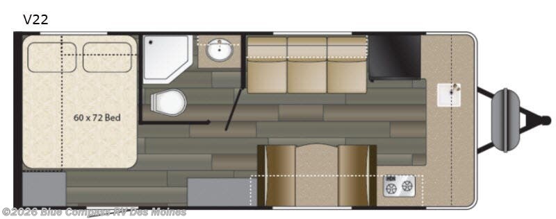 Load up your family of four, your camping gear, and head out for a long weekend with this V22 Terry Classic travel trailer by Heartland RV in tow. This model is lightweight, yet packed full of modern conveniences. The front kitchen features stainless steel appliances such as a 6 cu. ft. refrigerator and a two burner range. There is plenty of counter space which makes meal prep easy, plus you will enjoy the view out the front window as you work. When you are ready to call it a night, come enjoy the comfort of the rear queen bed where you can rest up for another day of fun! Throughout this model there are plenty of overhead cabinets where you can stow away your personal belongings, plus so much more! Inside you will enjoy LED ceiling lights with cove surround blue accent lights and in the living room there is a 32” LED TV.