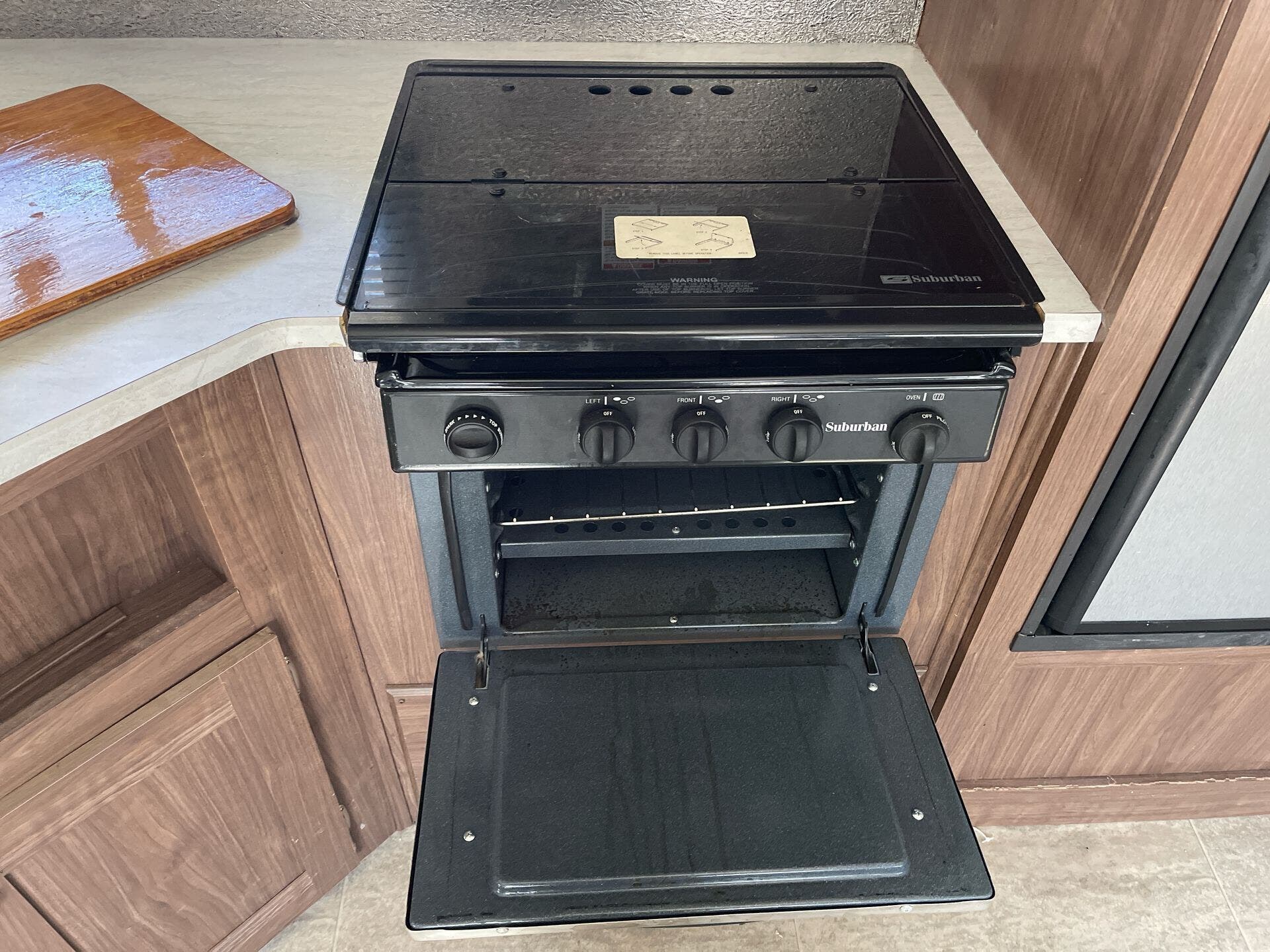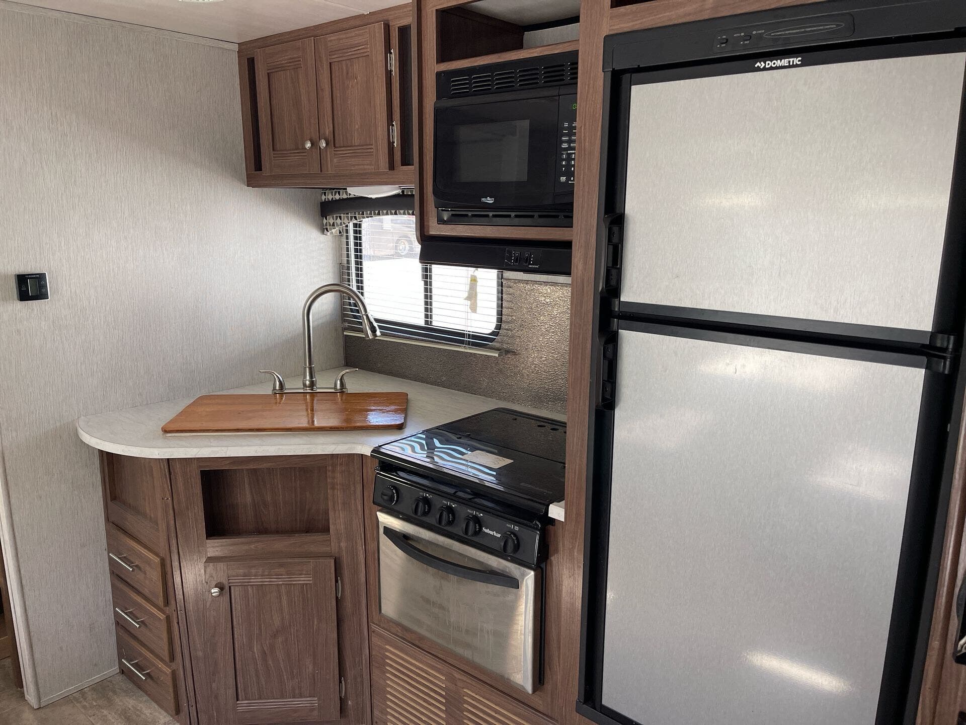 With its aluminum-framed construction, insulated walls and a modern kitchen with three-burner cooktop and double-door refrigerator, this trailer balances comfort with practical functionality—ideal for families or couples who travel frequently.