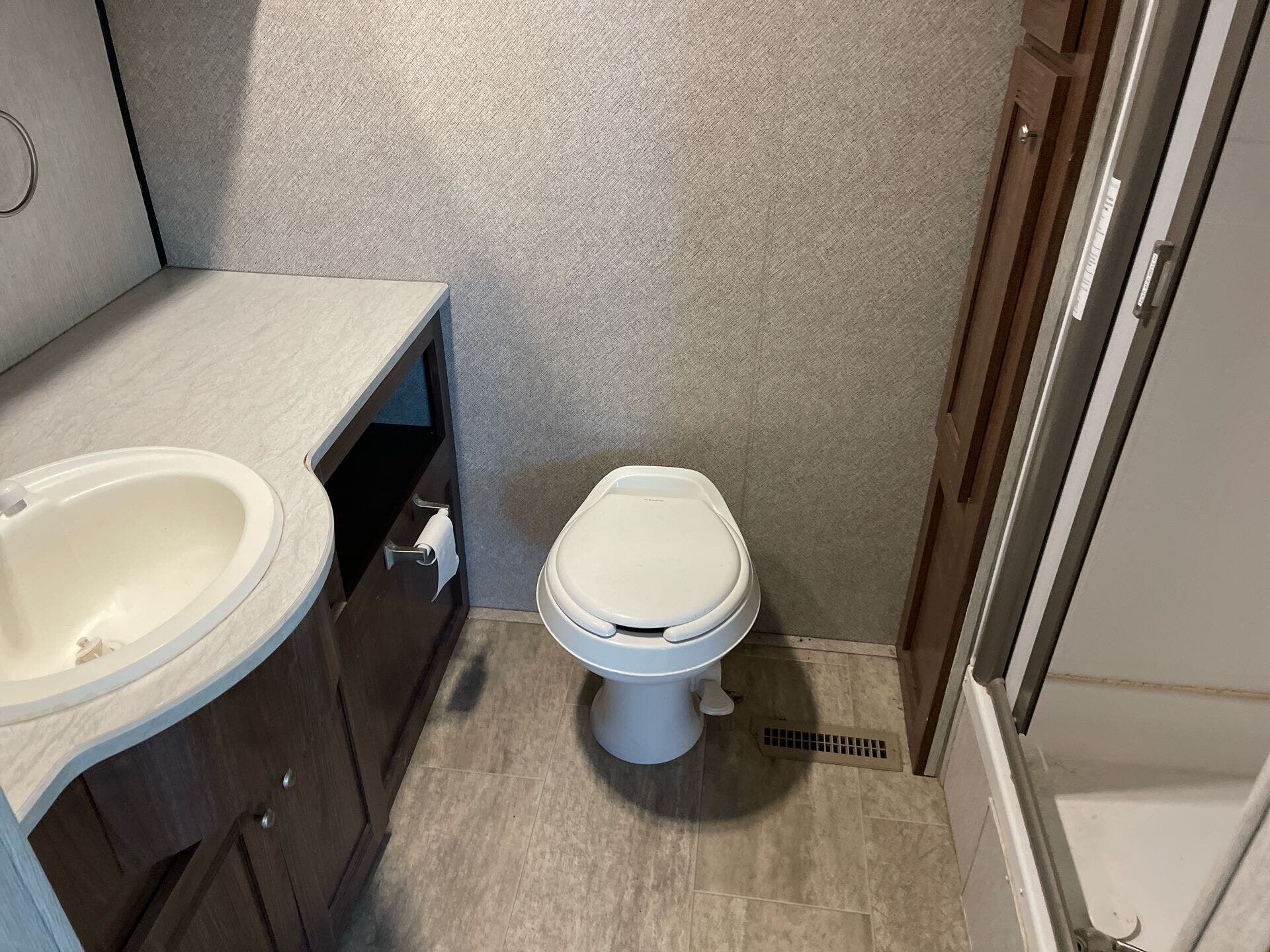 The rear bathroom holds a shower, toilet, sink and counter space, located for ease of access and to maximize living space in the trailer.