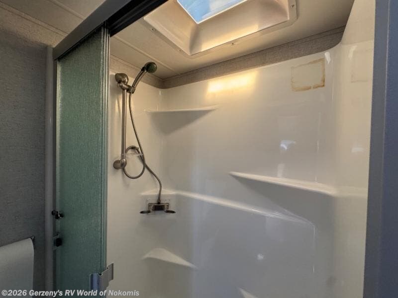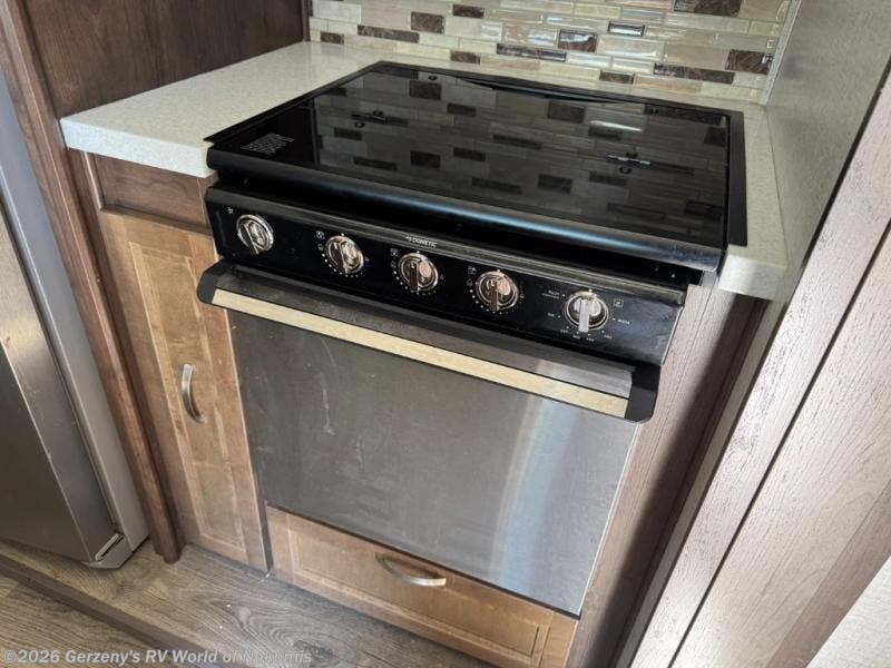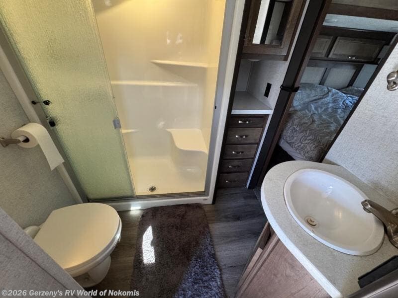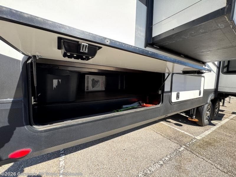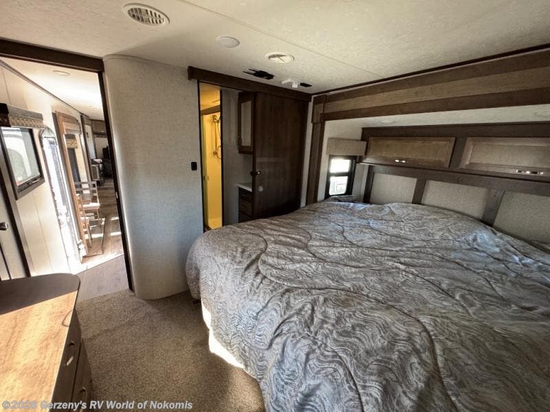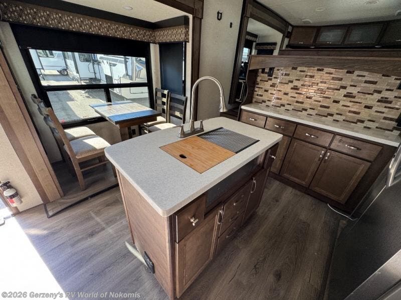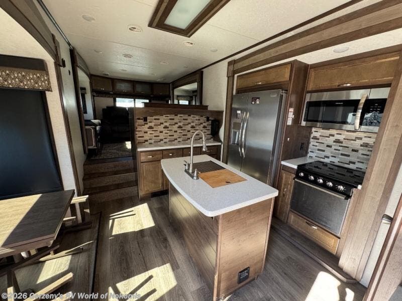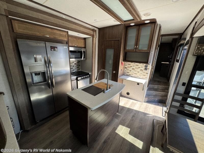 Just imagine you and your favorite person relaxing in comfort with plenty of space to spread out once at your destination with five slides. This fifth wheel provides everything you will want and need from stainless steel appliances and a center island in the separate kitchen, and an LED TV to watch the big game in the rear den with triple sofas. You will also find loads of storage, and a full bathroom with a shower including a seat. You might even like to add a washer and dryer option in the prepped space in the master bedroom, the choice is yours. Why look any further than this model, it's the perfect fit.