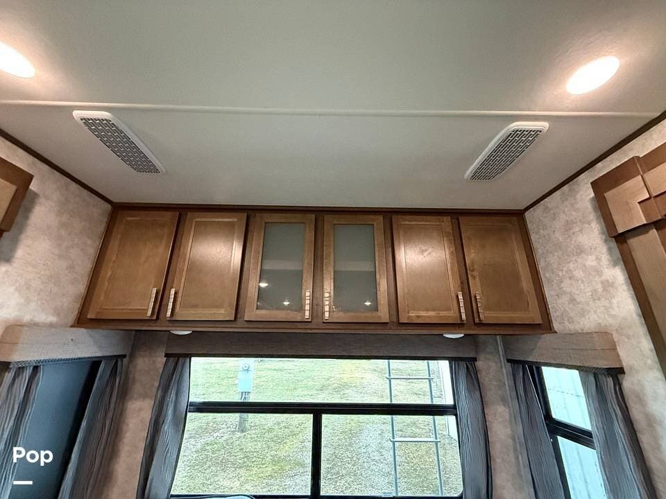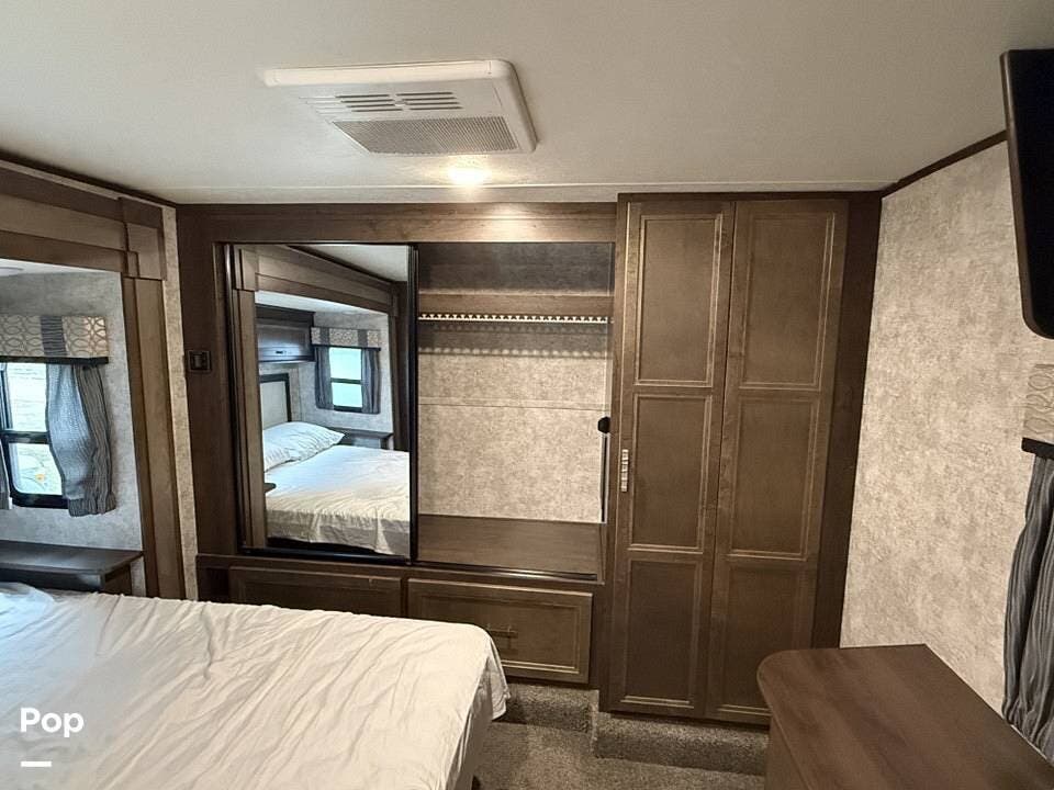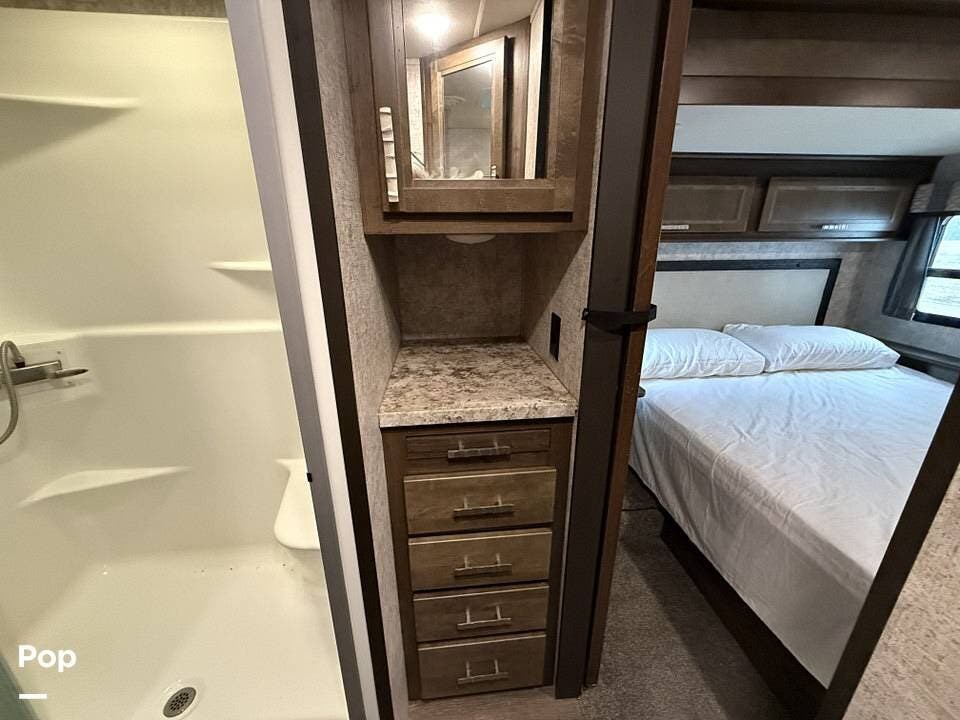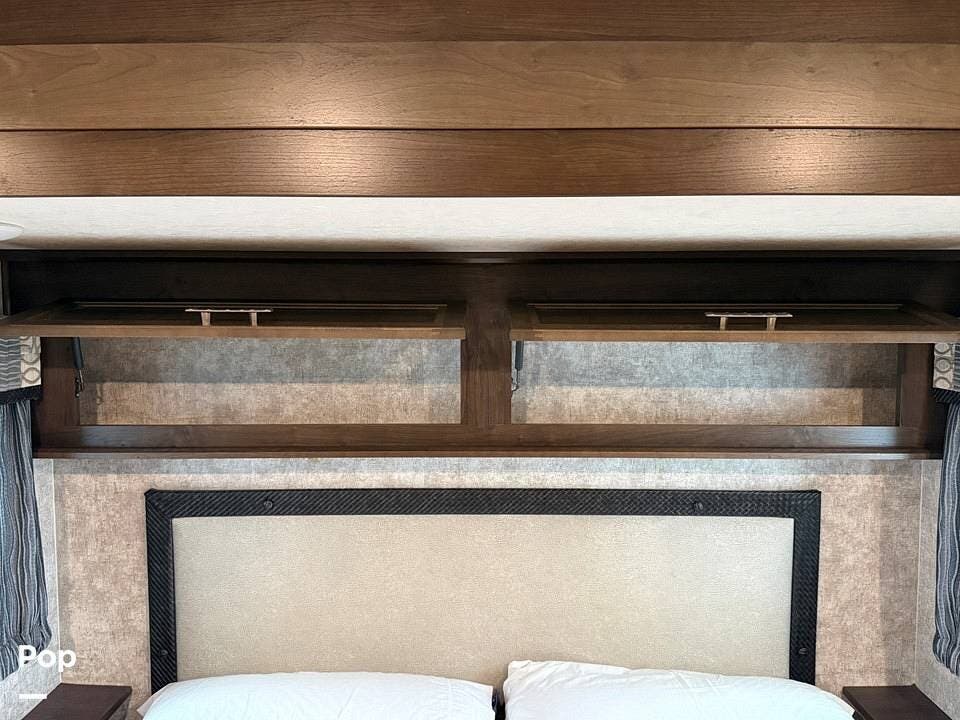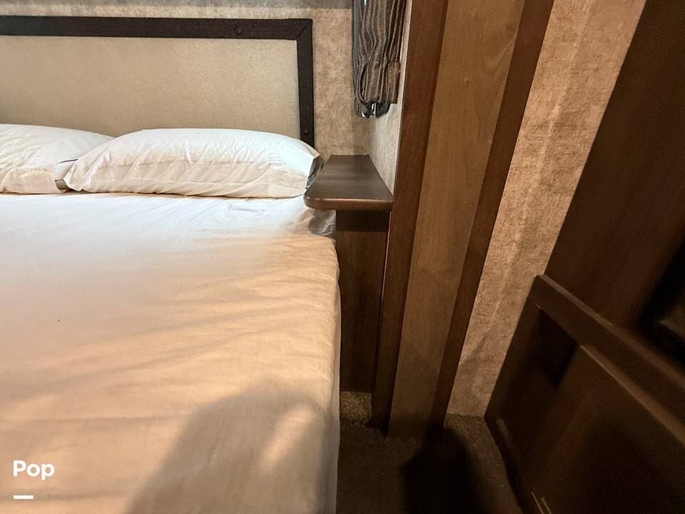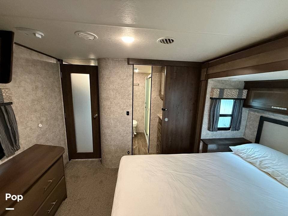 Measuring approximately 36 feet in length, this rear-living model is built with a Four Seasons Package, featuring an enclosed, heated underbelly, a high-performance furnace, and superior insulation to ensure year-round comfort regardless of the weather.