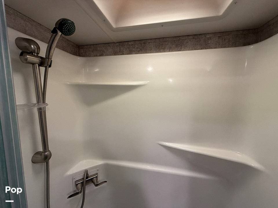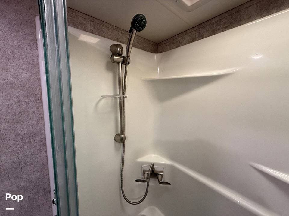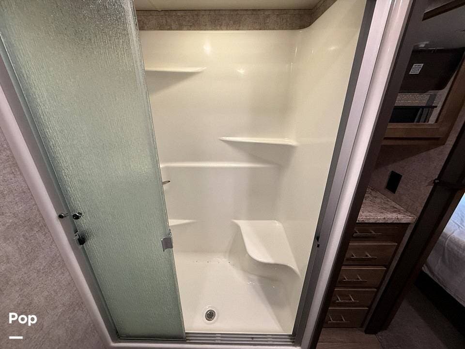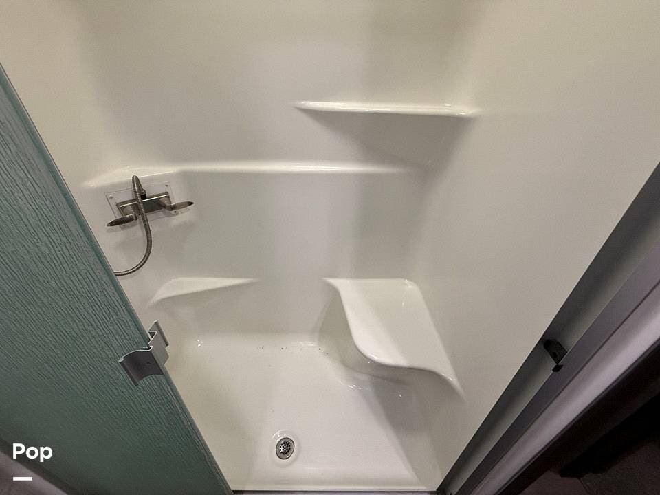 Moving to the master bedroom, you will find a serene oasis designed for maximum comfort, featuring a queen-size bed, ample storage with a mirrored wardrobe, and a dedicated TV mount. A full-sized, adjacent bathroom provides convenience and privacy, featuring an oversized shower with a seat, a porcelain toilet, and a vanity with good counter space. Added features like washer/dryer prep make this unit incredibly versatile for long-term travel. Maintenance is a breeze with the linoleum flooring throughout the main areas, eliminating carpet and making cleanup easy.