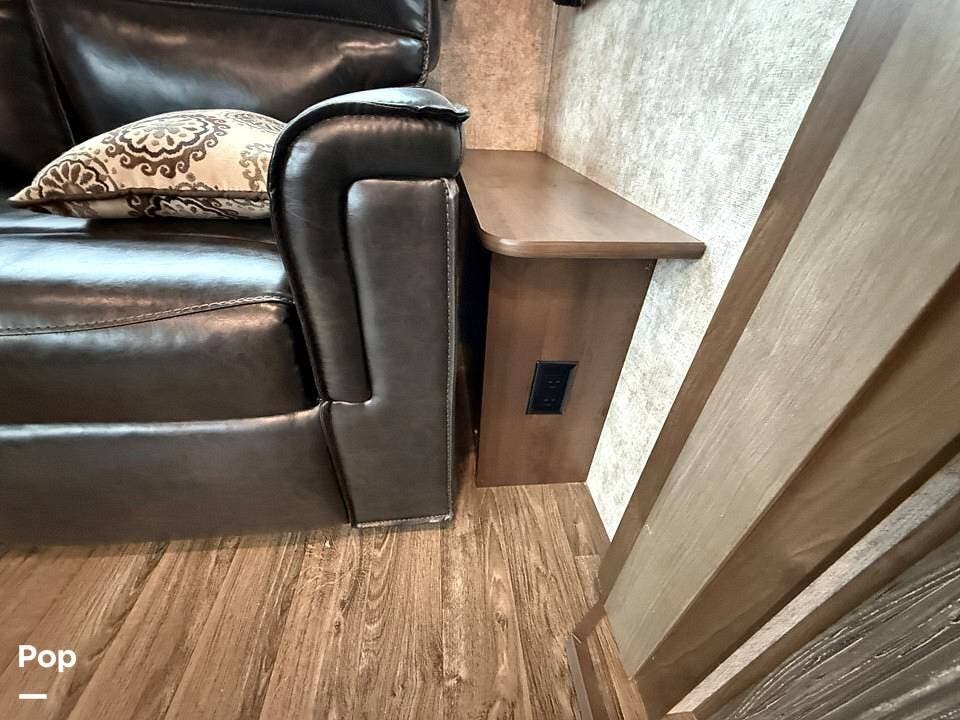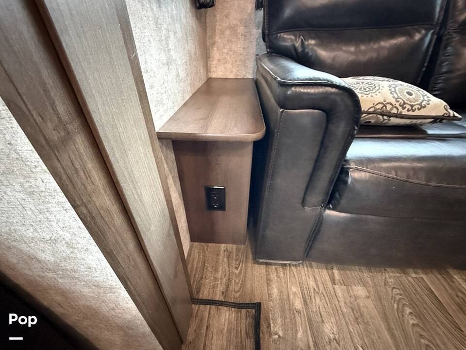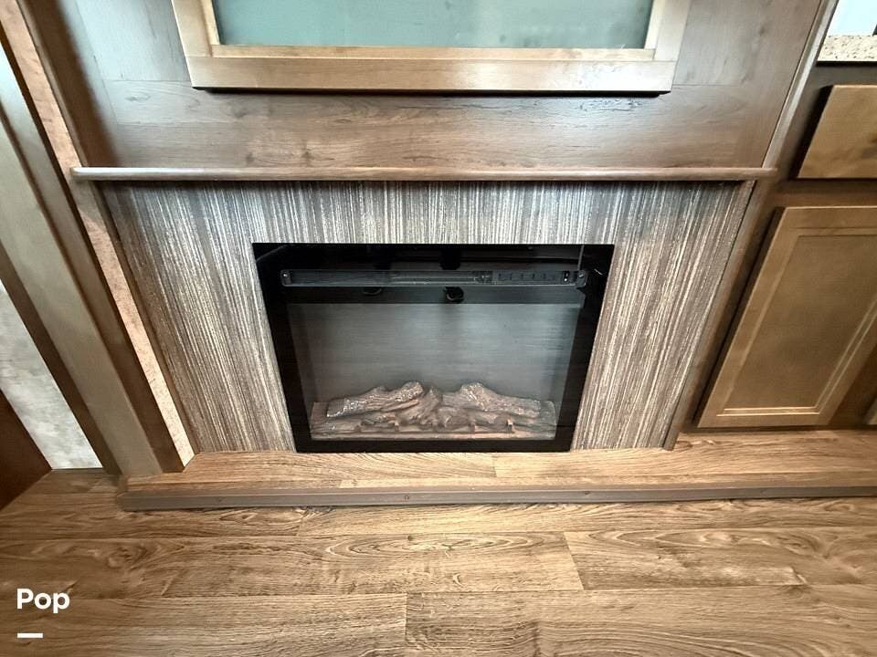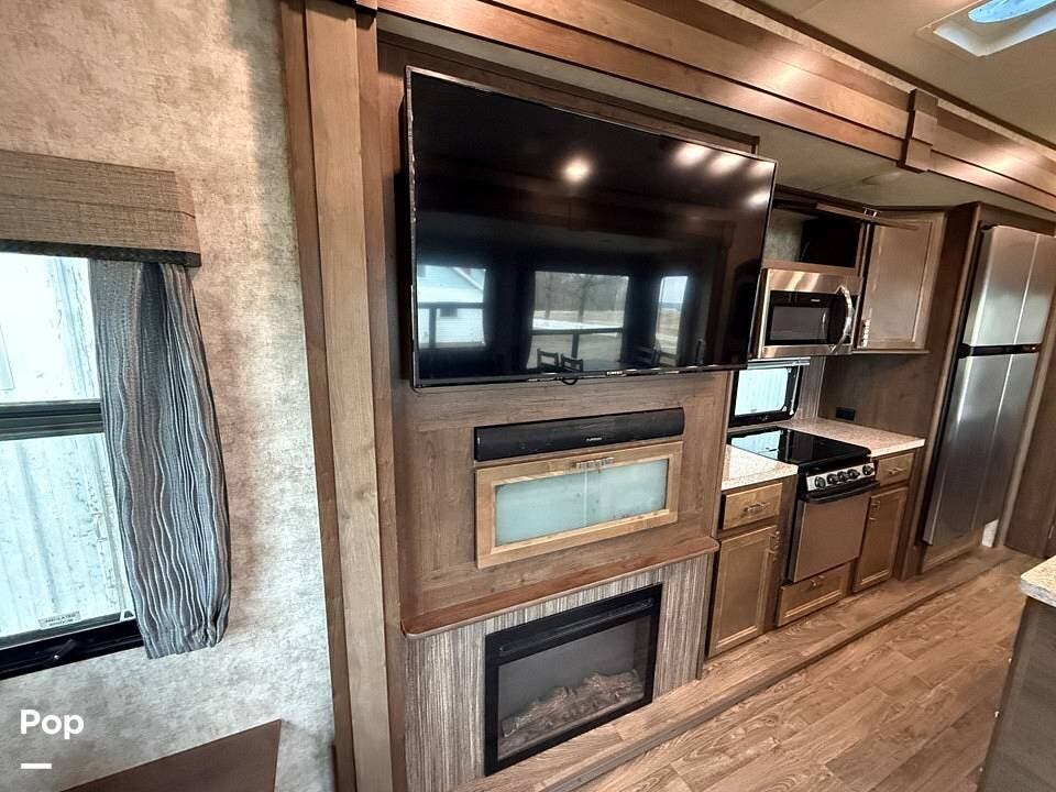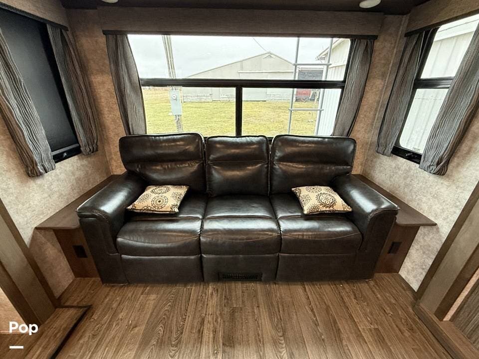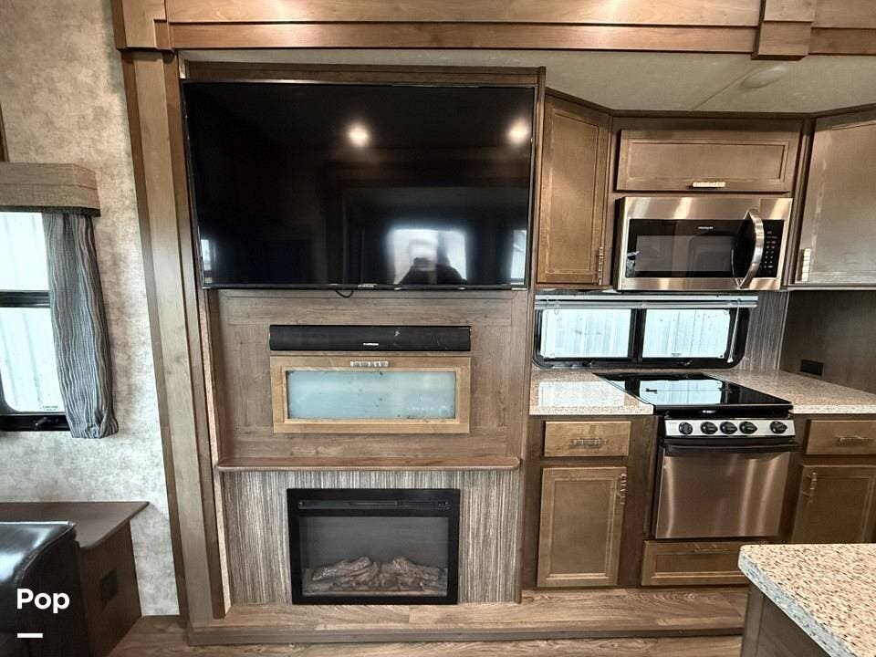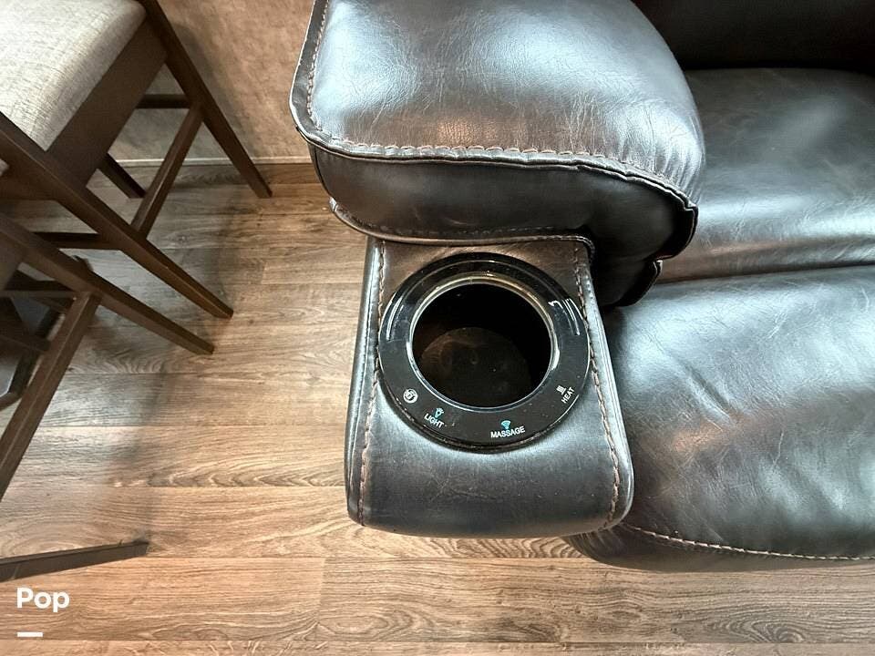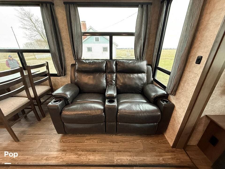The interior of the 314RLS is designed for both entertainment and relaxation. The rear living area is anchored by a cozy fireplace and a large LED TV mounted above, flanked by windows that fill the space with natural light. Comfortable theater-style recliners, featuring heat and massage, are positioned perfectly for movie nights, along with a large sofa sleeper for guests.