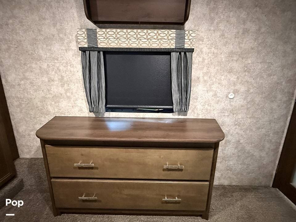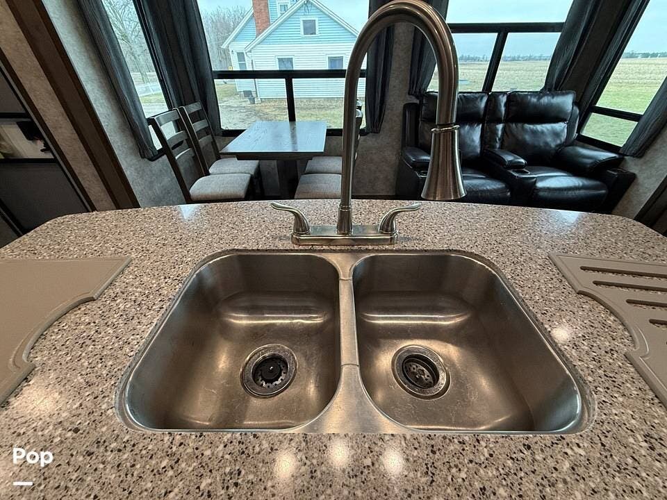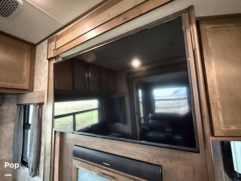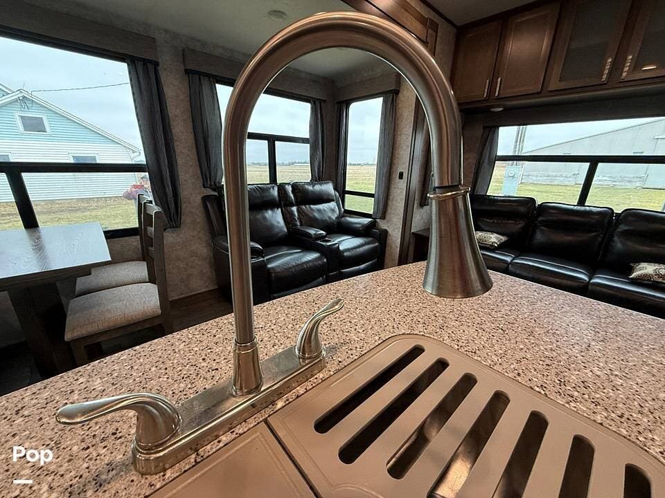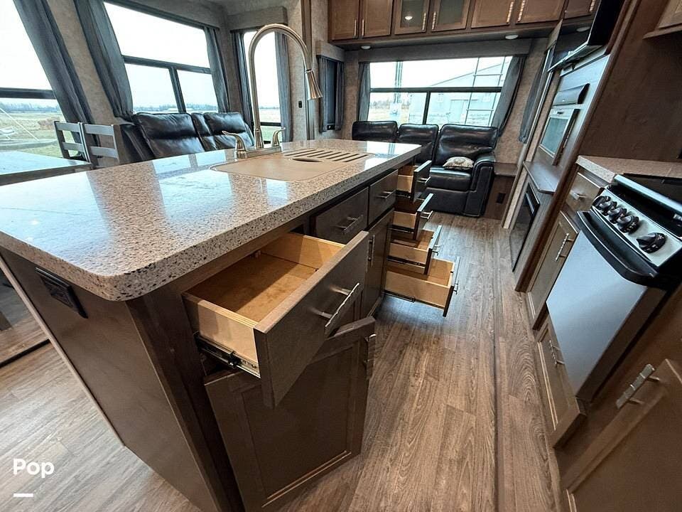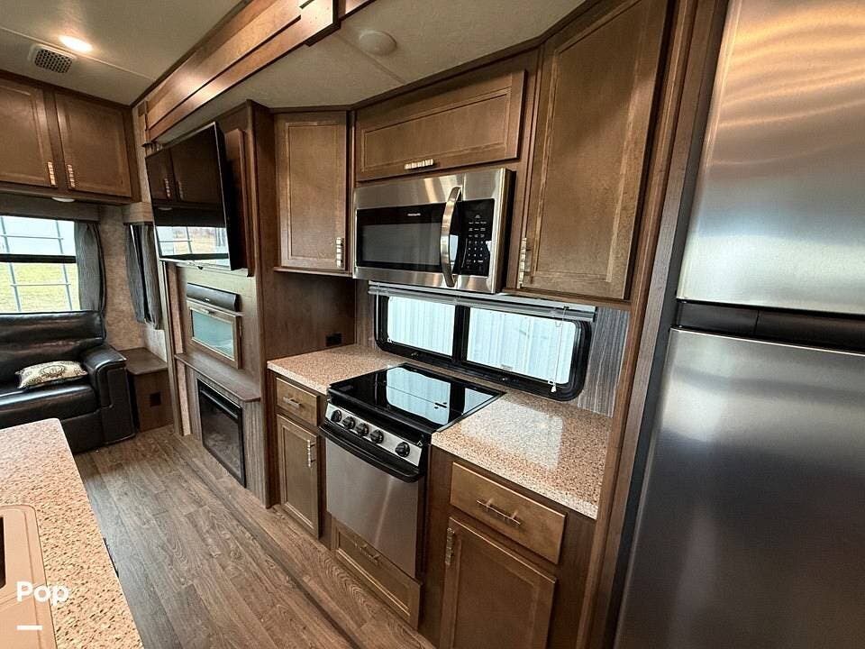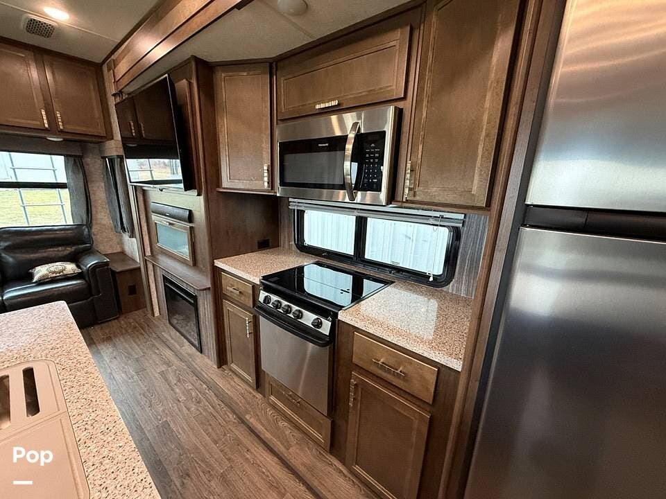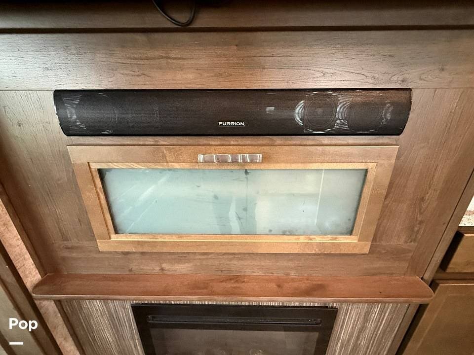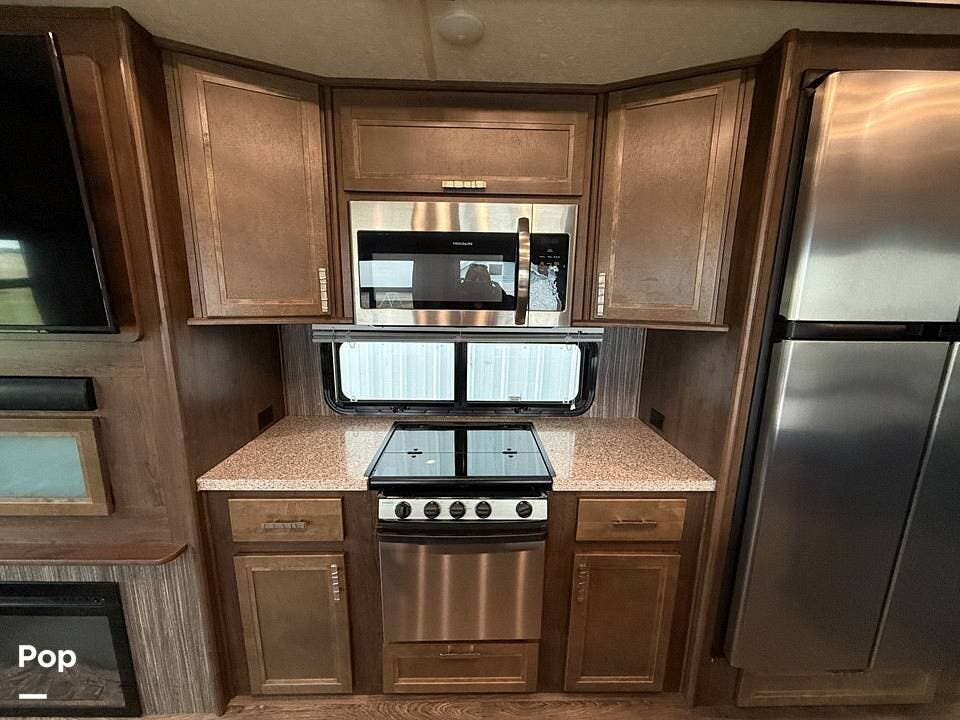 The interior of the 314RLS is designed for both entertainment and relaxation. The rear living area is anchored by a cozy fireplace and a large LED TV mounted above, flanked by windows that fill the space with natural light. Comfortable theater-style recliners, featuring heat and massage, are positioned perfectly for movie nights, along with a large sofa sleeper for guests.