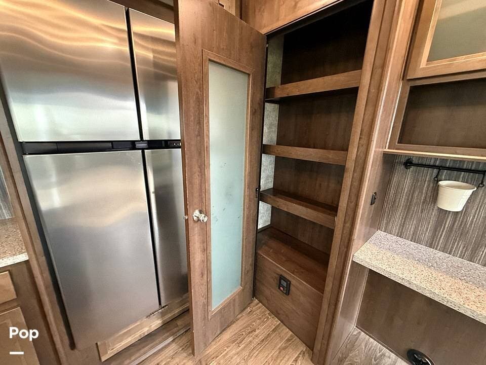 The kitchen features solid-surface countertops, a functional kitchen island for extra prep space, a large pantry, and a residential-sized electric or gas refrigerator. The free-standing dinette provides a comfortable spot for dining or working, featuring a table and chairs that add a touch of residential luxury.
