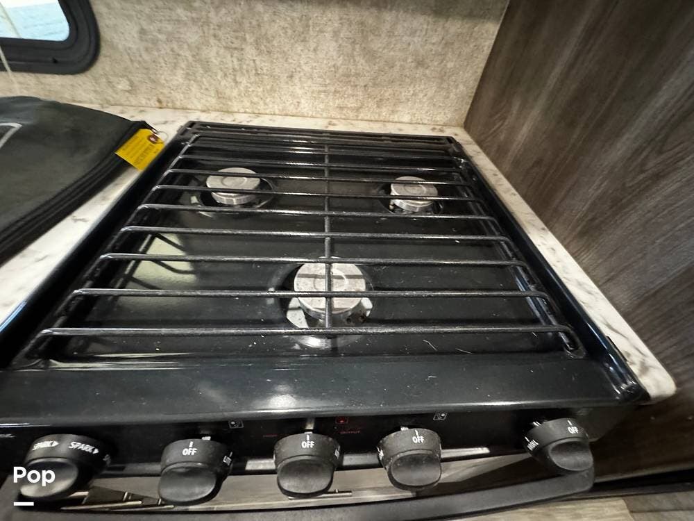 The kitchen has a three-burner stovetop, oven, fridge, freezer, and microwave for full kitchen functionality.