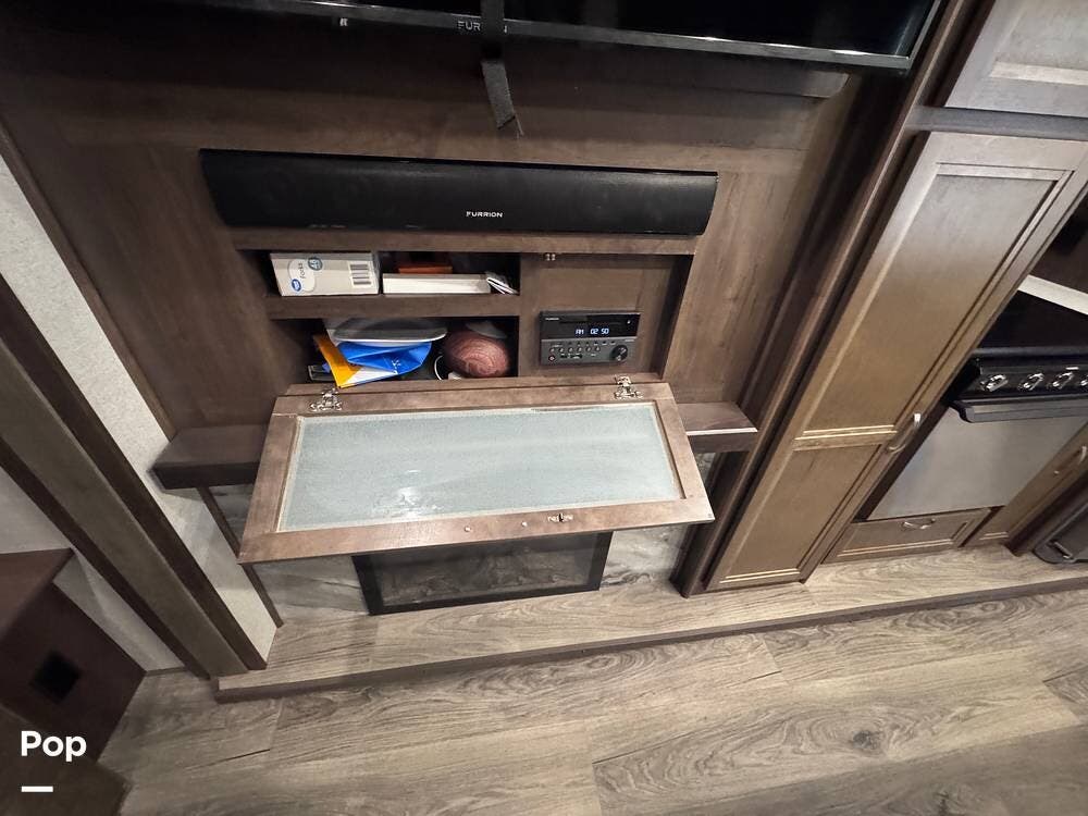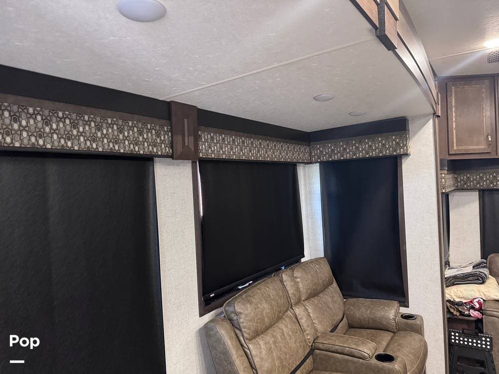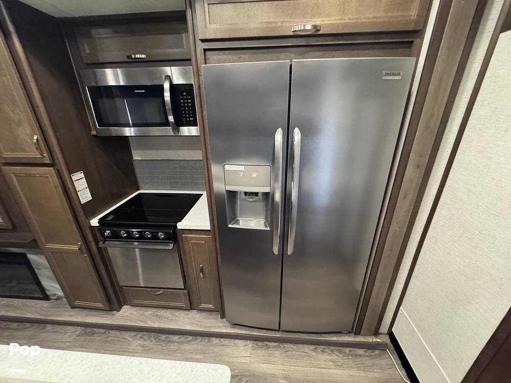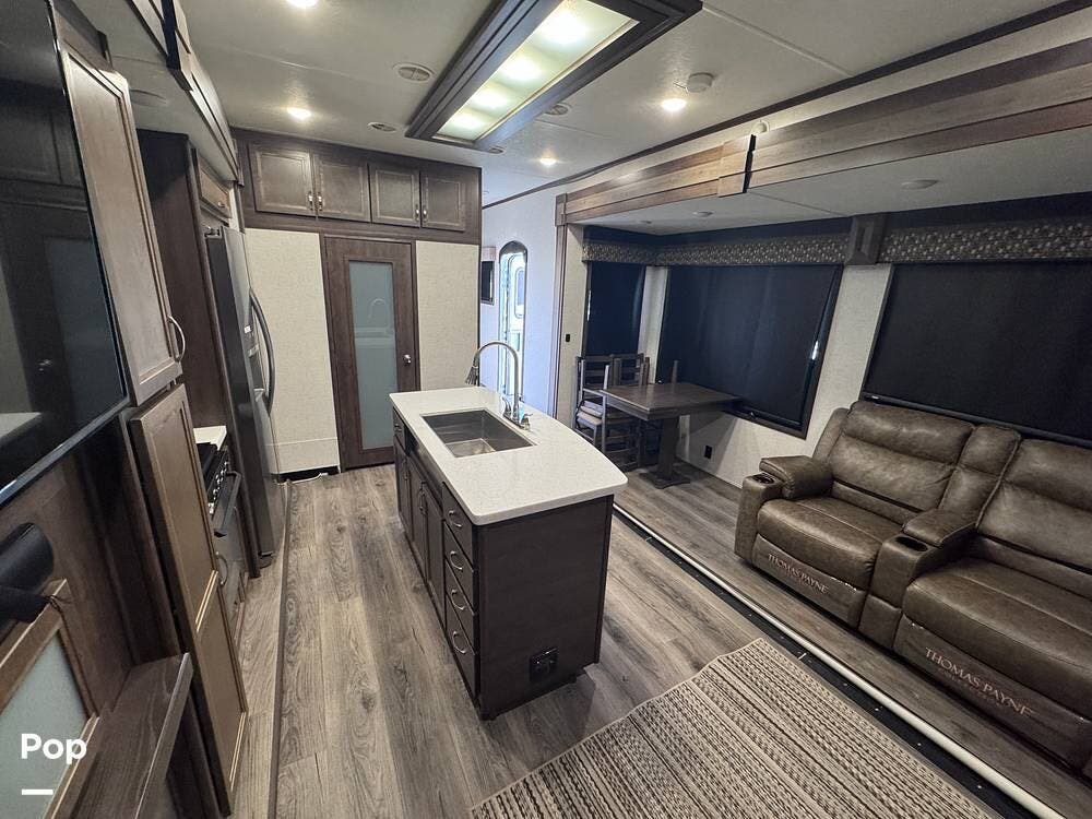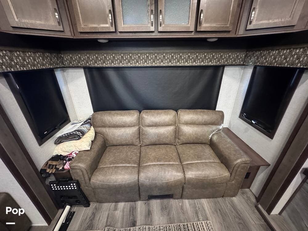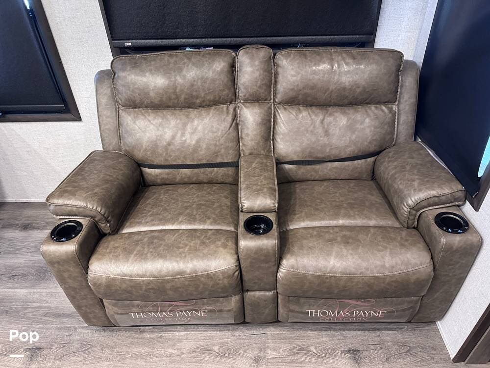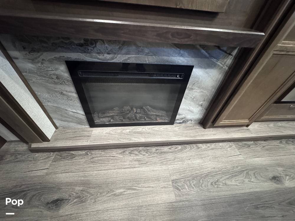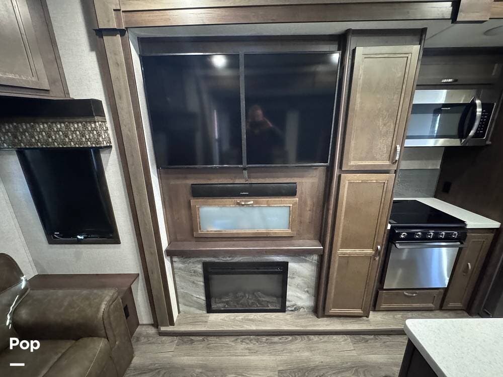 This RV boasts stunning amenities inside, including an electric fireplace, cozy stadium recliners, and convenient washer/dryer prep.