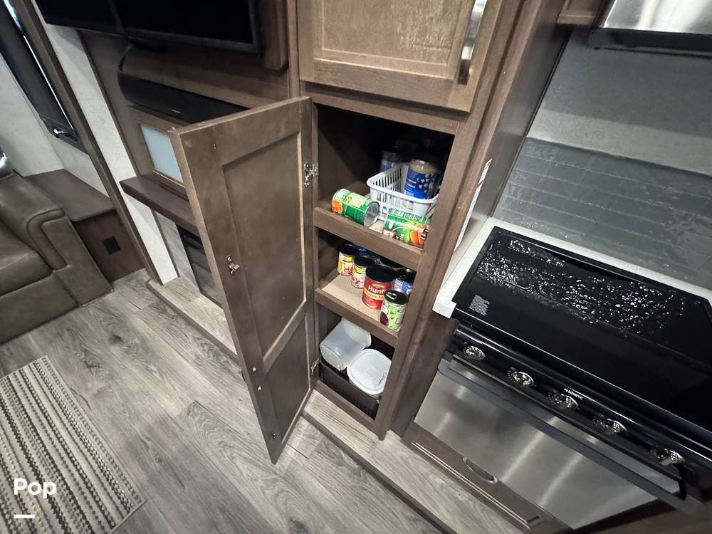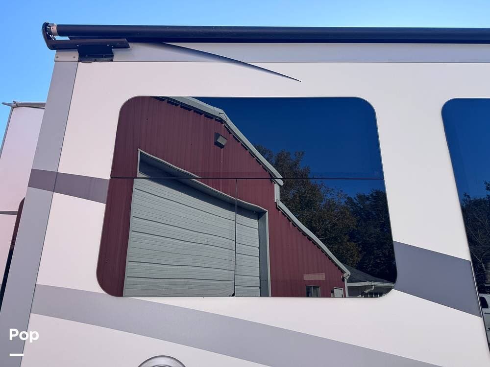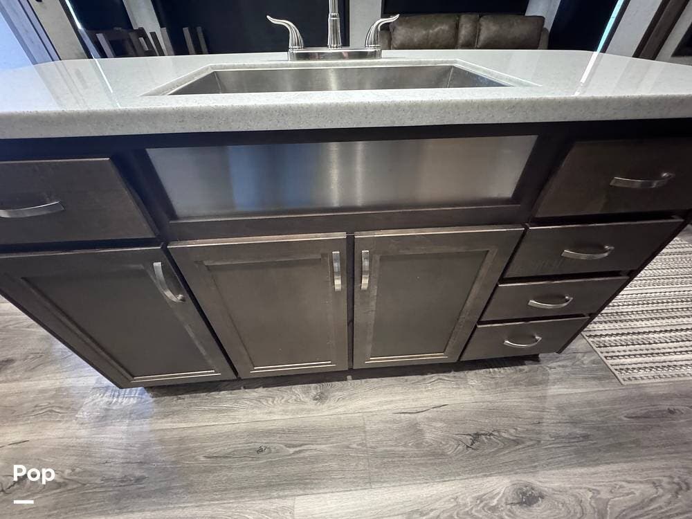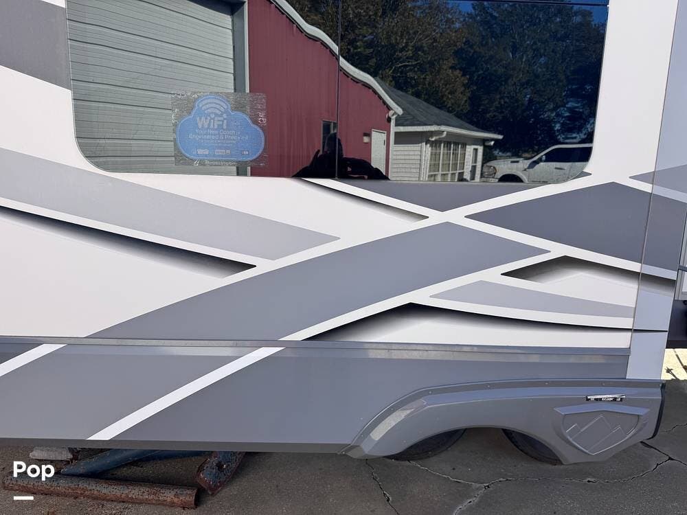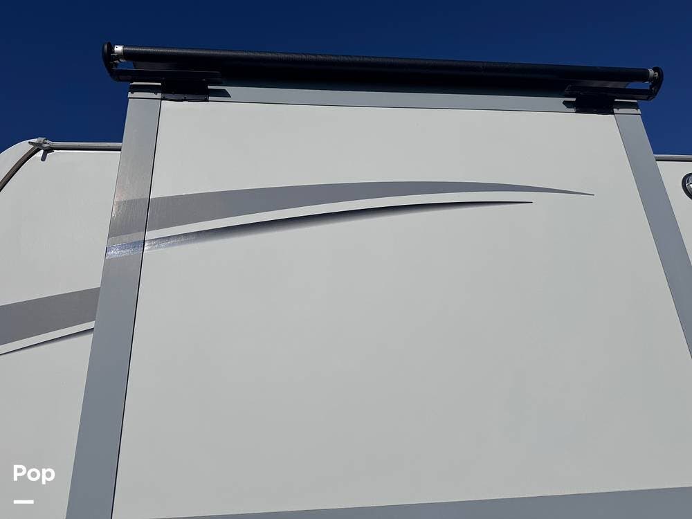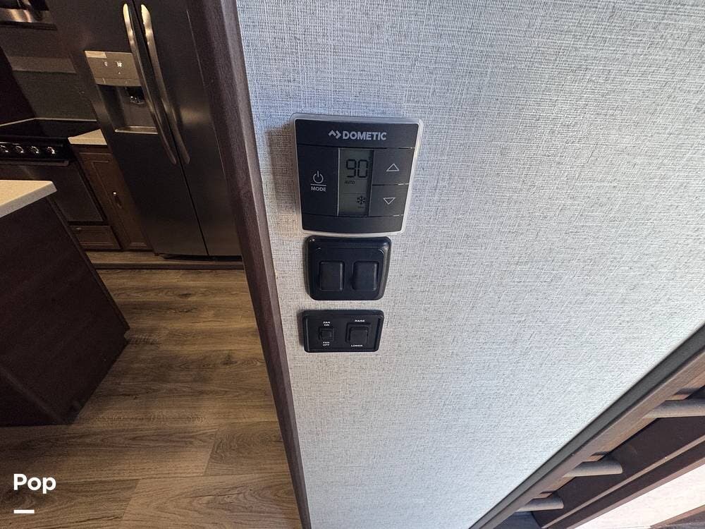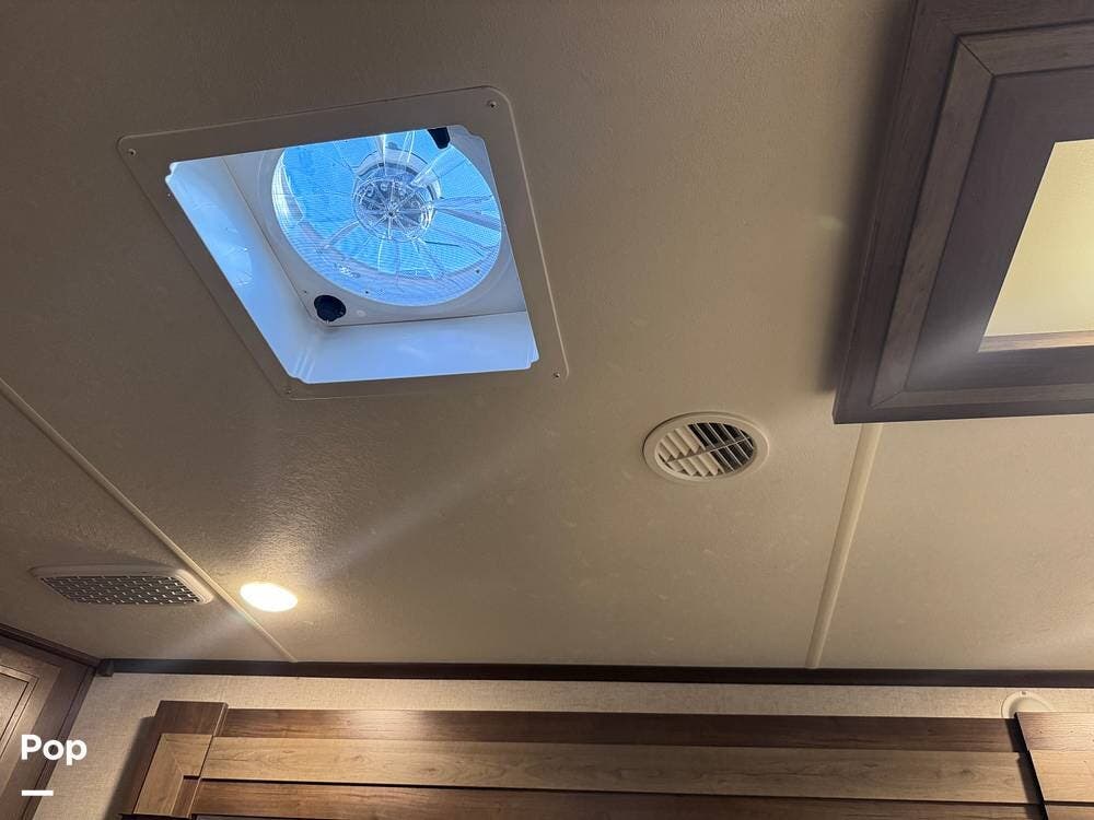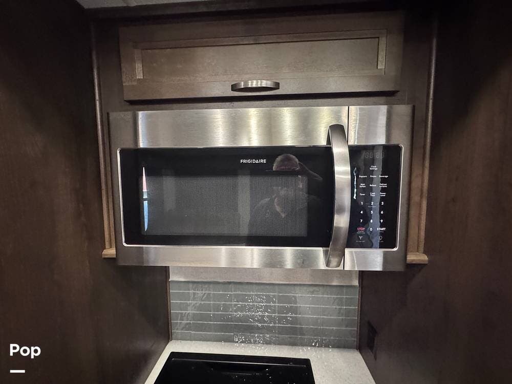 This RV boasts stunning amenities inside, including an electric fireplace, cozy stadium recliners, and convenient washer/dryer prep.