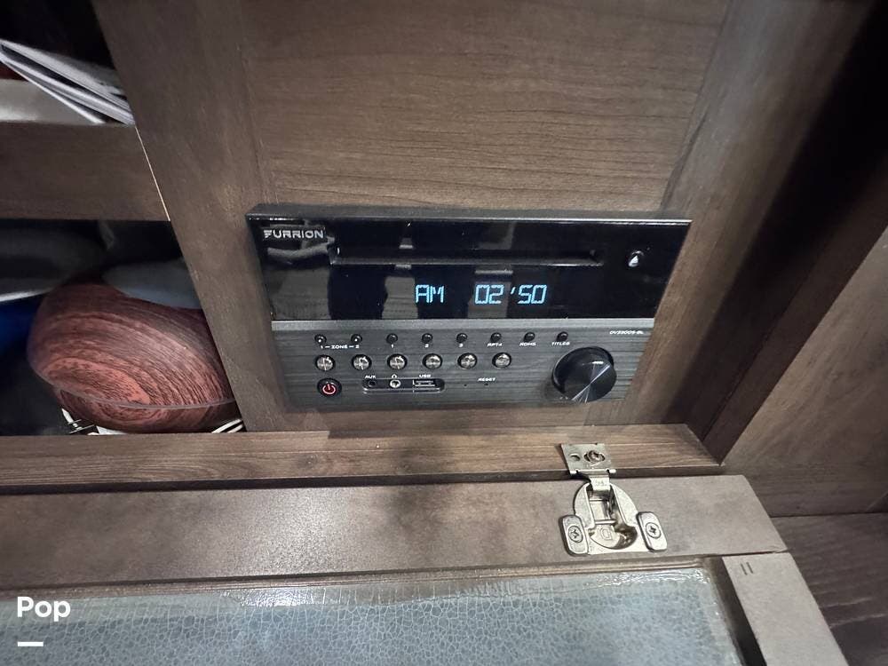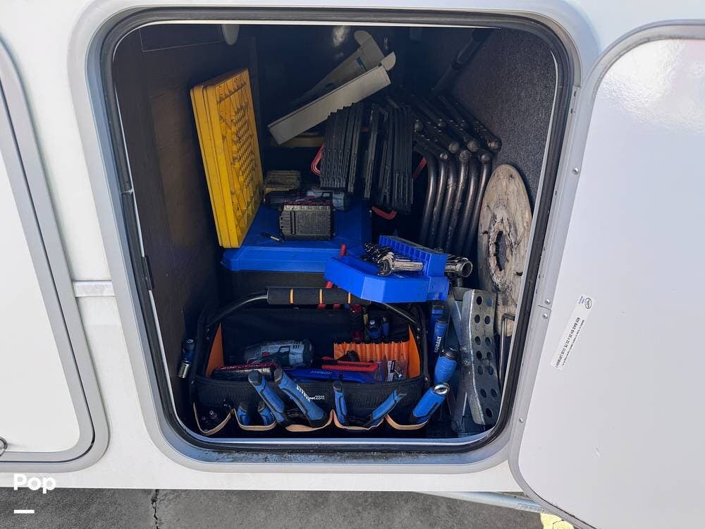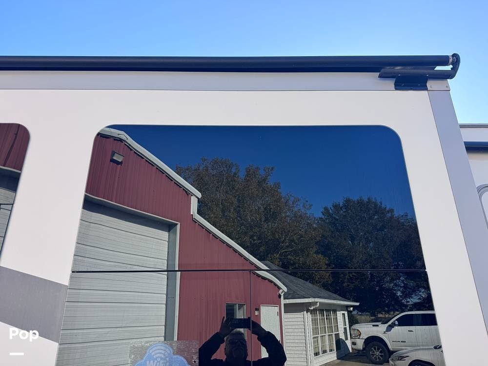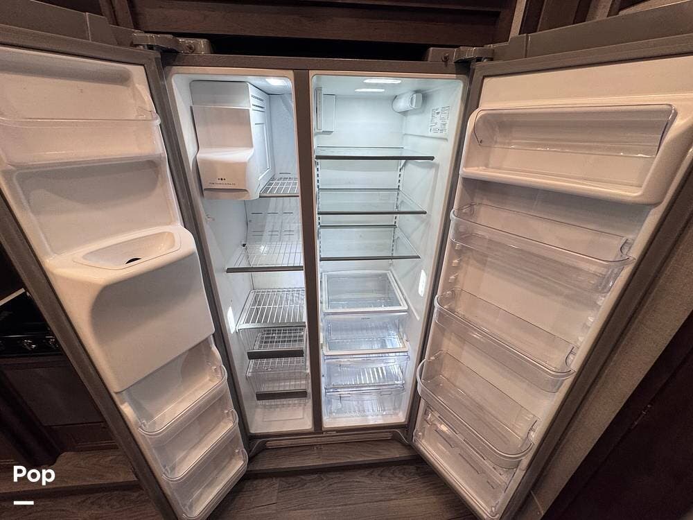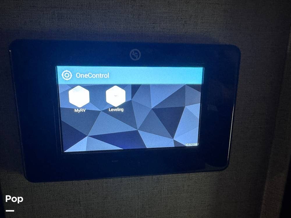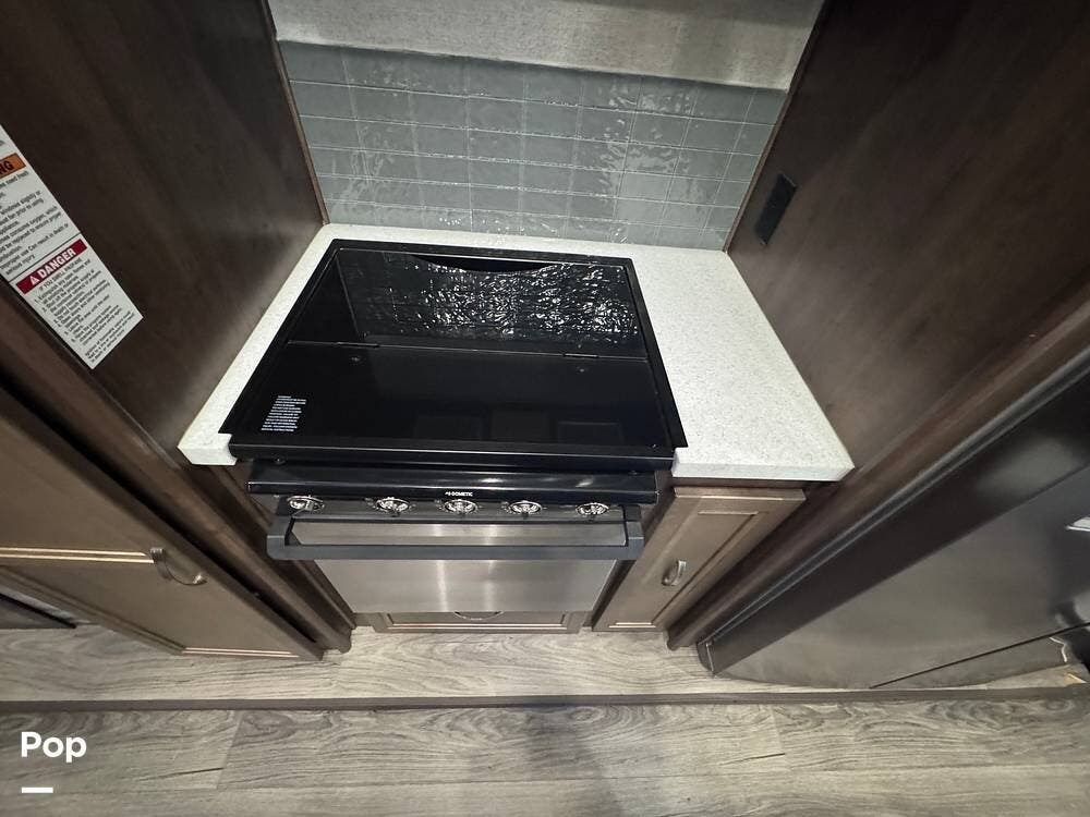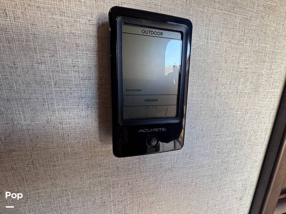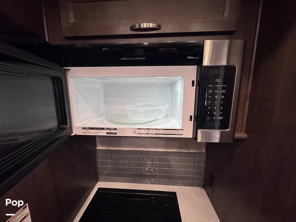 This RV boasts stunning amenities inside, including an electric fireplace, cozy stadium recliners, and convenient washer/dryer prep.