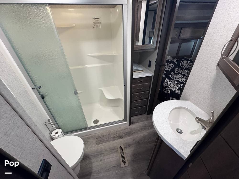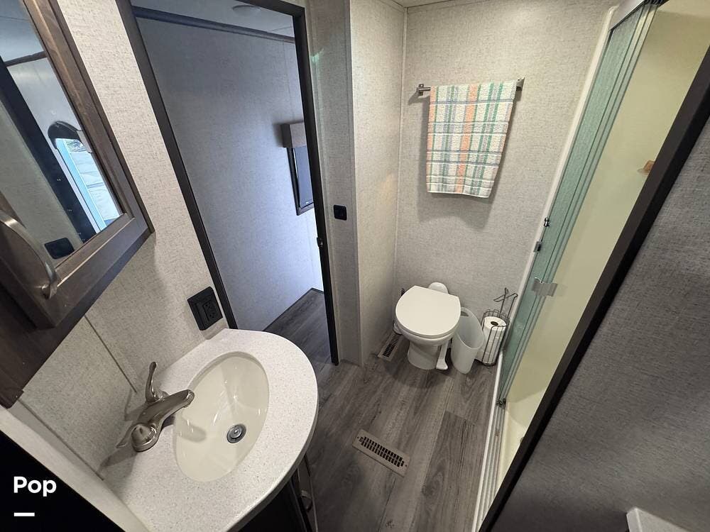 The full bathroom includes a large shower, sink, medicine cabinet, and private access to the master bedroom. With window blinds for privacy and plenty of storage throughout, this Open Range is perfect for family adventures or full-time RV living.