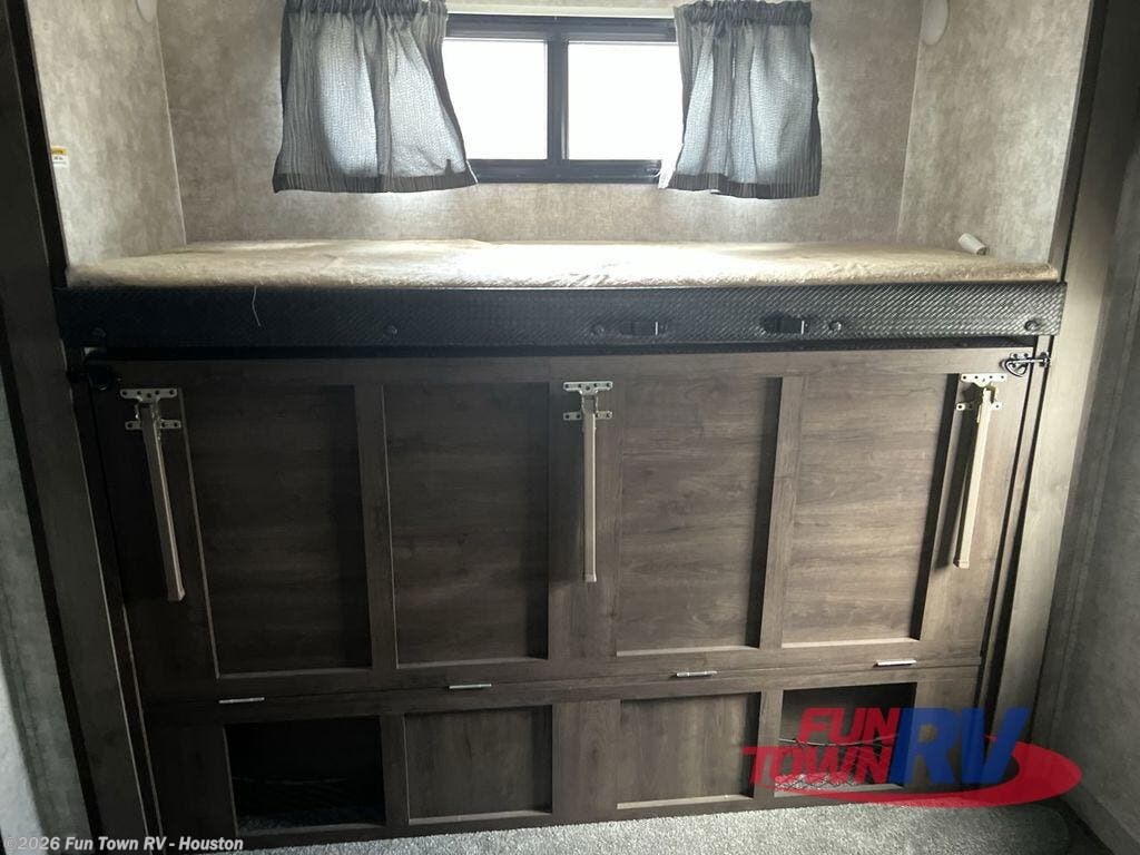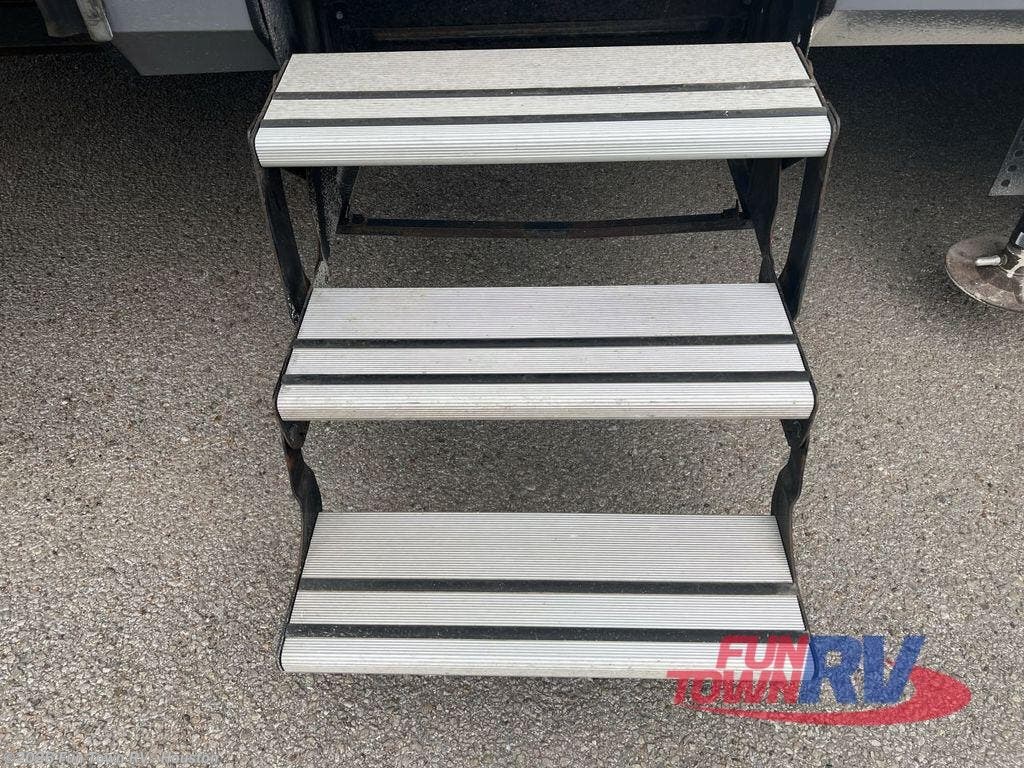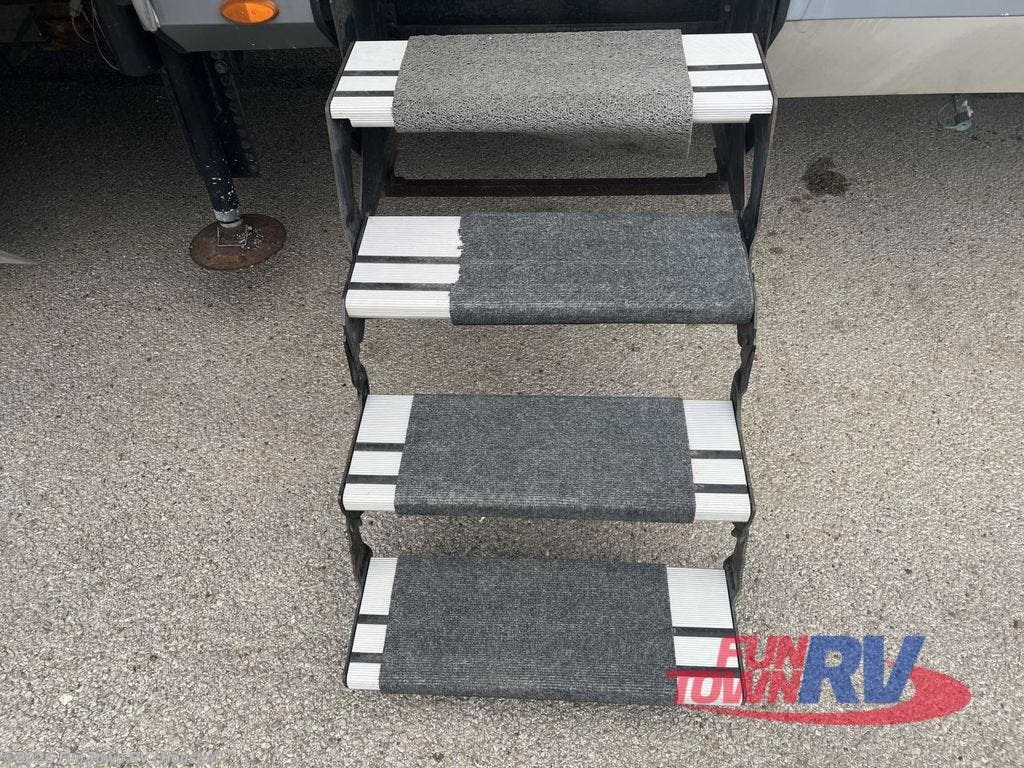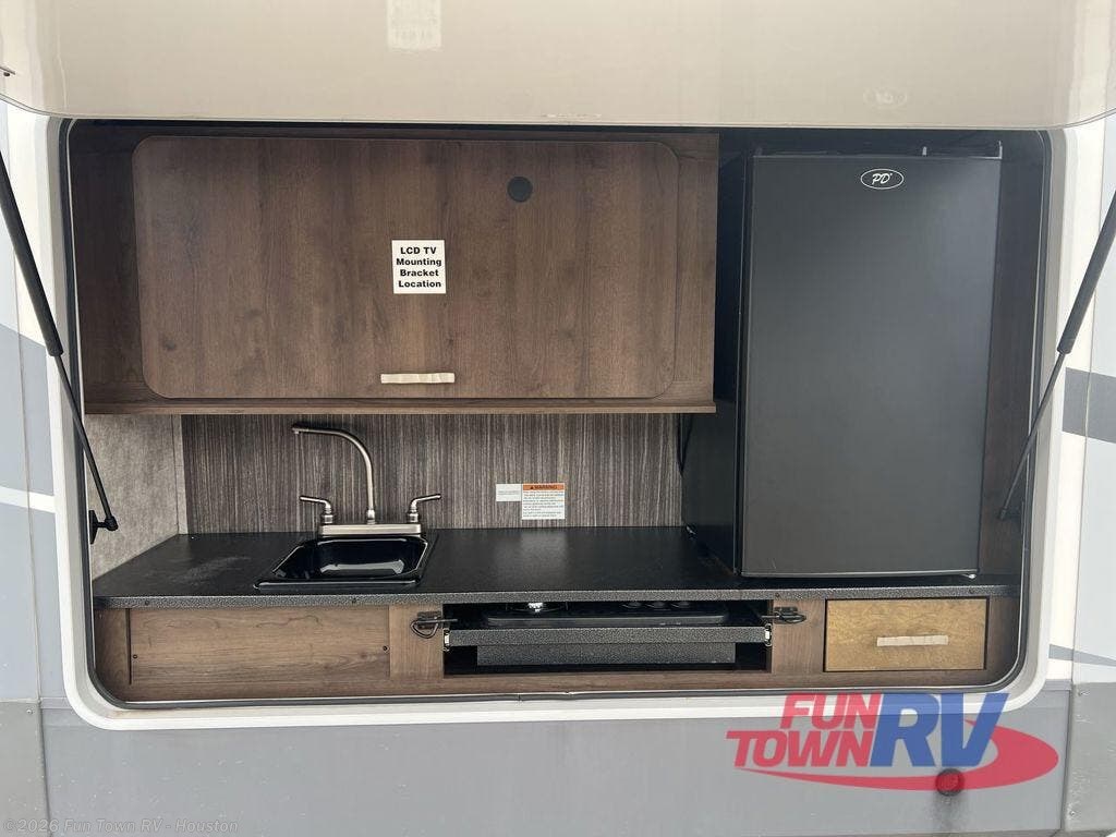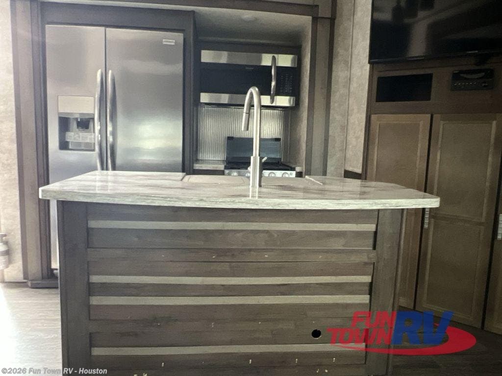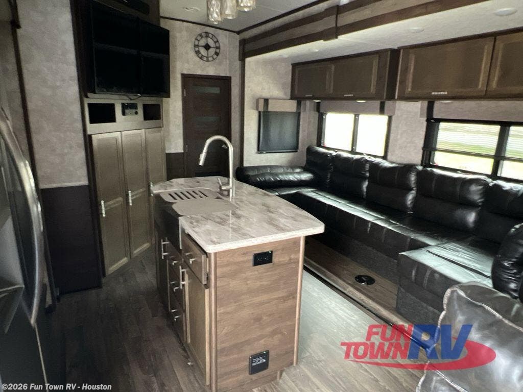 Envision all of the floor space you will enjoy thanks to the separate bunkhouse with a half bath and dual slides, and your own master suite with dual access to the full bathroom and a slide out queen bed, plus a kitchen and living area with two slide outs. Now imagine you are camping at your favorite state park with your family. You can make a meal on the outside kitchen while watching the kids run around the campsite, or cook inside will all the appliances provided including a kitchen island for convenience. You might even decide to take a break while sitting on one of the two chairs or reclining in the theater seats with heat and massage features. From five total slides, two exterior entry doors, and loads of storage, you will lack nothing in this fifth wheel!