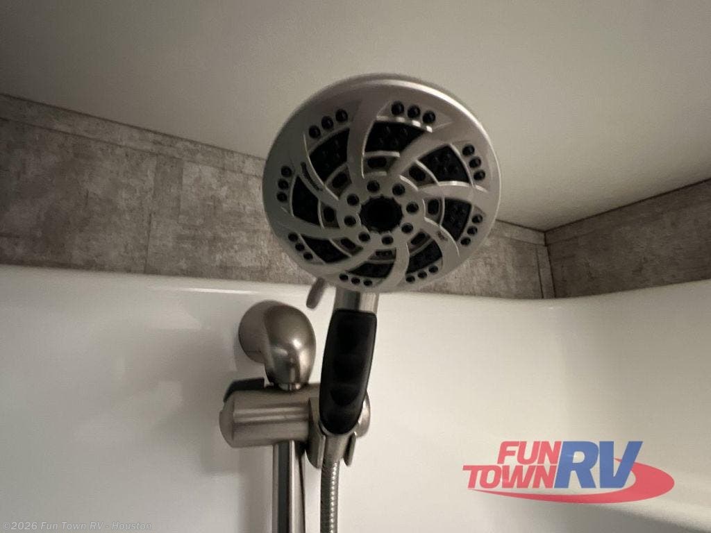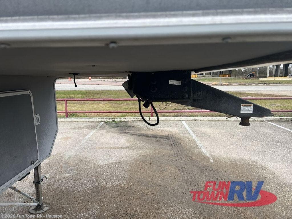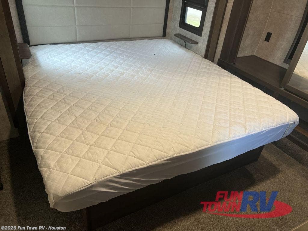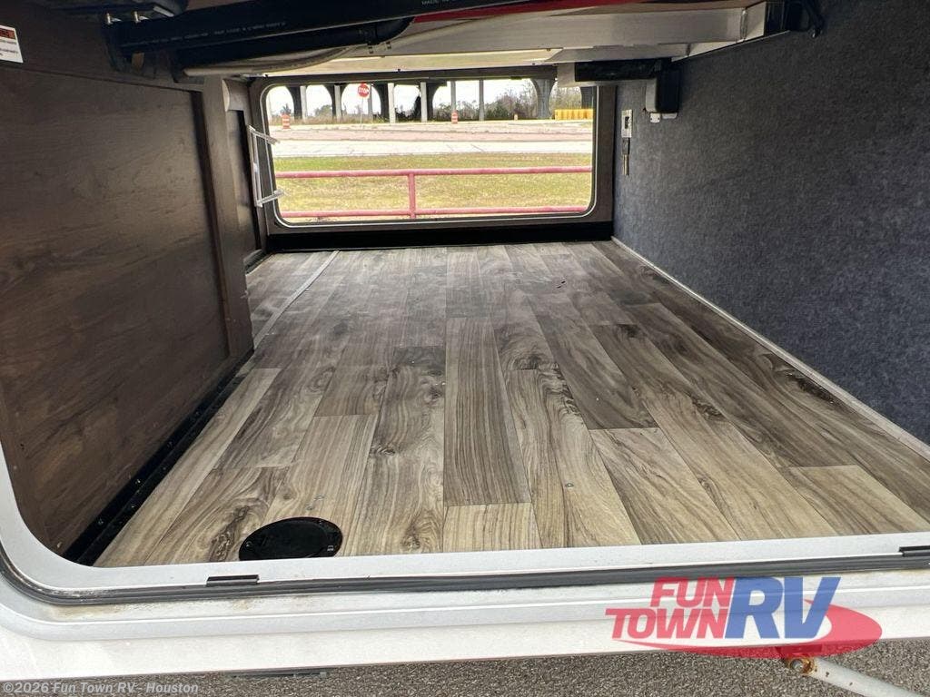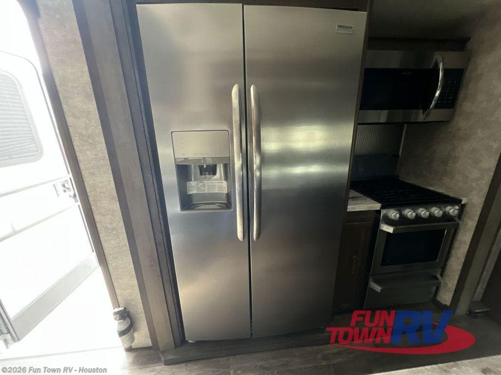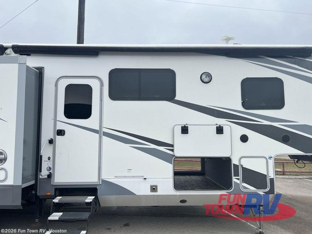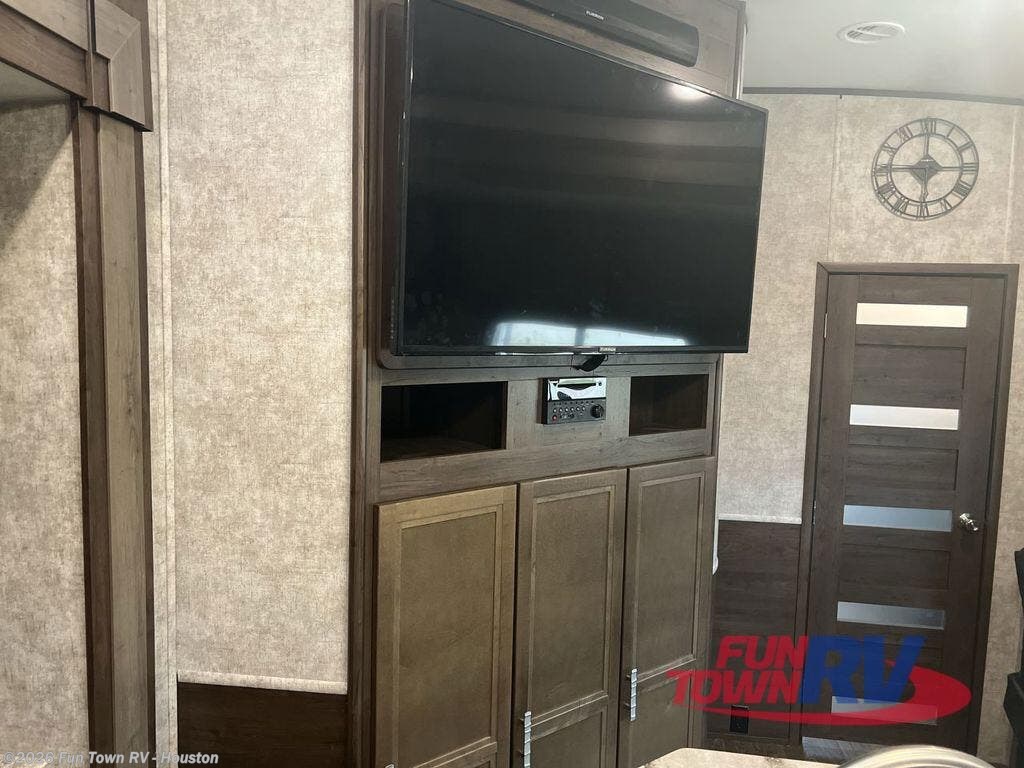 Envision all of the floor space you will enjoy thanks to the separate bunkhouse with a half bath and dual slides, and your own master suite with dual access to the full bathroom and a slide out queen bed, plus a kitchen and living area with two slide outs. Now imagine you are camping at your favorite state park with your family. You can make a meal on the outside kitchen while watching the kids run around the campsite, or cook inside will all the appliances provided including a kitchen island for convenience. You might even decide to take a break while sitting on one of the two chairs or reclining in the theater seats with heat and massage features. From five total slides, two exterior entry doors, and loads of storage, you will lack nothing in this fifth wheel!