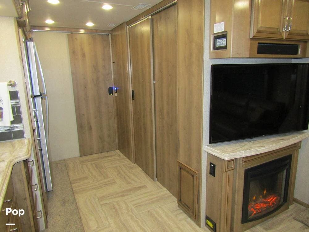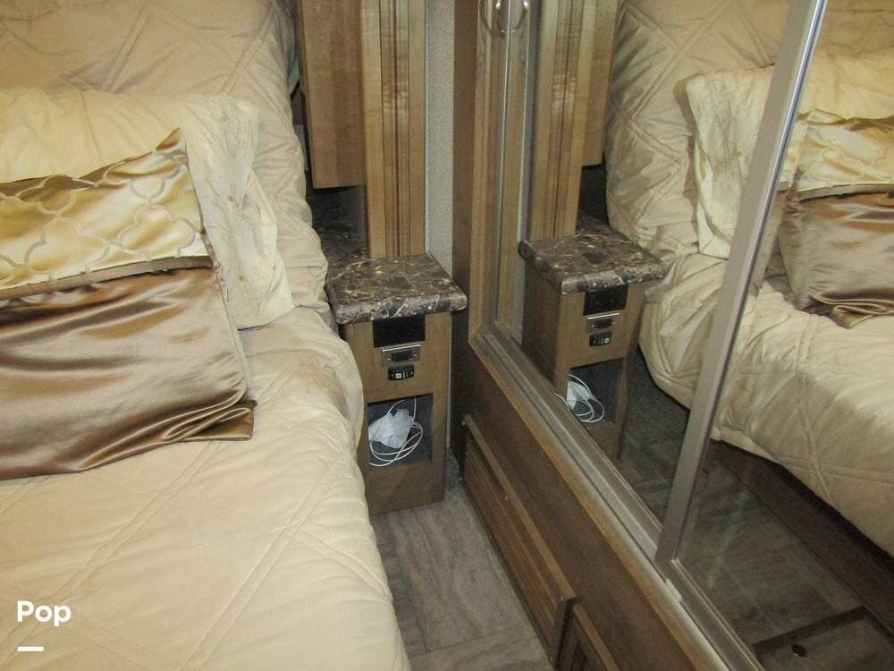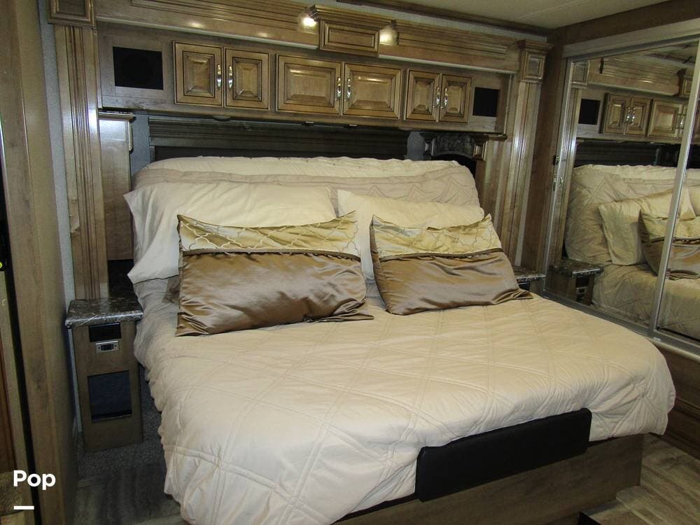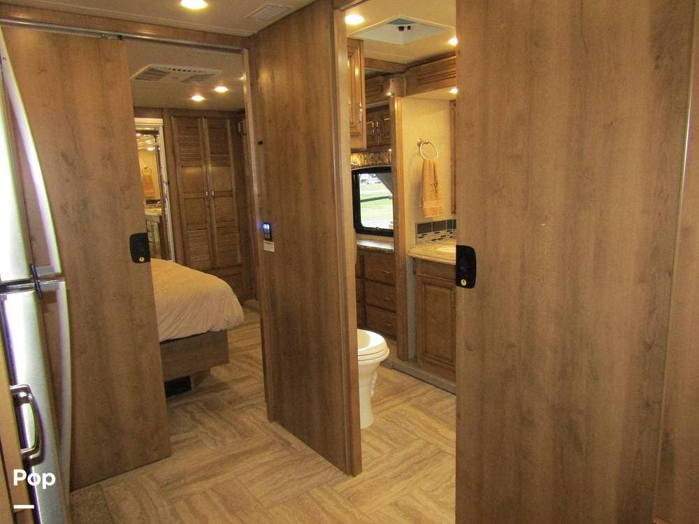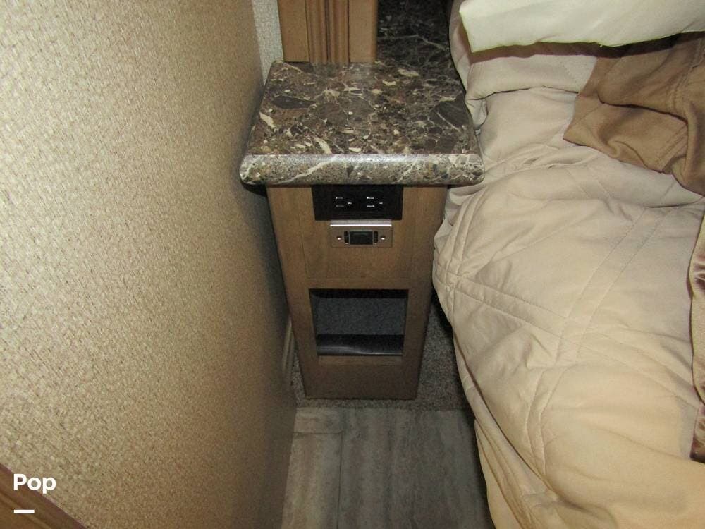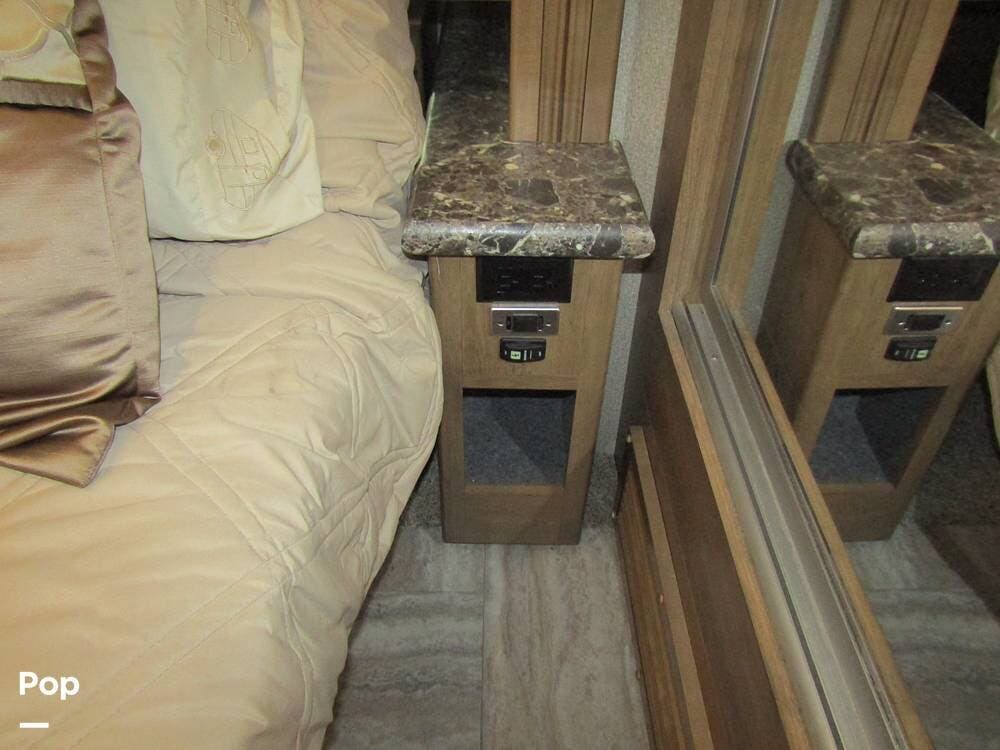 There is a filtered water system, solid countertops, a convection microwave, a residential refrigerator with an ice maker, dual A/Cs, and master sleeping quarters with a powered king-size bed and dual bathroom access!