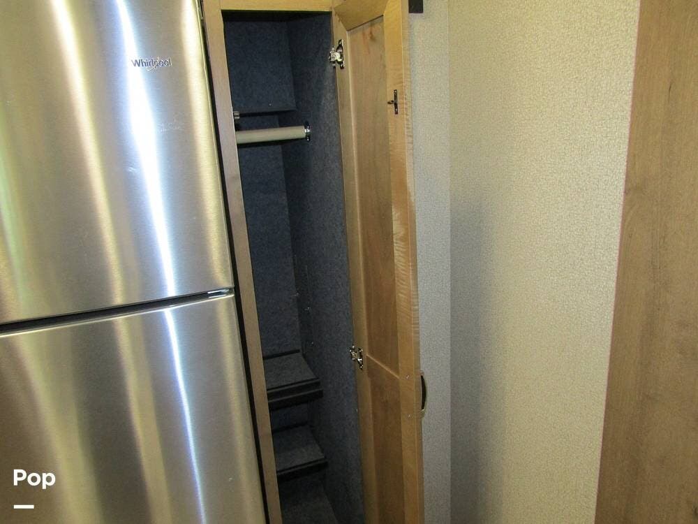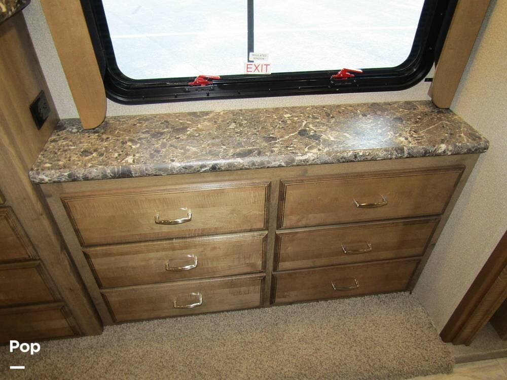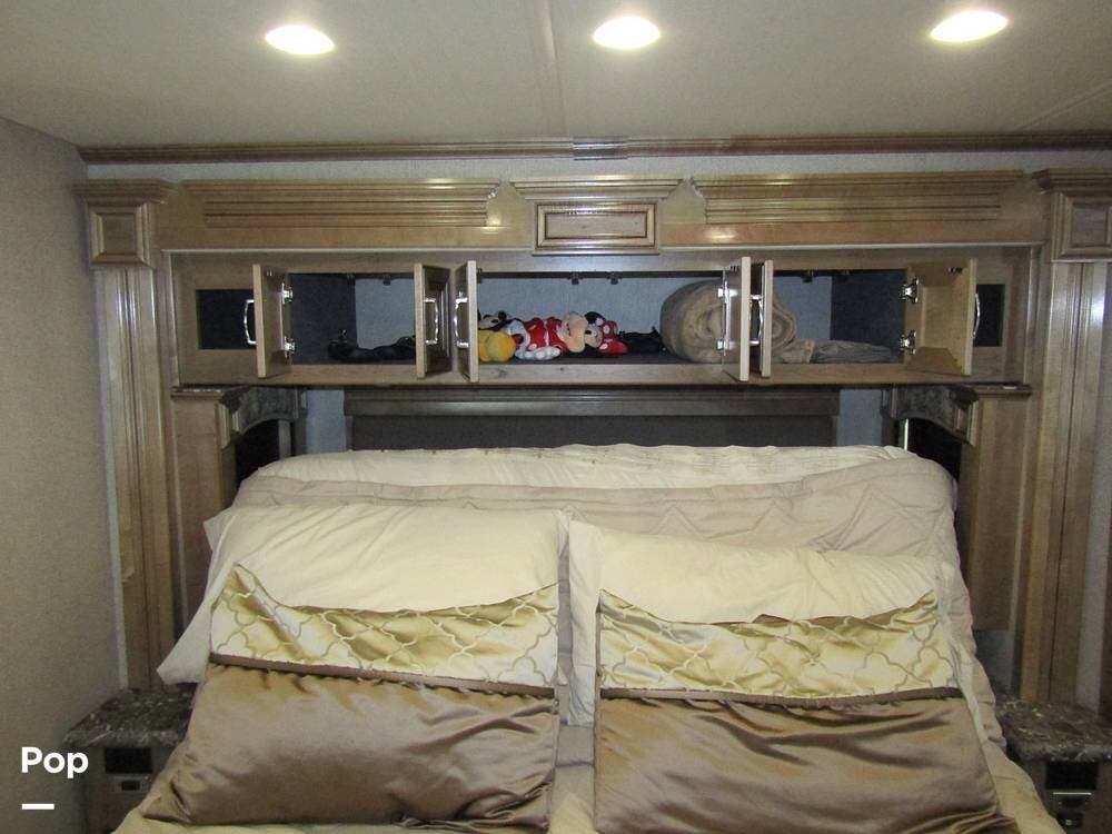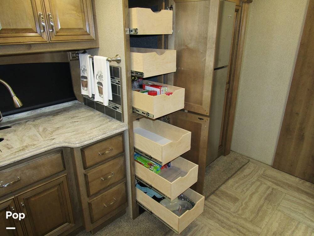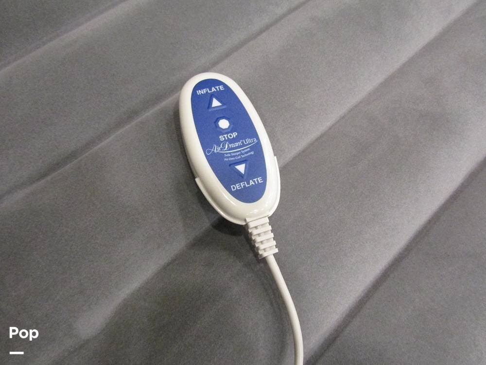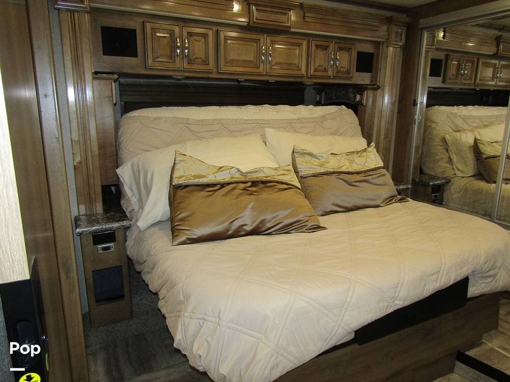 There is a filtered water system, solid countertops, a convection microwave, a residential refrigerator with an ice maker, dual A/Cs, and master sleeping quarters with a powered king-size bed and dual bathroom access!