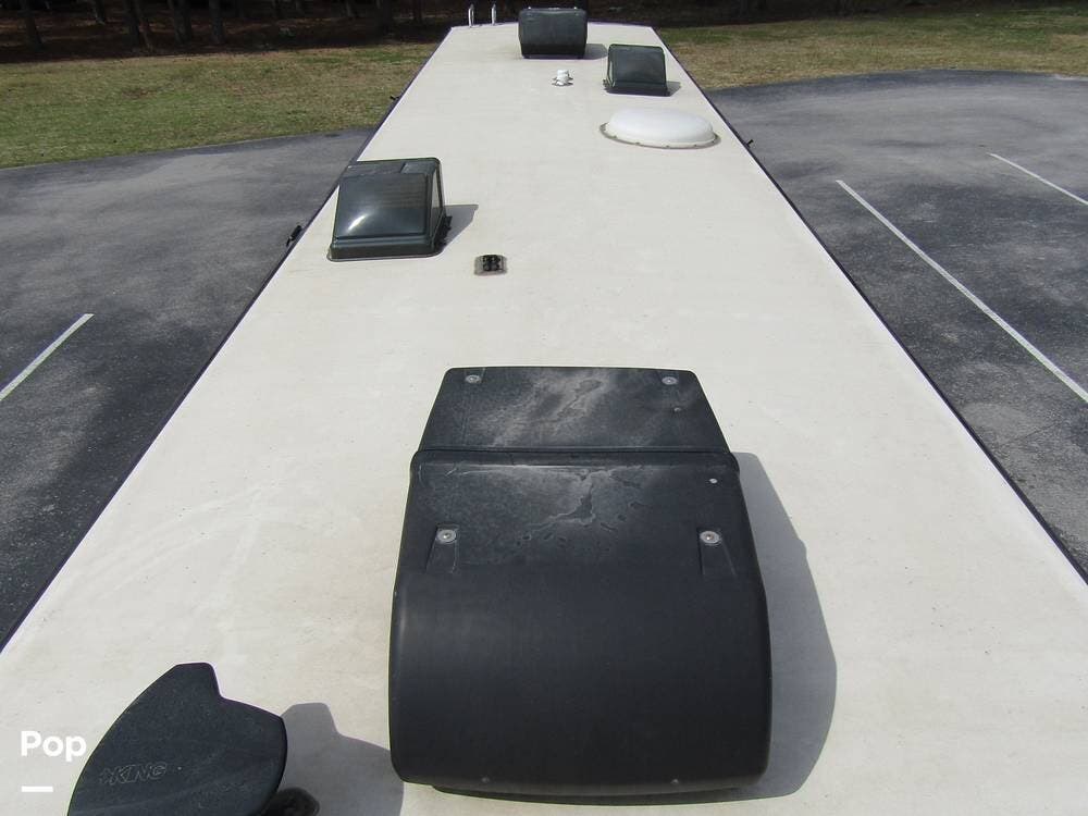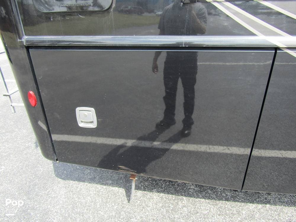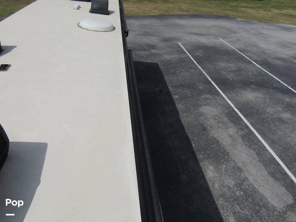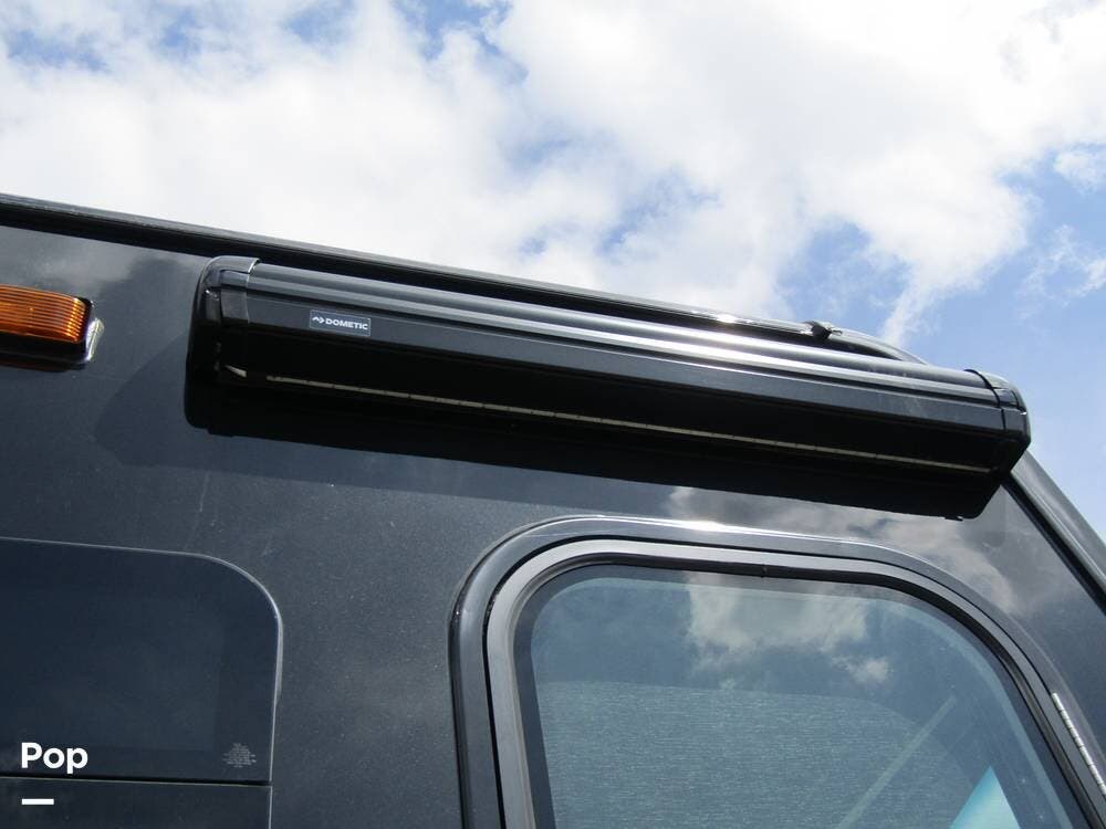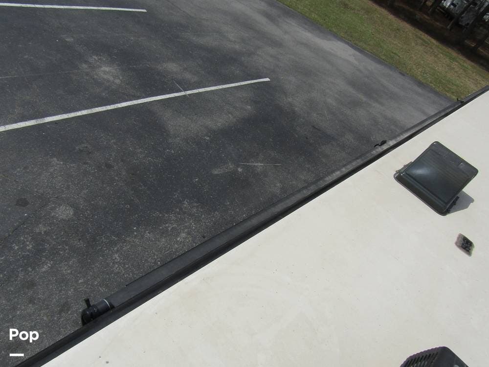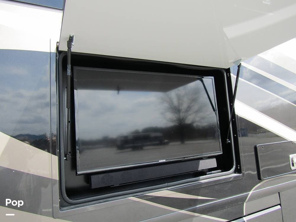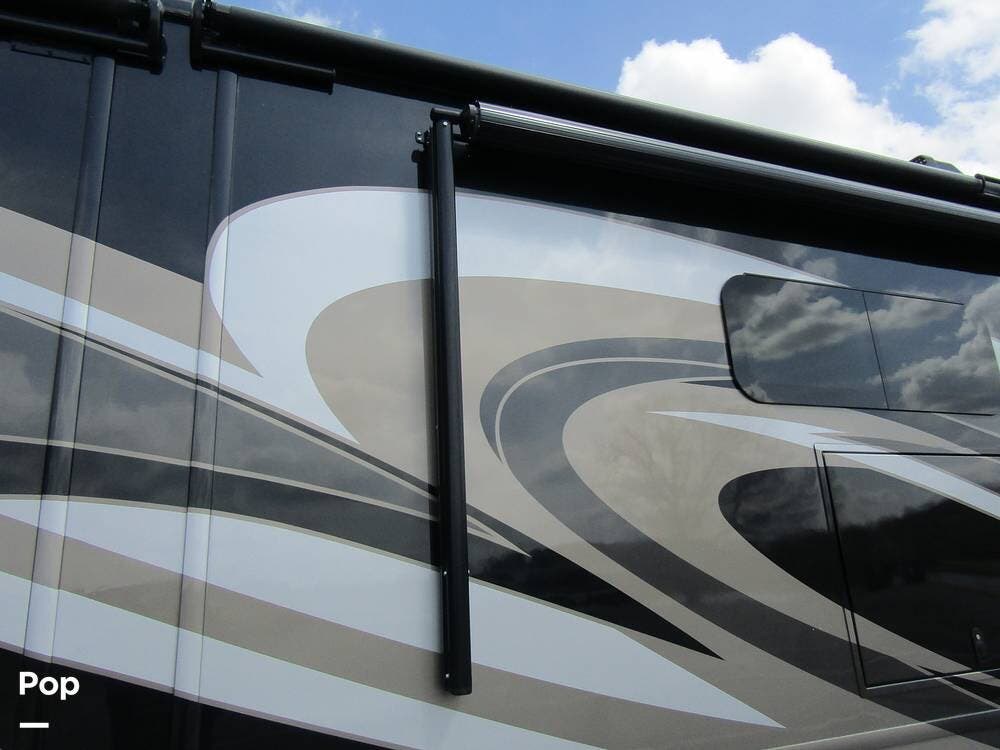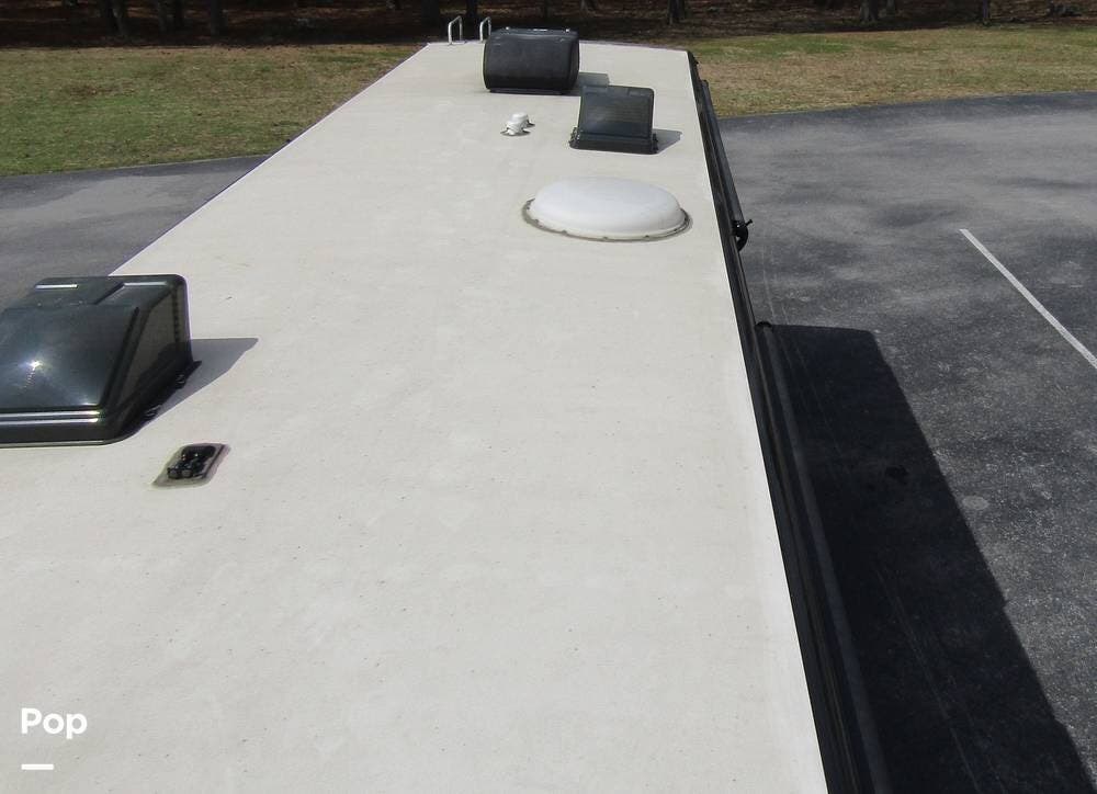 Outside, she has full-body paint, a full-size power patio awning, protective slide-topper awnings, driver's side manual window awnings, an exterior flat panel TV, an exterior shower, an auto-aim "King Tailgater" satellite antenna, rear and side-view cameras, and a two-piece roof access ladder.