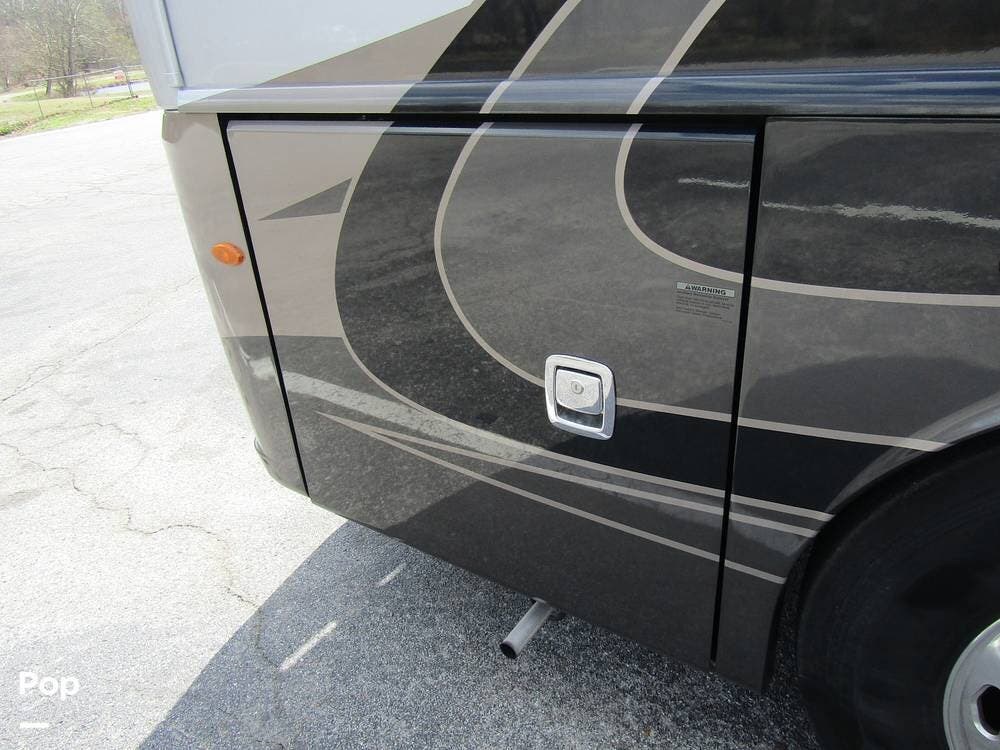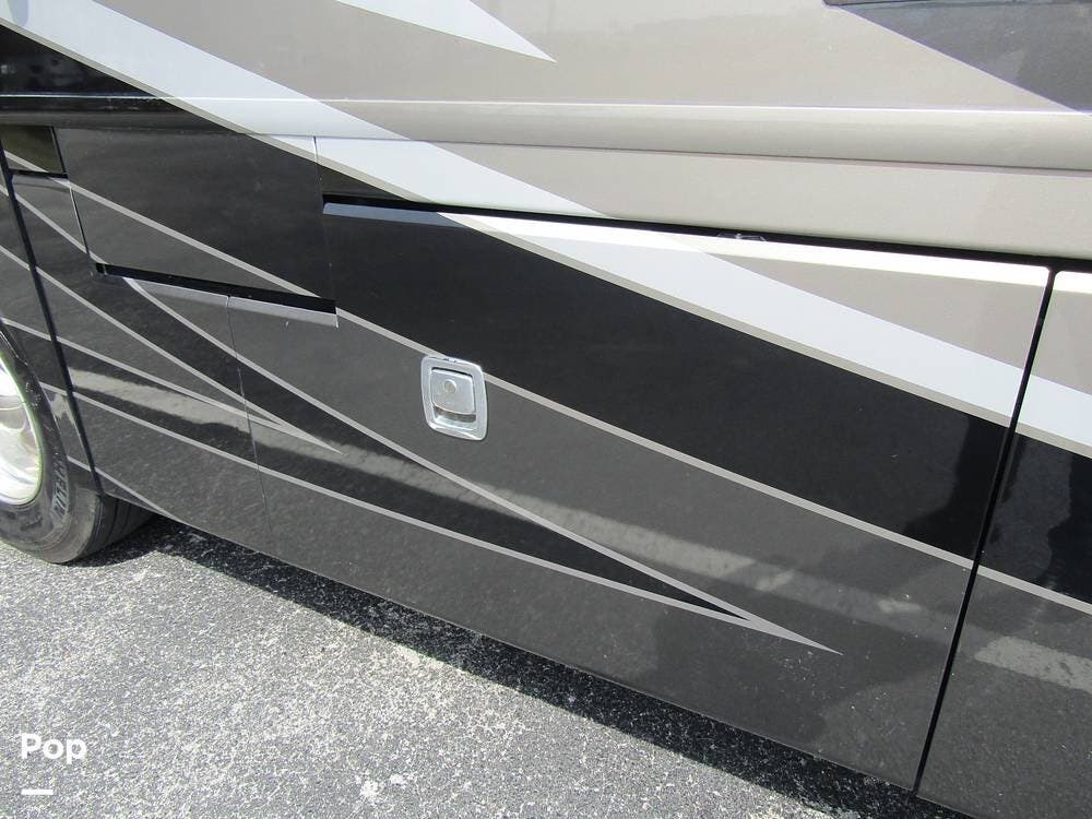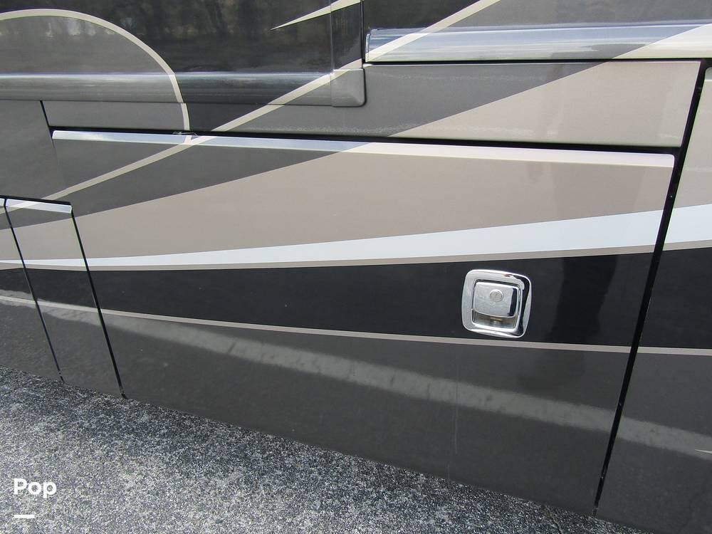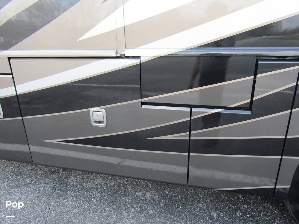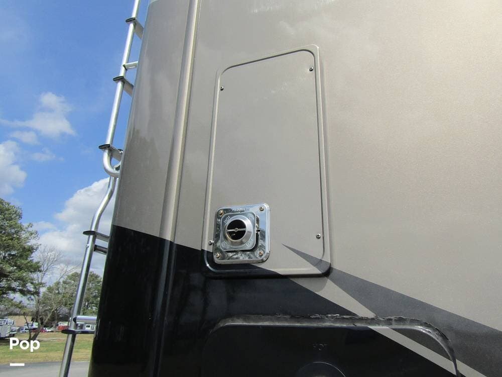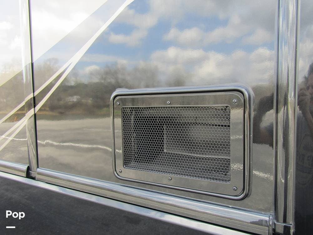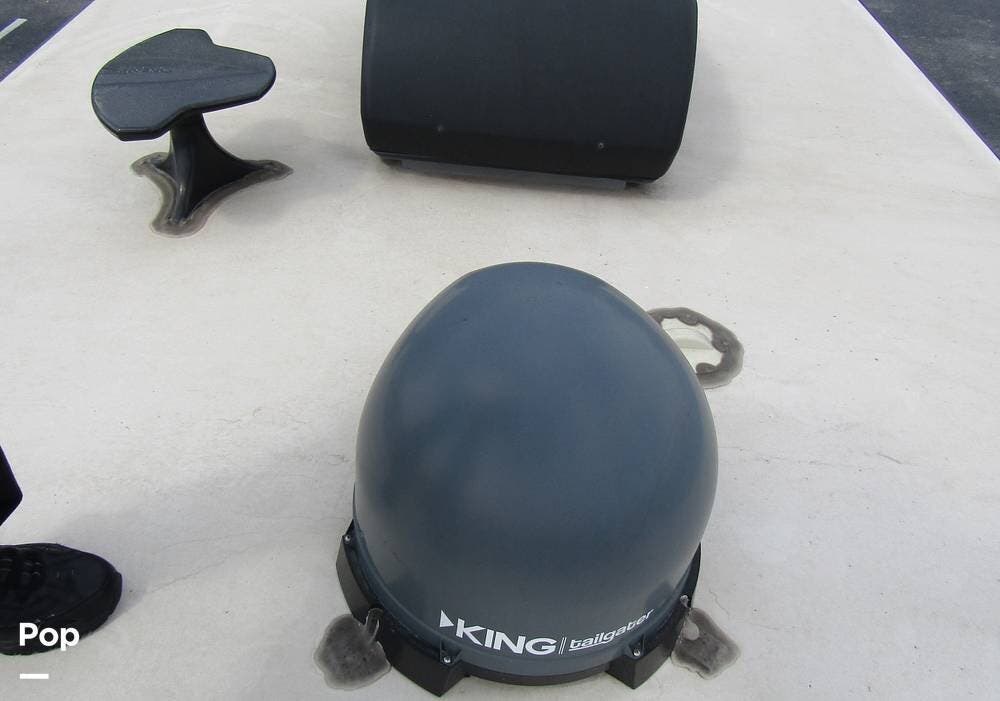 Outside, she has full-body paint, a full-size power patio awning, protective slide-topper awnings, driver's side manual window awnings, an exterior flat panel TV, an exterior shower, an auto-aim "King Tailgater" satellite antenna, rear and side-view cameras, and a two-piece roof access ladder.