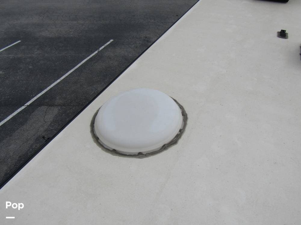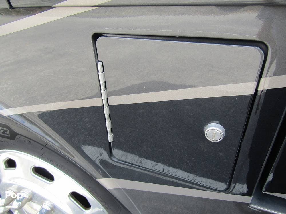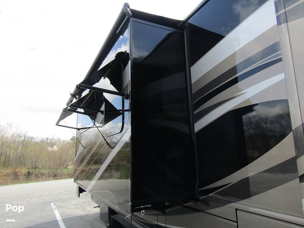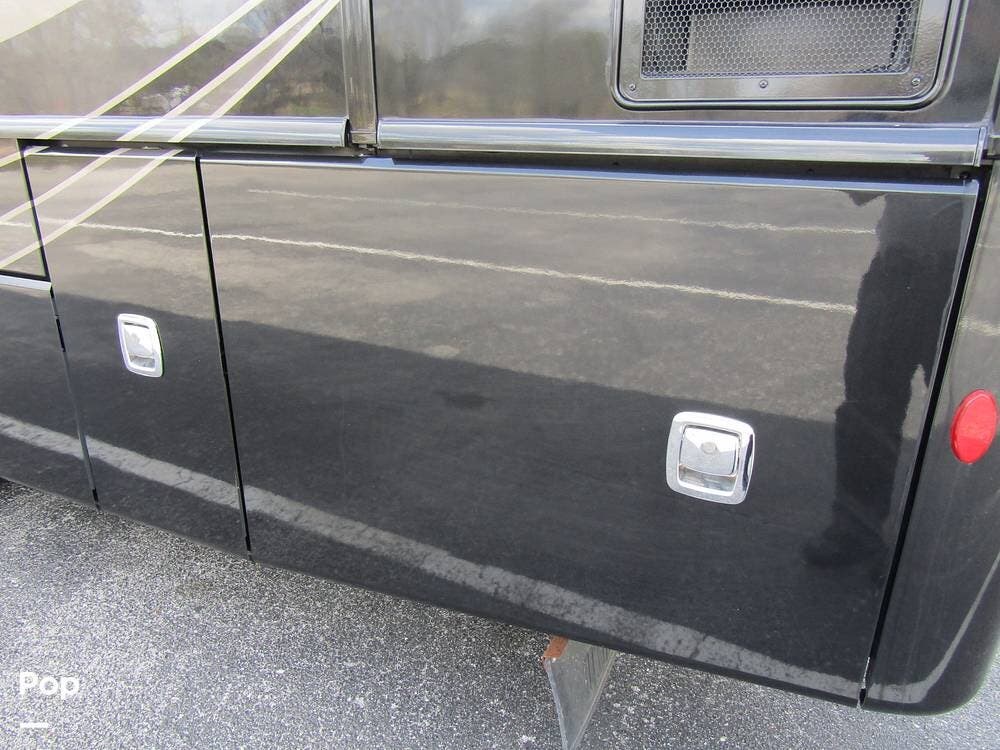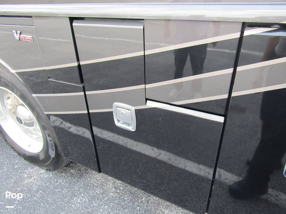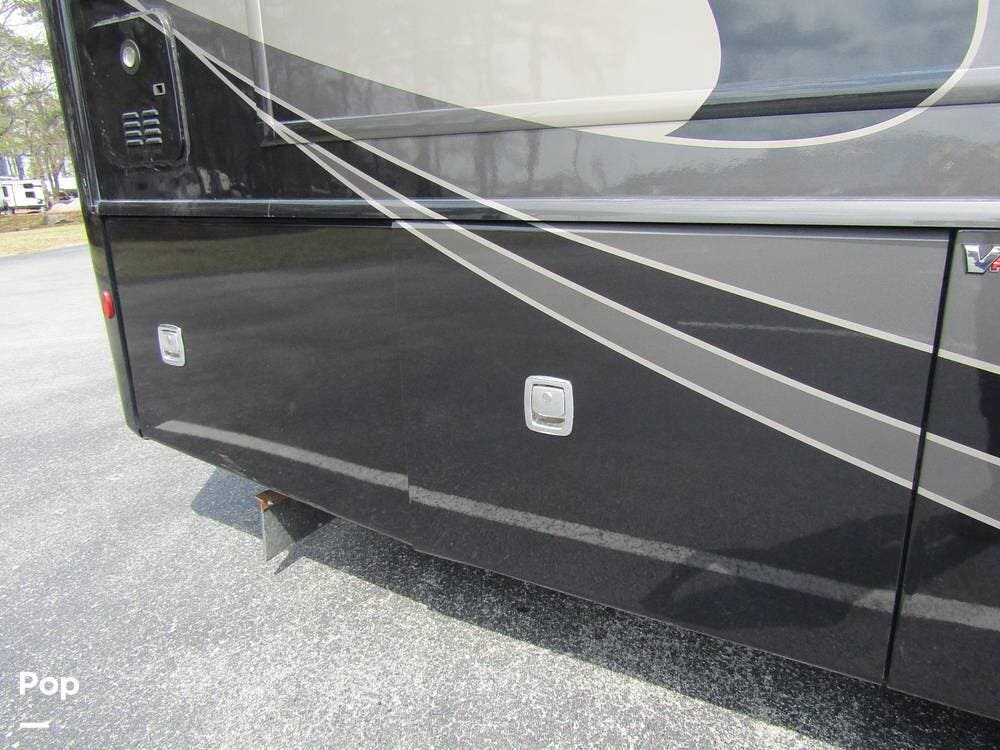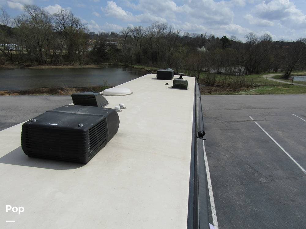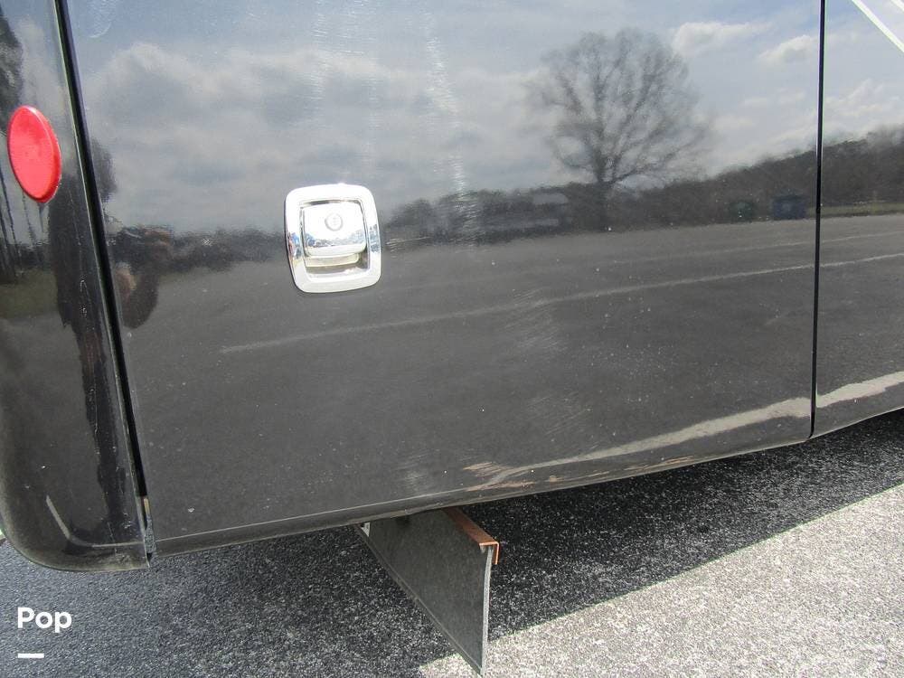 Outside, she has full-body paint, a full-size power patio awning, protective slide-topper awnings, driver's side manual window awnings, an exterior flat panel TV, an exterior shower, an auto-aim "King Tailgater" satellite antenna, rear and side-view cameras, and a two-piece roof access ladder.
