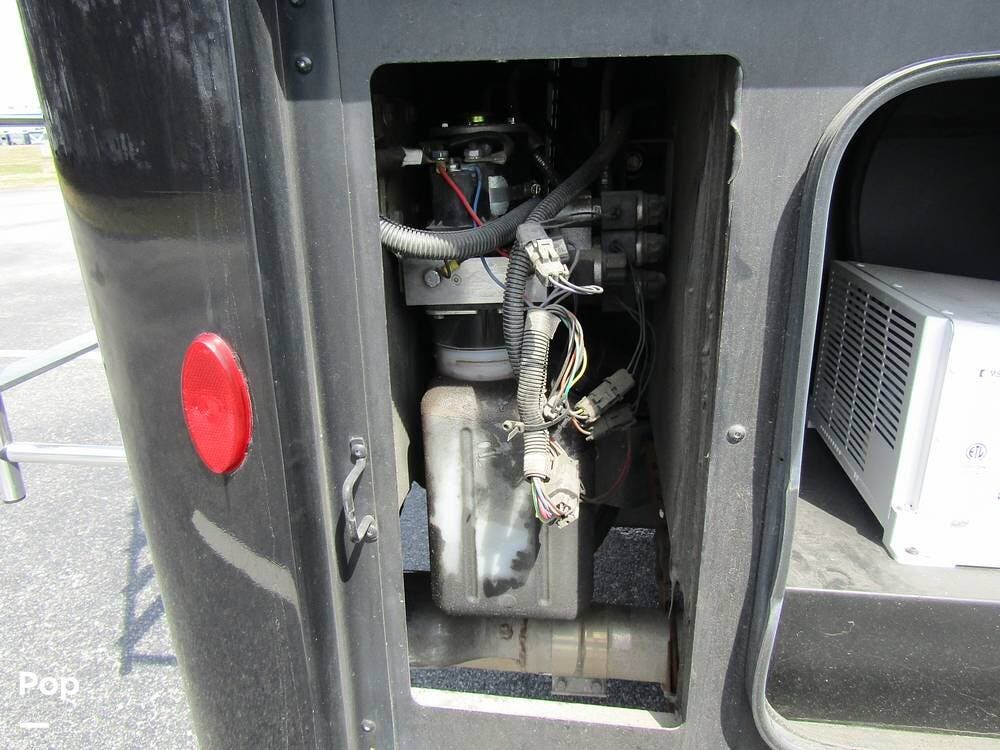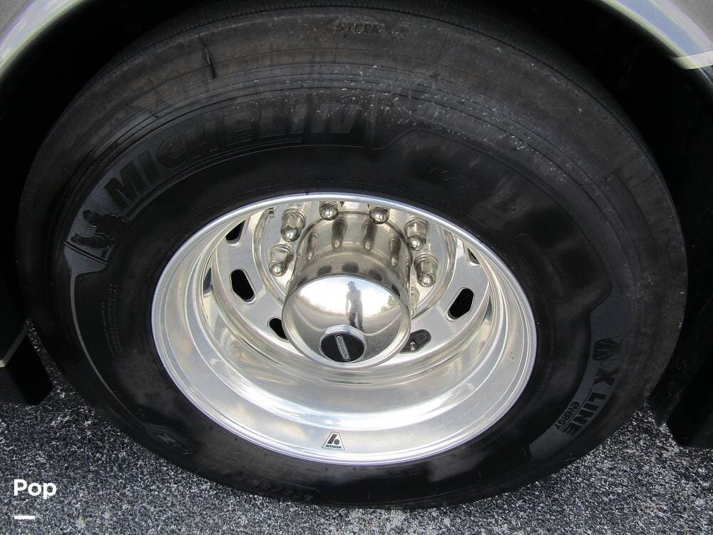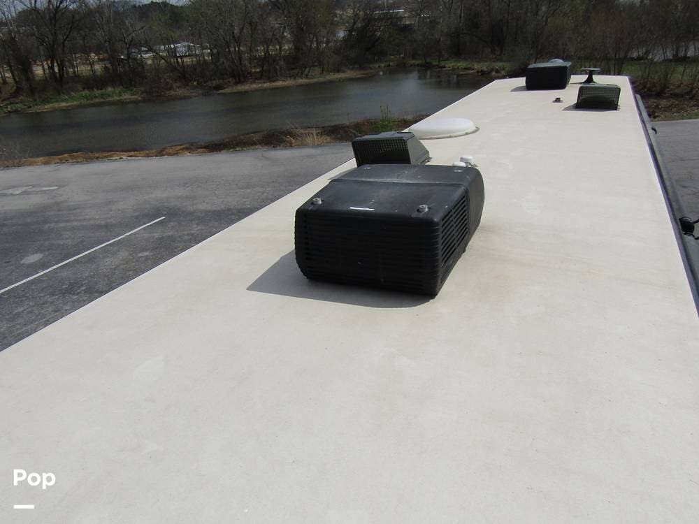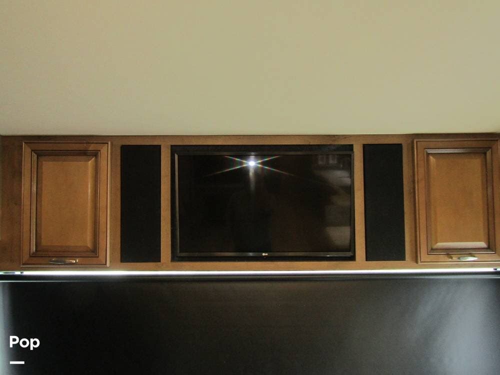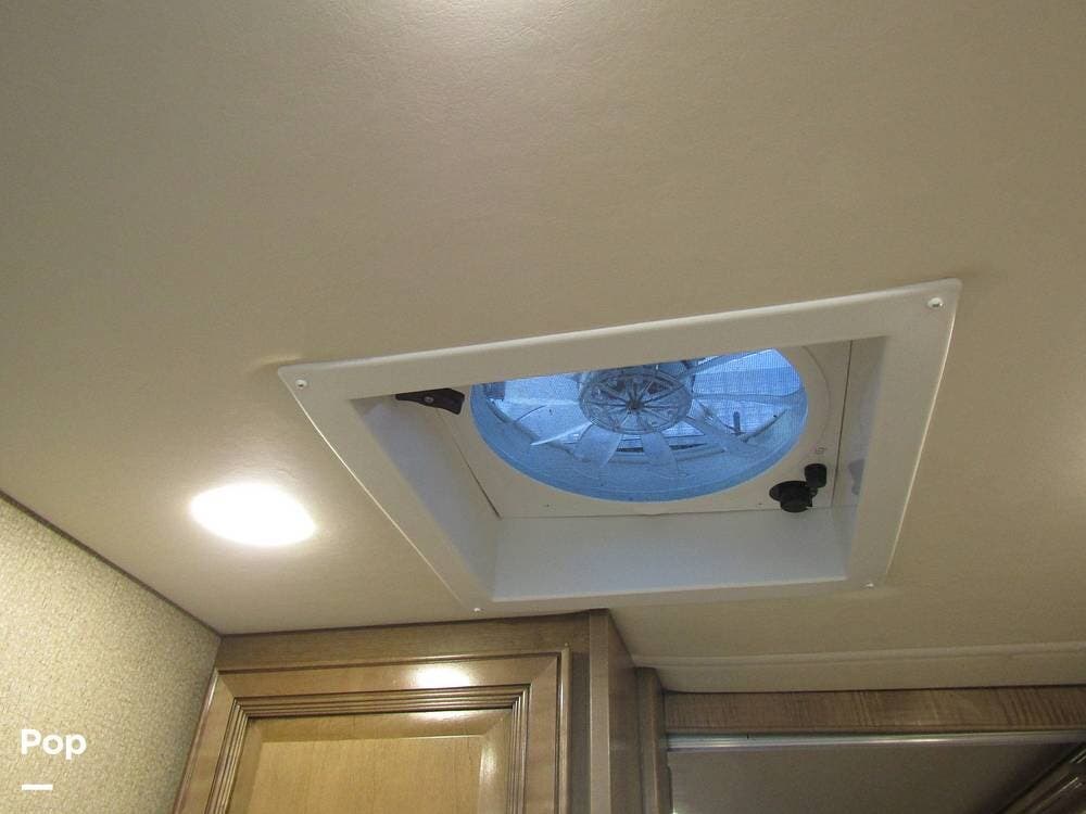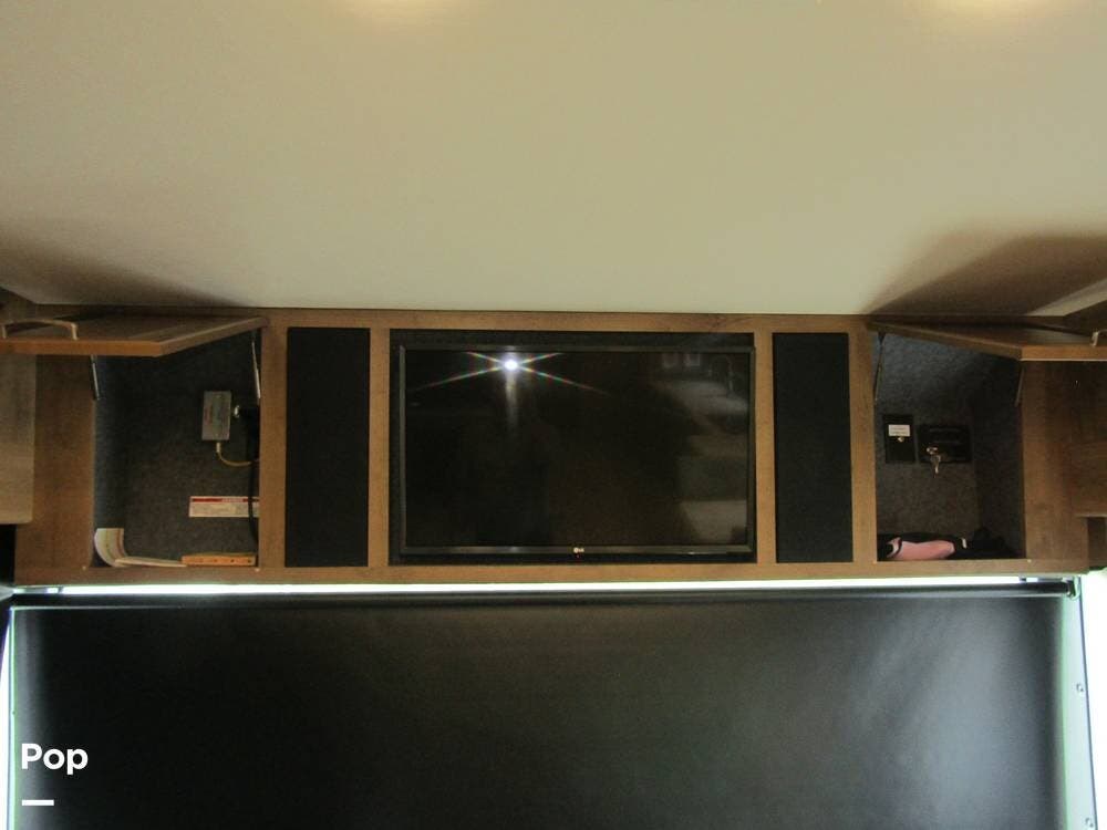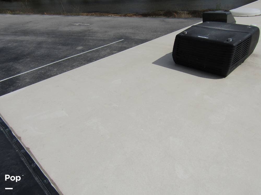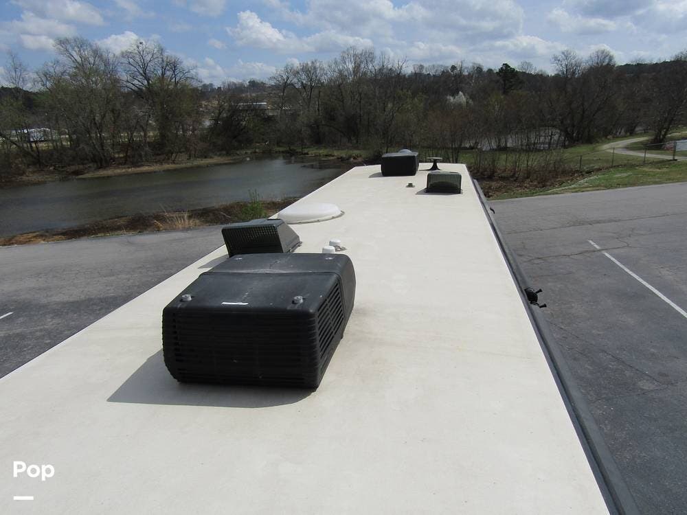 Outside, she has full-body paint, a full-size power patio awning, protective slide-topper awnings, driver's side manual window awnings, an exterior flat panel TV, an exterior shower, an auto-aim "King Tailgater" satellite antenna, rear and side-view cameras, and a two-piece roof access ladder.
