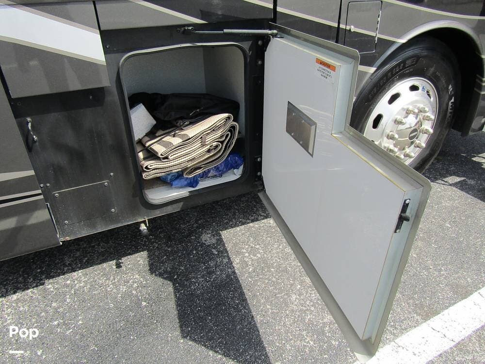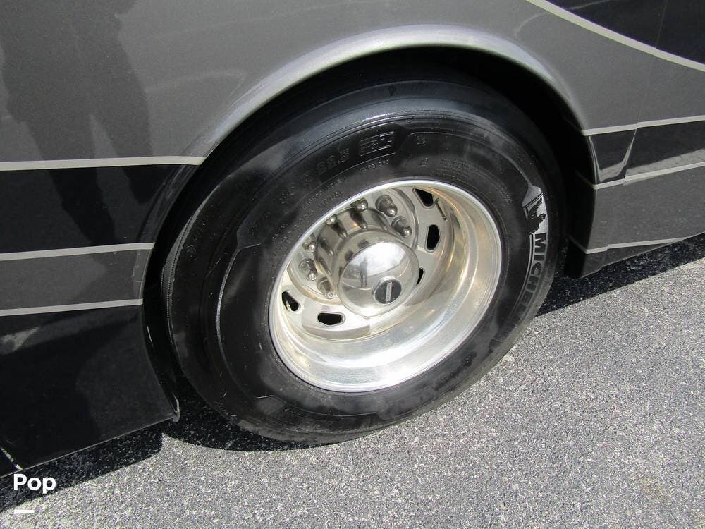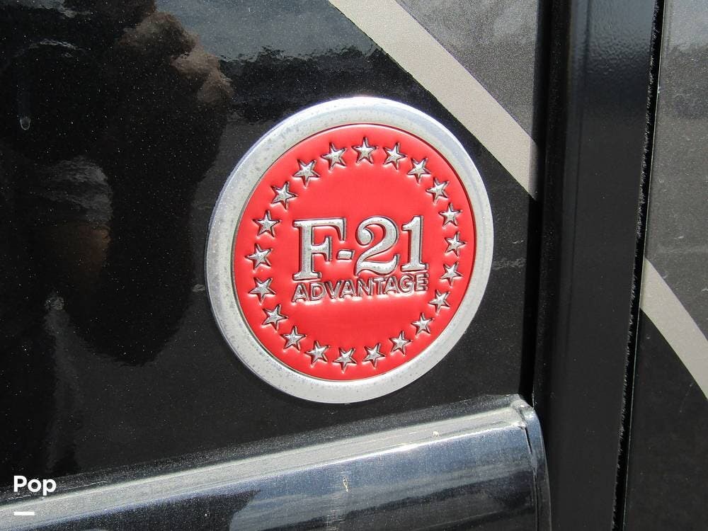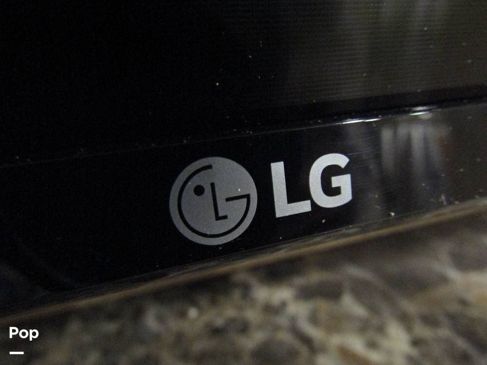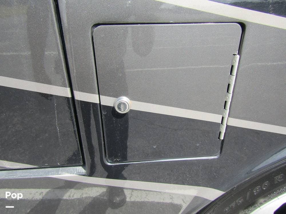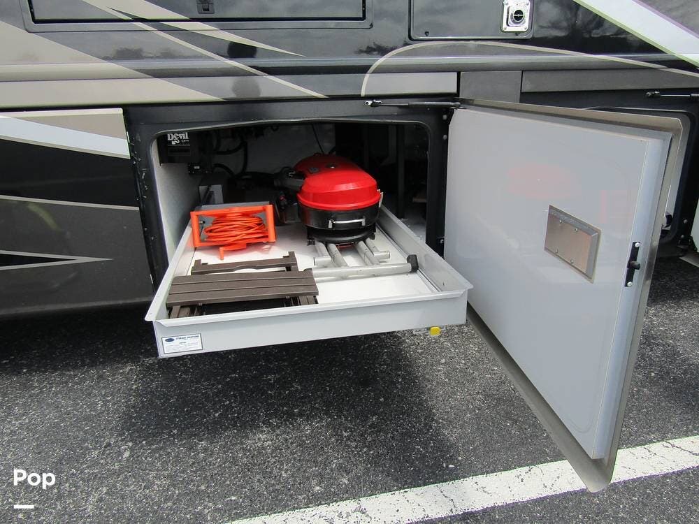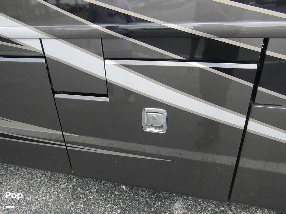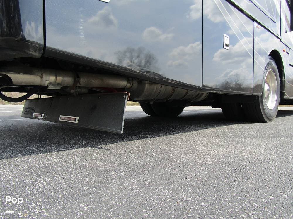 Outside, she has full-body paint, a full-size power patio awning, protective slide-topper awnings, driver's side manual window awnings, an exterior flat panel TV, an exterior shower, an auto-aim "King Tailgater" satellite antenna, rear and side-view cameras, and a two-piece roof access ladder.