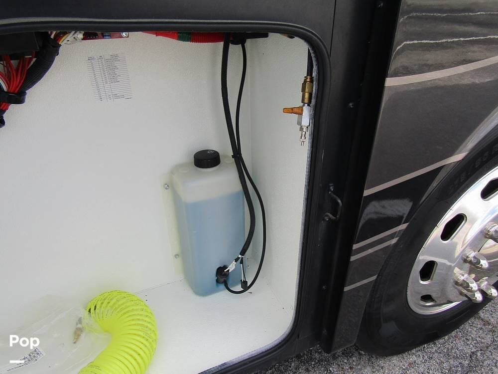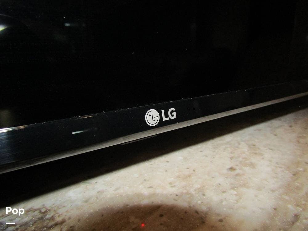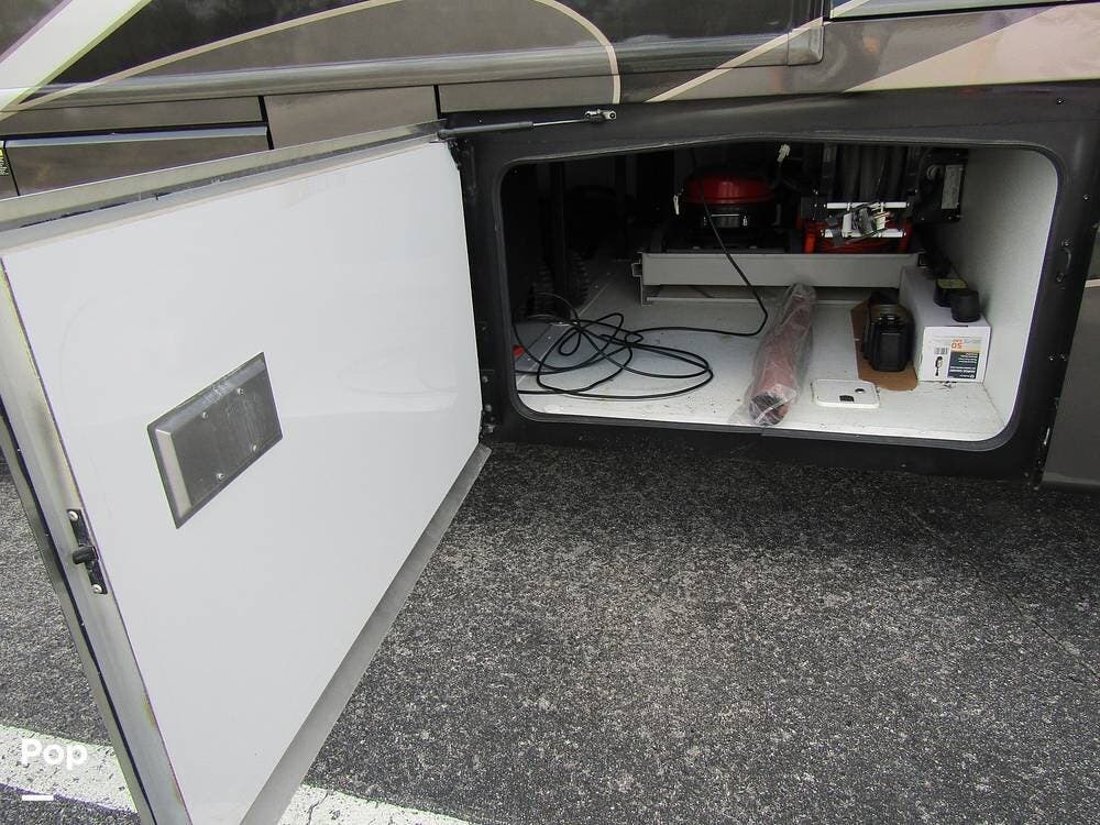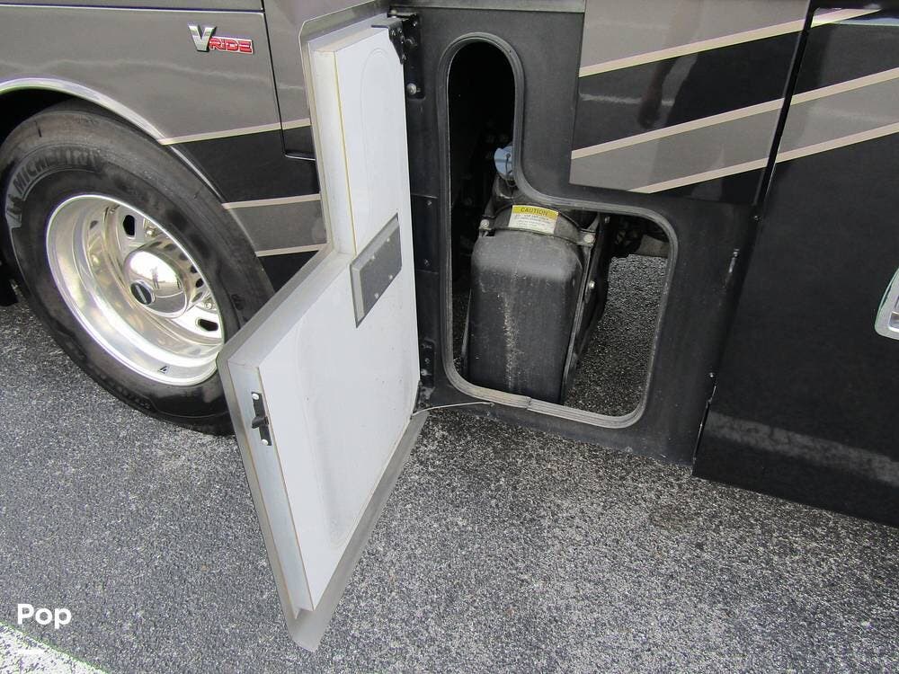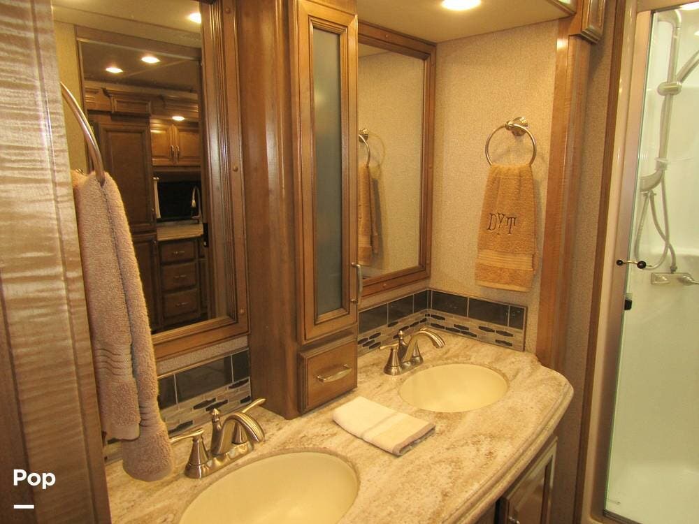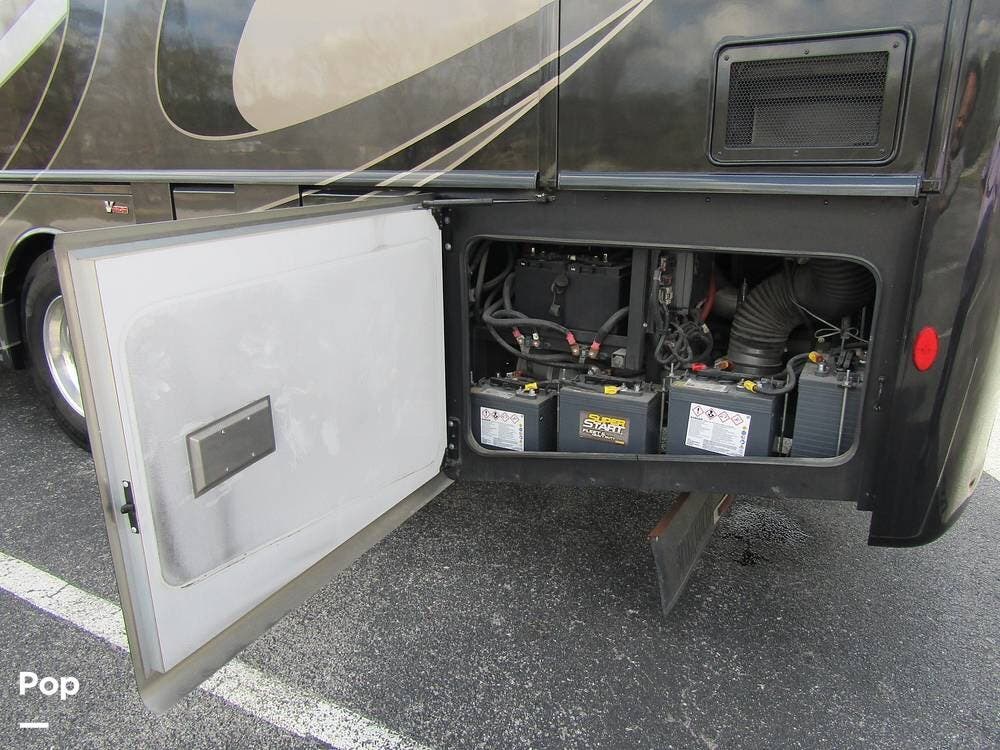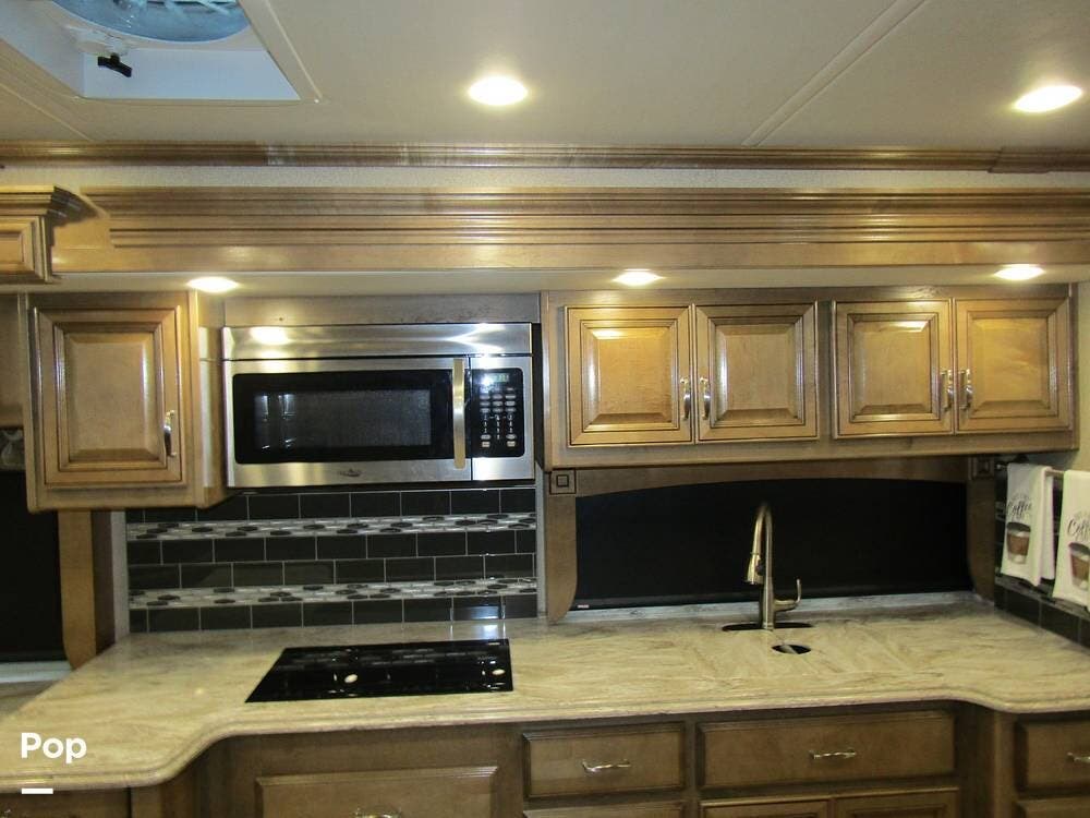 Outside, she has full-body paint, a full-size power patio awning, protective slide-topper awnings, driver's side manual window awnings, an exterior flat panel TV, an exterior shower, an auto-aim "King Tailgater" satellite antenna, rear and side-view cameras, and a two-piece roof access ladder.