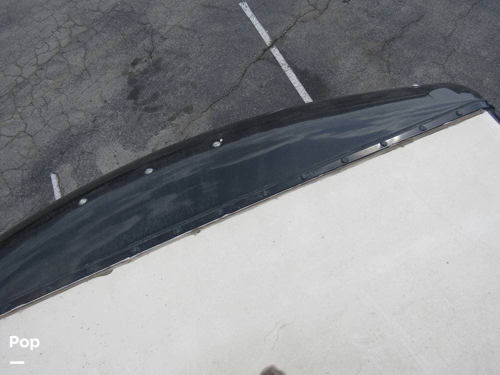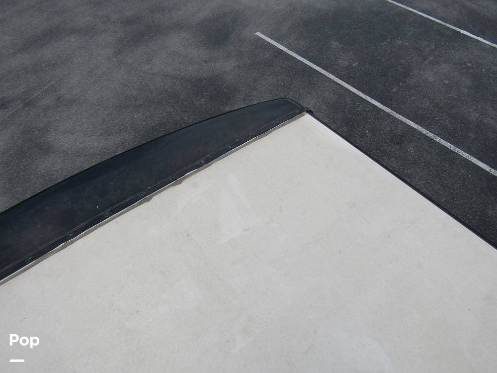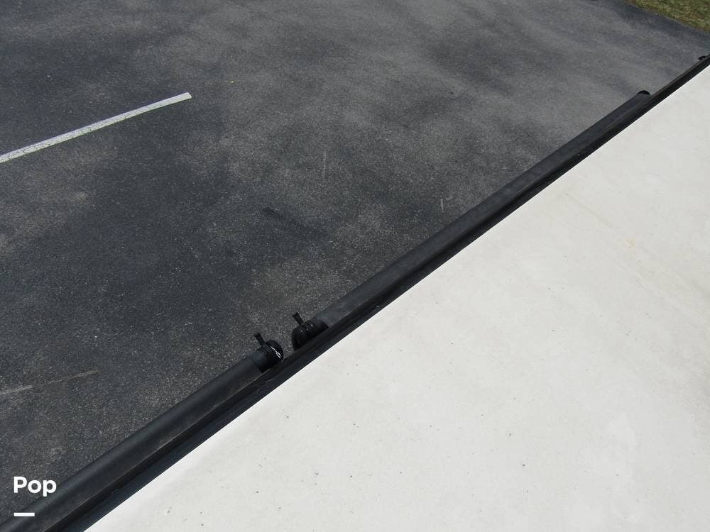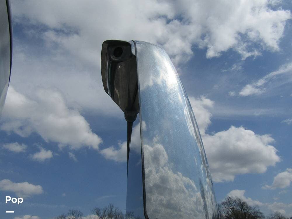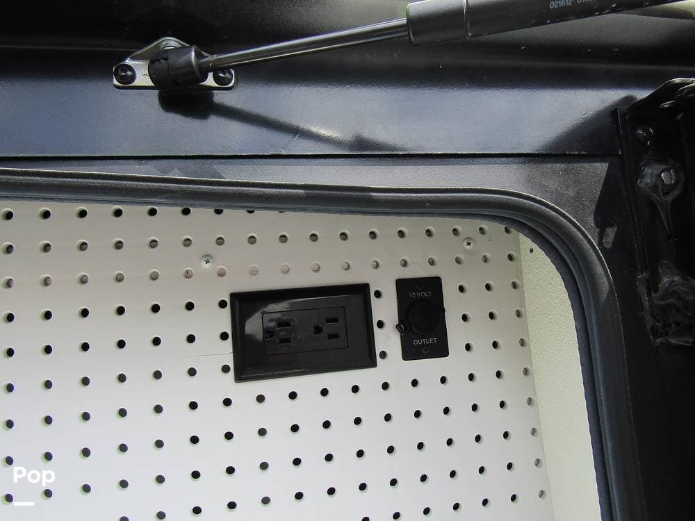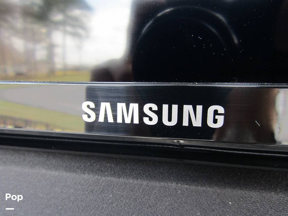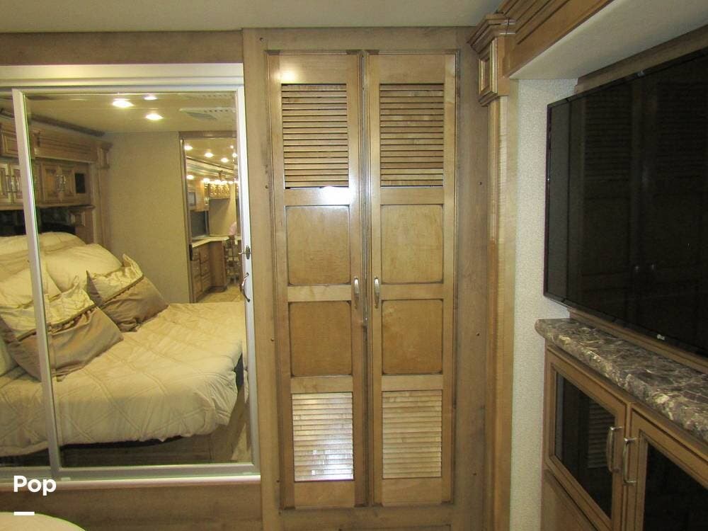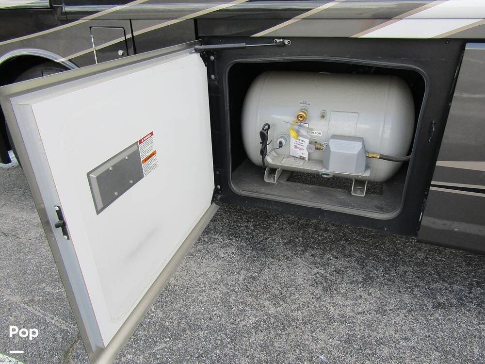 Outside, she has full-body paint, a full-size power patio awning, protective slide-topper awnings, driver's side manual window awnings, an exterior flat panel TV, an exterior shower, an auto-aim "King Tailgater" satellite antenna, rear and side-view cameras, and a two-piece roof access ladder.