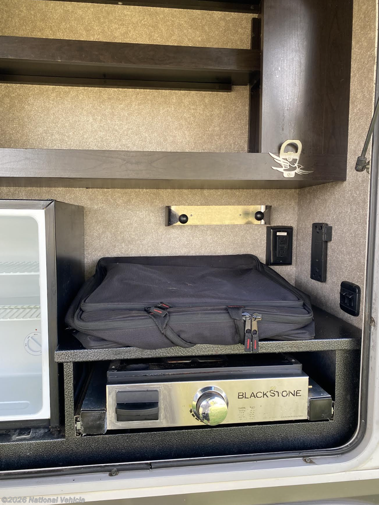 Outside, the Eagle truly shines. The outdoor kitchen has been upgraded with a Blackstone griddle, replacing the factory grill for serious cooking performance. A rear 5-pin connector allows you to power bike racks, hitch haulers, or accessories with ease, and a ladder-mounted bike rack makes bringing your bikes along effortless.