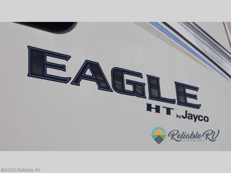 Enjoy every camping trip with this Jayco Eagle HT fifth wheel in tow! Model 26.5RLDS features a rear living layout with two recliners and an entertainment center with a LED TV, plus you can add an optional fireplace. The double slide outs help to open up the floor space, and within the rear slide out there is a tri-fold sofa and a free-standing table for you to enjoy a relaxing evening with friends and family. The private master bedroom features a queen bed plus a convenient entry door which leads into the bathroom. In the evening plan to grab your camp chair, a snack, and enjoy visiting with your family or friends while sitting under the 21' electric awning with LED lights.