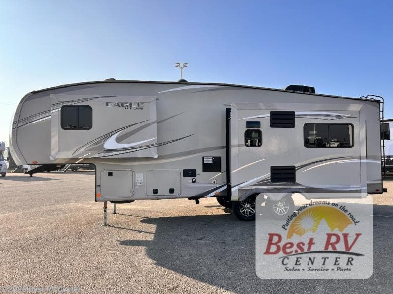 For any camping trip you will want an Eagle HT fifth wheel by Jayco. Along the exterior there is a high-gloss, fiberglass front cap with built-in specialty LED lighting. Inside each model there are handcrafted glazed drawers and Shaw residential carpet with R2X stain guard plus IVC Trekk wood-plank vinyl flooring. The industry exclusive HELIX cooling system is an added bonus with Jayco-exclusive insulated duct design, directional and closeable A/C vents, larger return air vents, and the exterior-mounted 15,000 BTU Whisper quiet A/C unit. The Customer Value Package includes a residential queen Simmons mattress with under-bed storage, an electric patio awning with integrated LED lights, MORyde CRE 3000 rubberized suspension for a smoother ride, a rain proof EZ Breeze bathroom power vent, an industry first Go Power rooftop and ground solar prep, plus so much more!