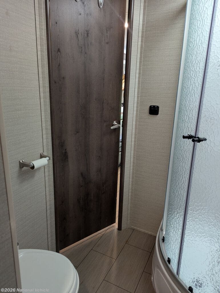 Mid-coach full bath with a spacious shower, vanity, and foot-flush toilet.