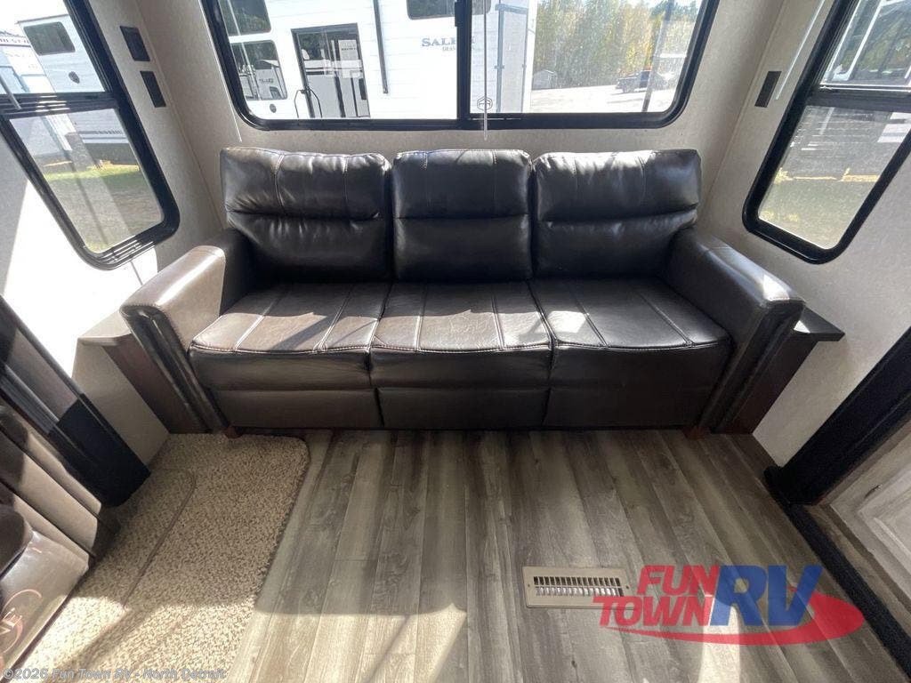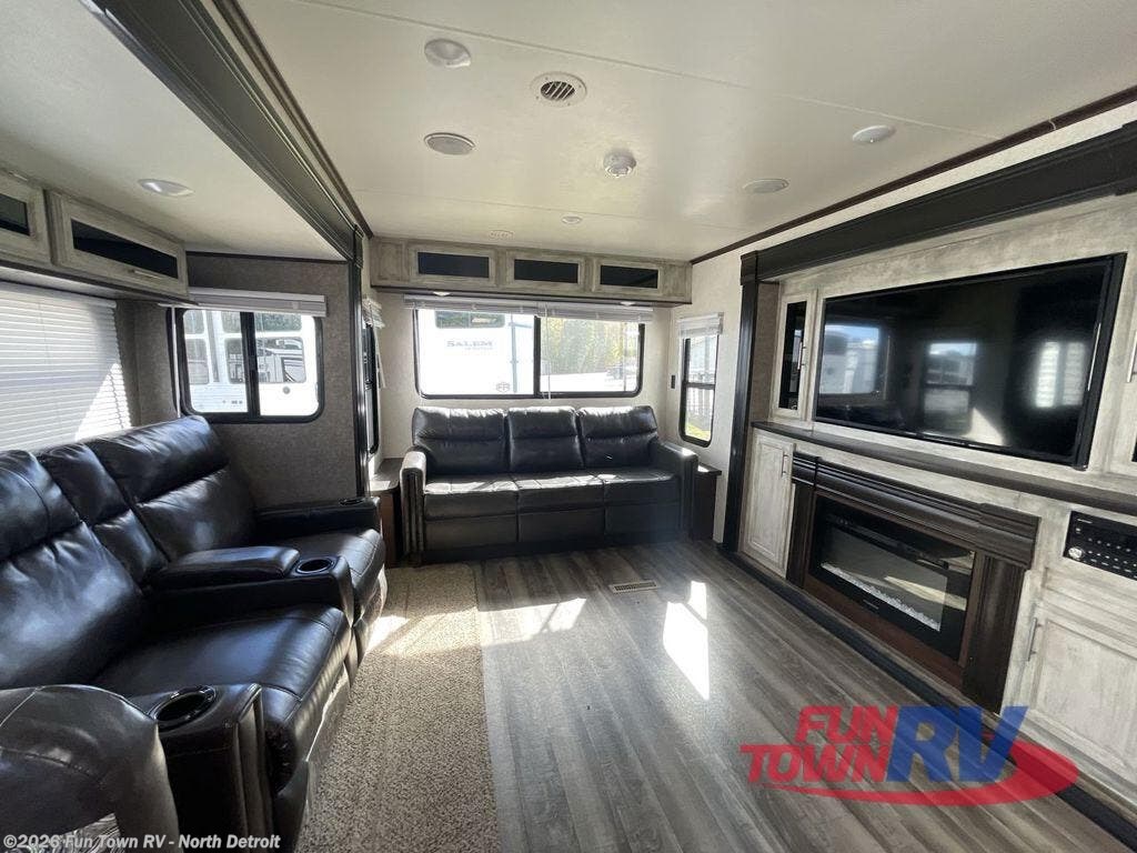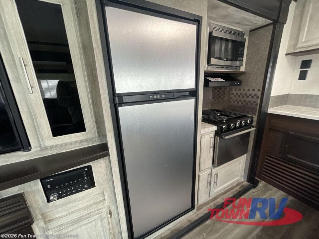 Can you picture yourself relaxing in the rear living area in this travel trailer? This model is perfect for a couple that enjoys plenty of space to invite other camper friends over or even the grandkids for a weekend away. The front master bedroom features a wardrobe, and a second entry into the bathroom. The main living and kitchen area includes dual slide outs for more floor space, theater seats, and additional furniture that will provide extra sleeping space for the overnight guests. You will love watching the big game or a show while staying warm from the fireplace. Stop picturing yourself, and start camping in this Jay Flight!