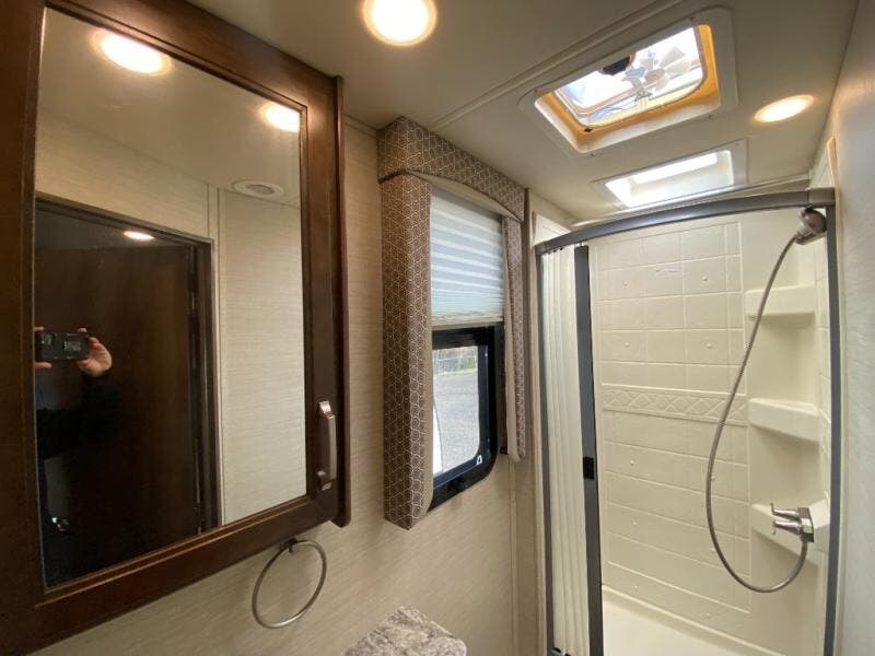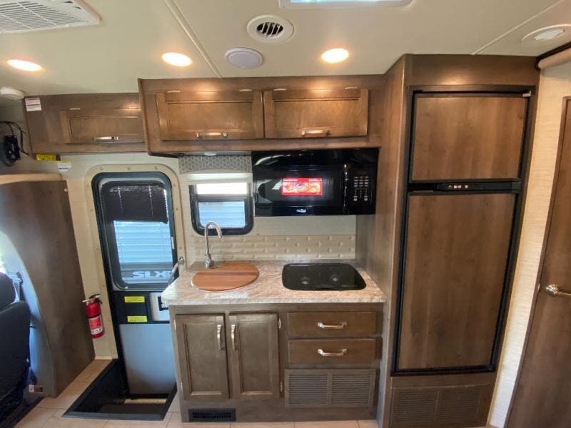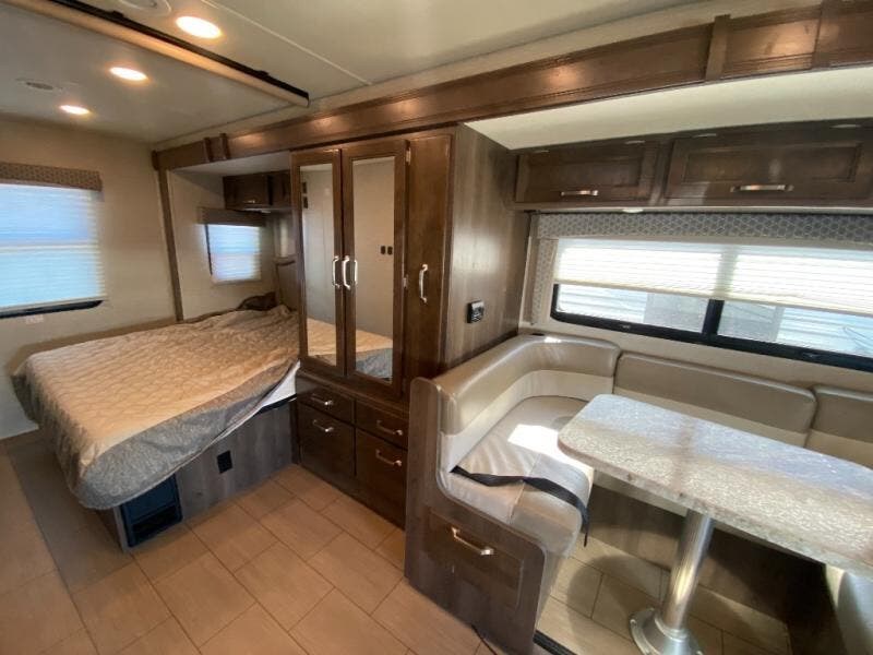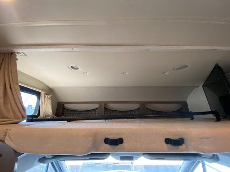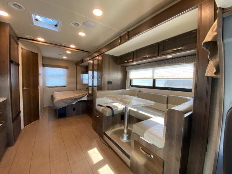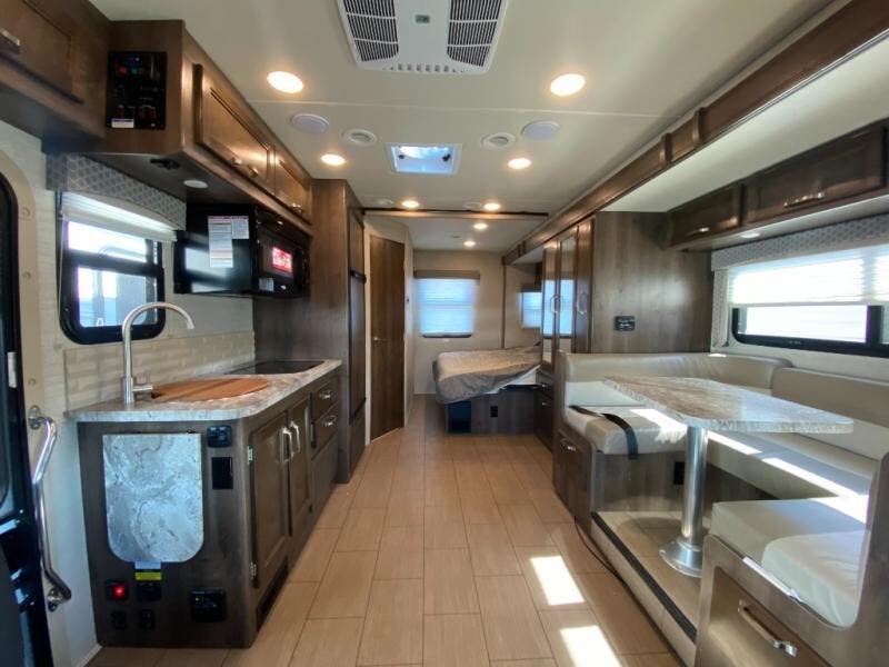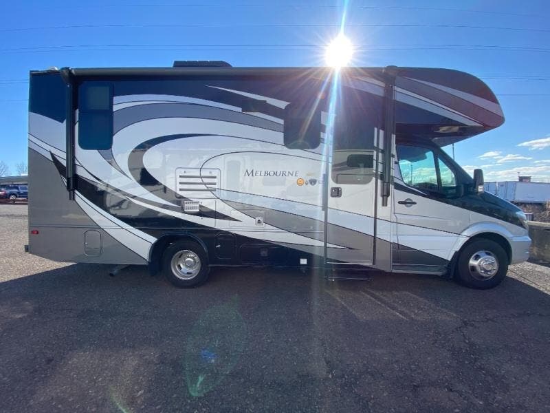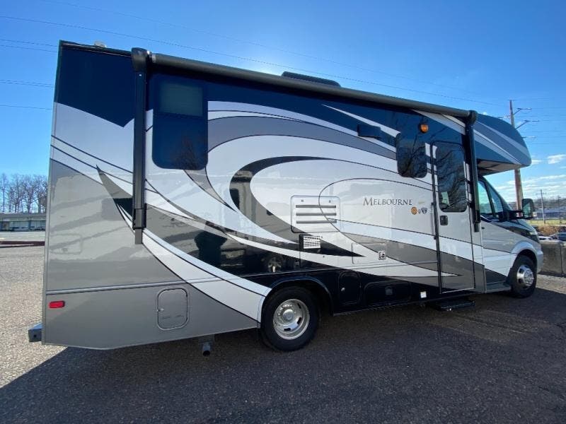 With any Melbourne class C coach all of your travels will seem a whole lot easier. The interior is homey and inviting and provides all the space you need to enjoy time inside when the weather doesn't cooperate with your outdoor plans. You will appreciate the LED lighting throughout, and comfortable seating. The bath embraces residential style and includes laminate countertops, a combo tub/shower, and even a skylight to bring in more natural lighting. You will find optimal storage both inside and out with overhead cabinets throughout, base cabinets in the kitchen as well as under the dinette seating, and in the mesh pockets for books and magazines. On the outside, enjoy a spacious pass-through storage compartment for all of your travel gear, an outdoor shower to rinse off your feet or the family pet before heading inside, and an LED lit electric awning for easy outdoor entertainment at night, plus so much more!