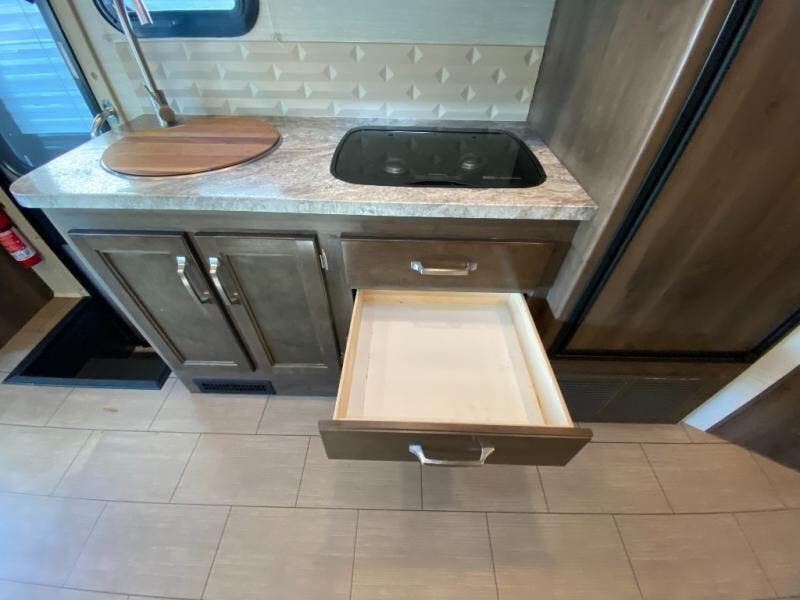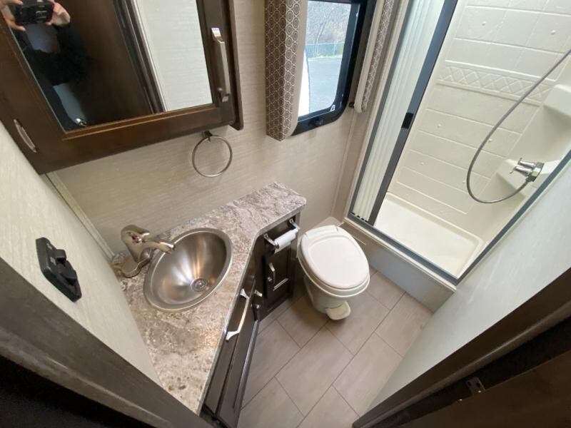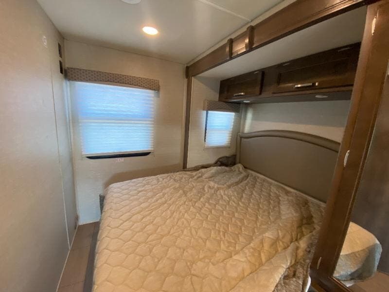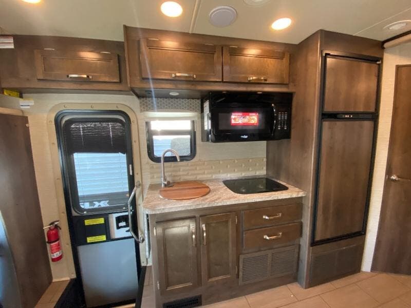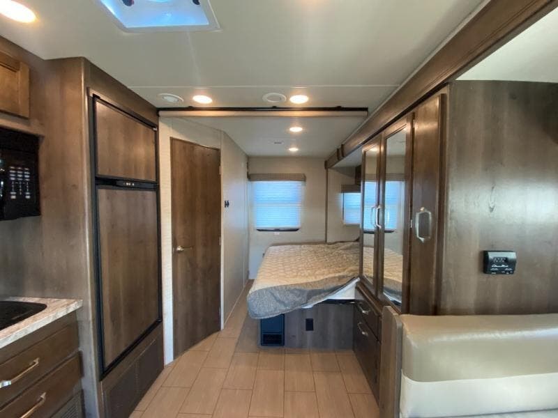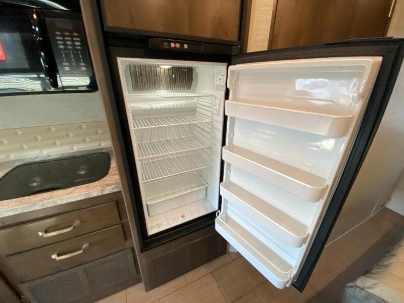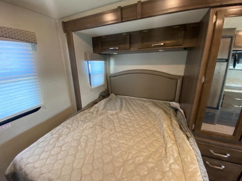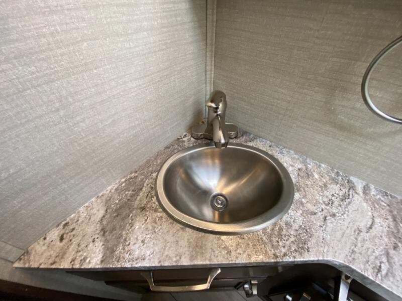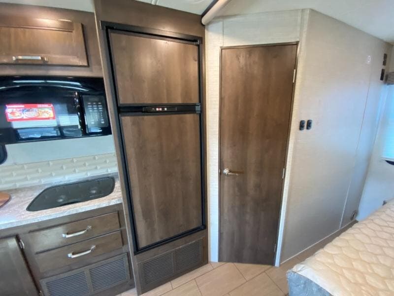 With any Melbourne class C coach all of your travels will seem a whole lot easier. The interior is homey and inviting and provides all the space you need to enjoy time inside when the weather doesn't cooperate with your outdoor plans. You will appreciate the LED lighting throughout, and comfortable seating. The bath embraces residential style and includes laminate countertops, a combo tub/shower, and even a skylight to bring in more natural lighting. You will find optimal storage both inside and out with overhead cabinets throughout, base cabinets in the kitchen as well as under the dinette seating, and in the mesh pockets for books and magazines. On the outside, enjoy a spacious pass-through storage compartment for all of your travel gear, an outdoor shower to rinse off your feet or the family pet before heading inside, and an LED lit electric awning for easy outdoor entertainment at night, plus so much more!