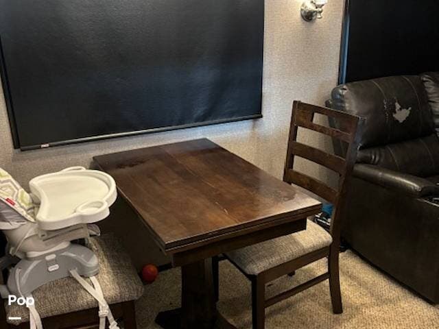 The living area is located at the rear. It has theater seating, a tri-fold sofa, an entertainment center with a large TV, and an electric fireplace. The kitchen has stainless steel appliances, a full-size residential refrigerator, a large pantry, a kitchen island with a double sink, and solid-surface countertops. The dining area includes a free-standing table with chairs.