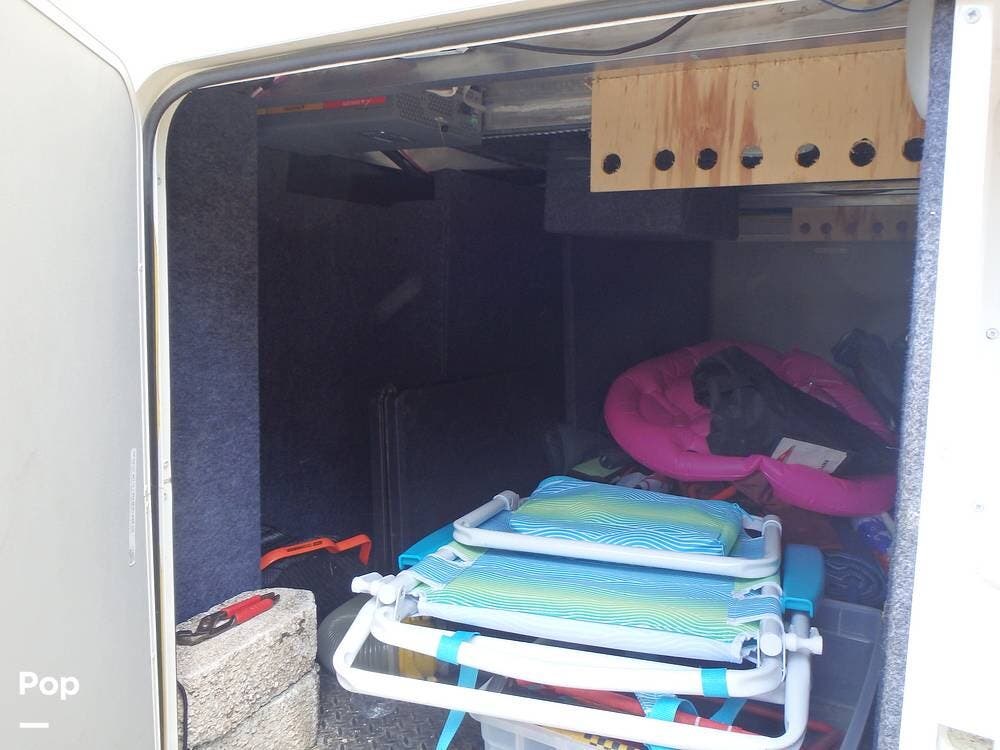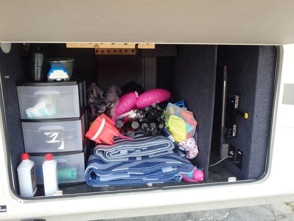 There is a lot of inside storage, including closets and cabinets. There is also a large outdoor storage area that can be accessed from both sides and storage that can be accessed on the front under the fifth wheel hitch.