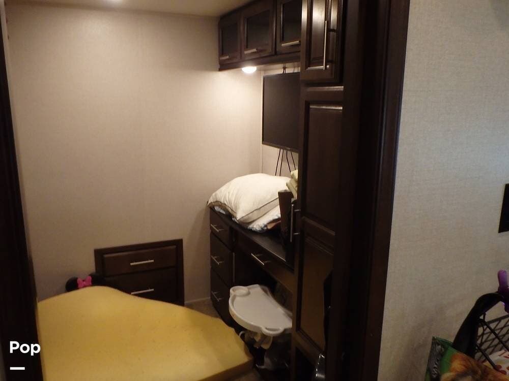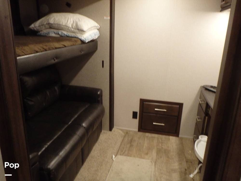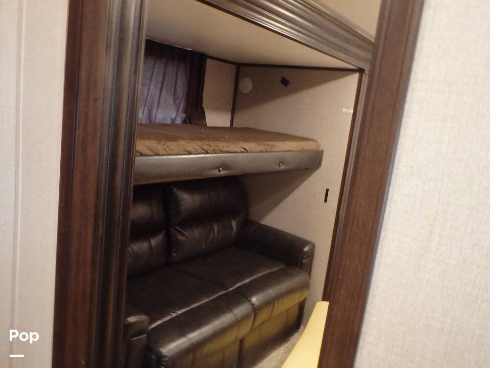The 2019 Jayco North Point 377RLBH is a luxury fifth-wheel RV designed for families and full-time living. It features four slide-outs, creating a spacious interior focused on comfort and functionality. The floor plan includes a mid-bunk room with a sleeper sofa and a loft above, offering additional sleeping or living space.