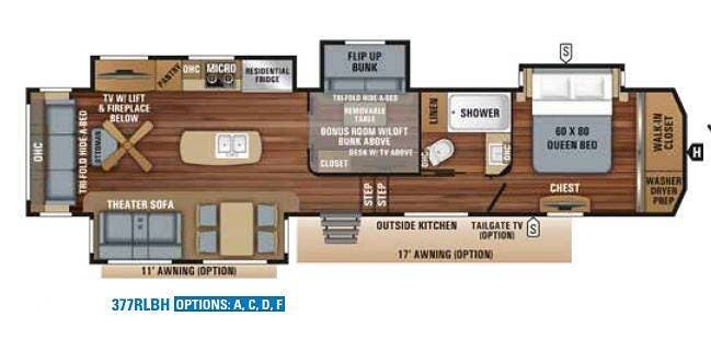 This stunning fifth wheel is designed to meet every need, featuring a versatile mid-bonus room that can serve as a dedicated bunkhouse for the kids or a private office space when you're working remotely.