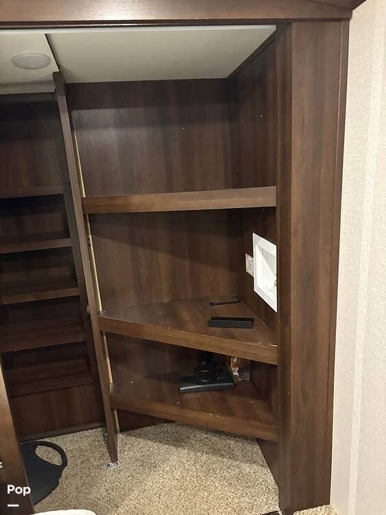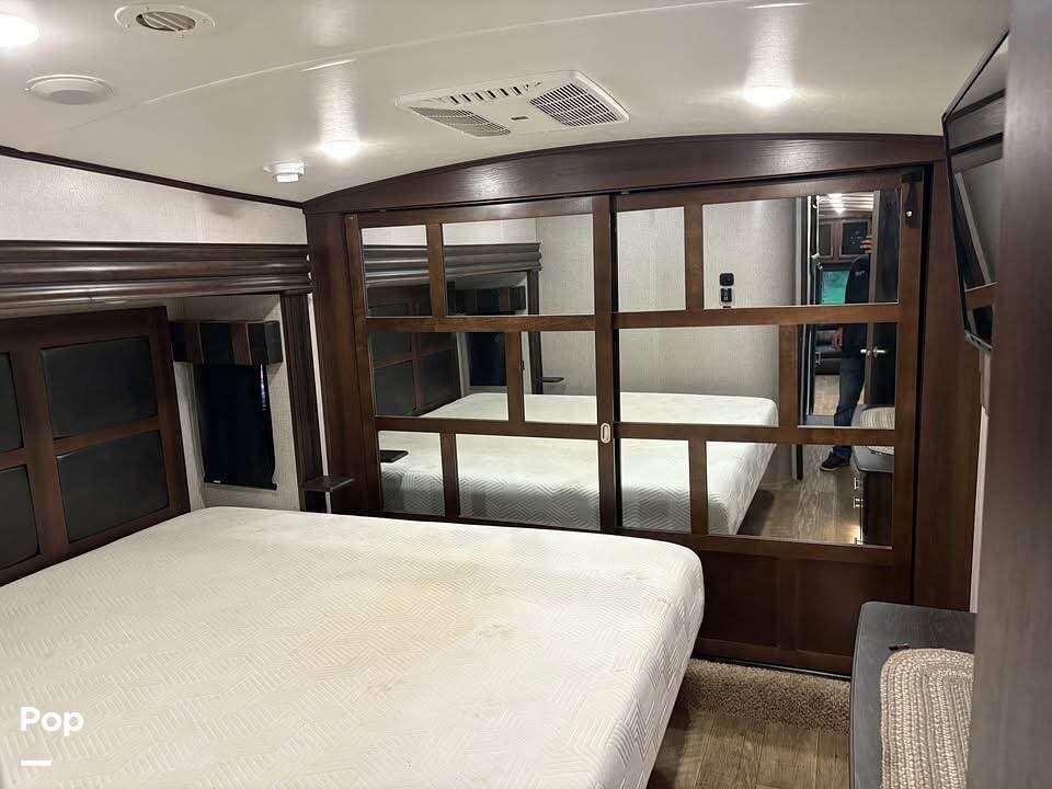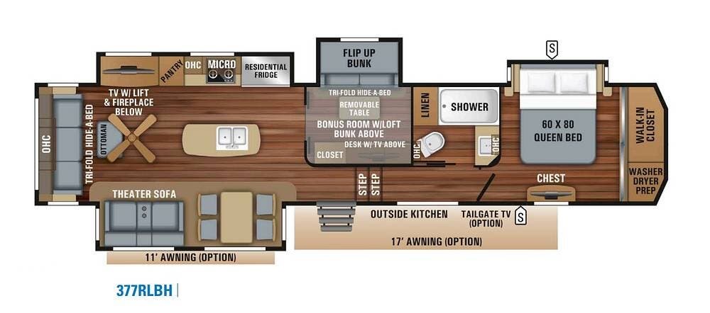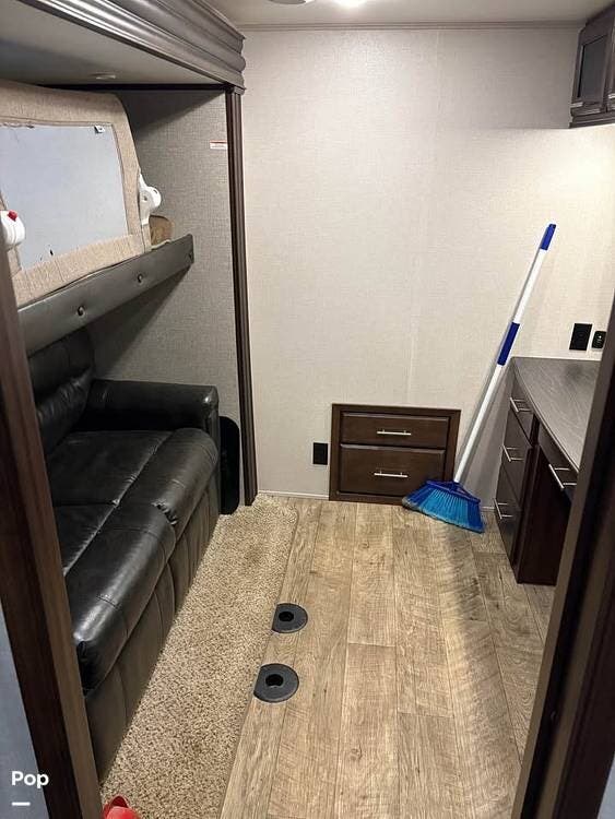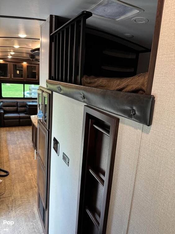 Off the main living area is the 1st private bedroom featuring a sofa/sleeper, flip-up bunk. Across is a closet and a desk with a TV to enjoy. Above this bedroom is a lofted bedroom area for additional sleeping space or storage.
