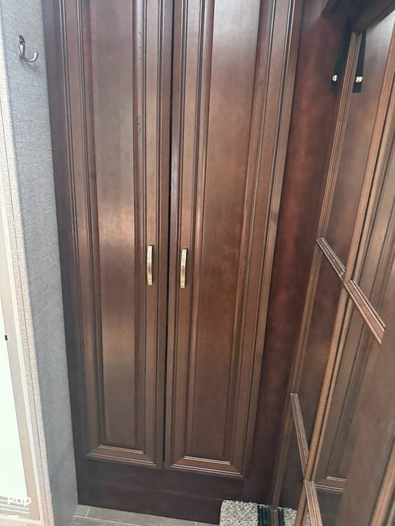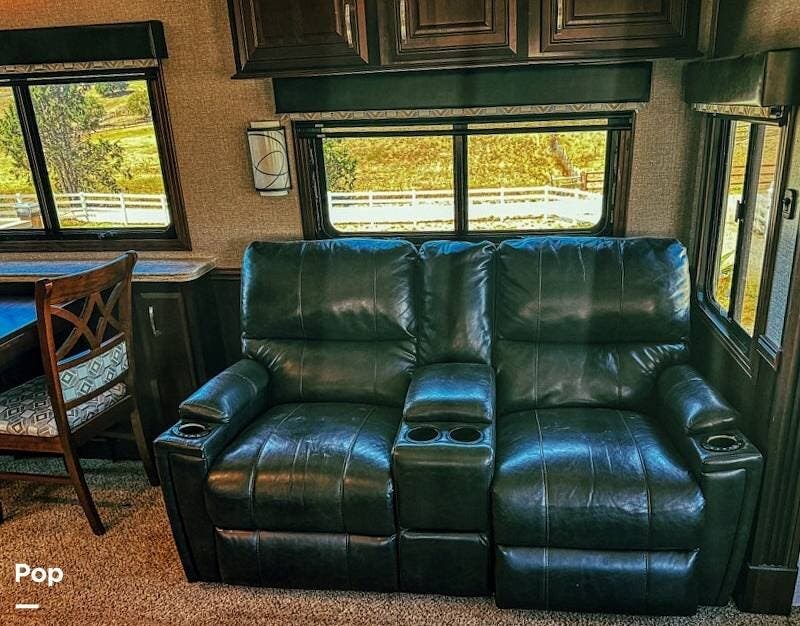 The gourmet kitchen is equipped with a residential 21 cu. ft. refrigerator w/ ice maker, convection microwave, gas cooktop and oven, large pantry, and a dining table with chairs. The spacious living area features power-reclining theater seating and a tri-fold sofa sleeper for guests.
