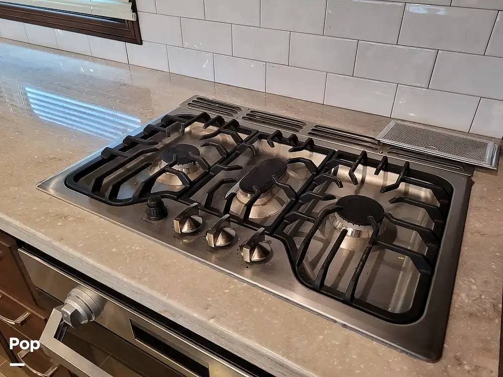 The main living room and the kitchen are massive, with high ceilings (9 feet!), a full Island in the kitchen, and low power consumption LED lighting. A full-size Whirlpool fridge and freezer with icemaker, 3-burner stove, oven, microwave, dual basin sink, plenty of counter space, and a pop-up multi-plug/charger.