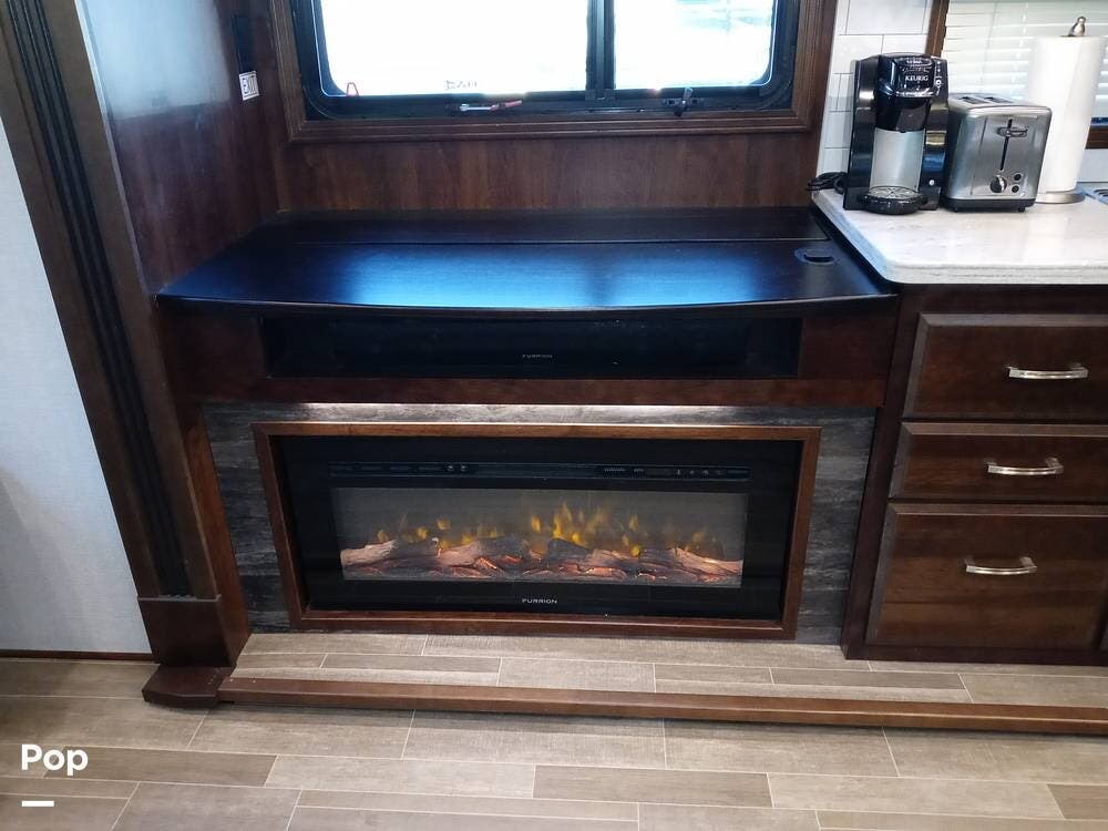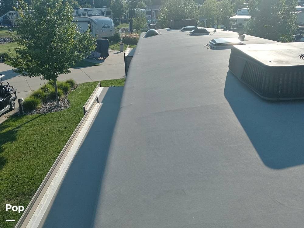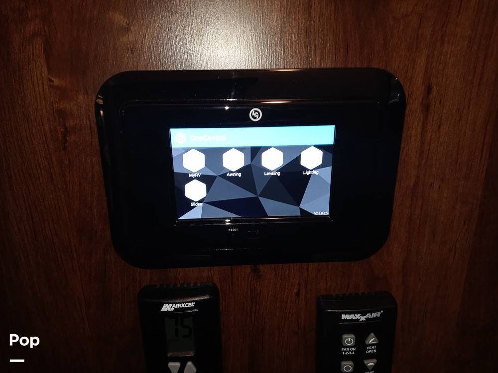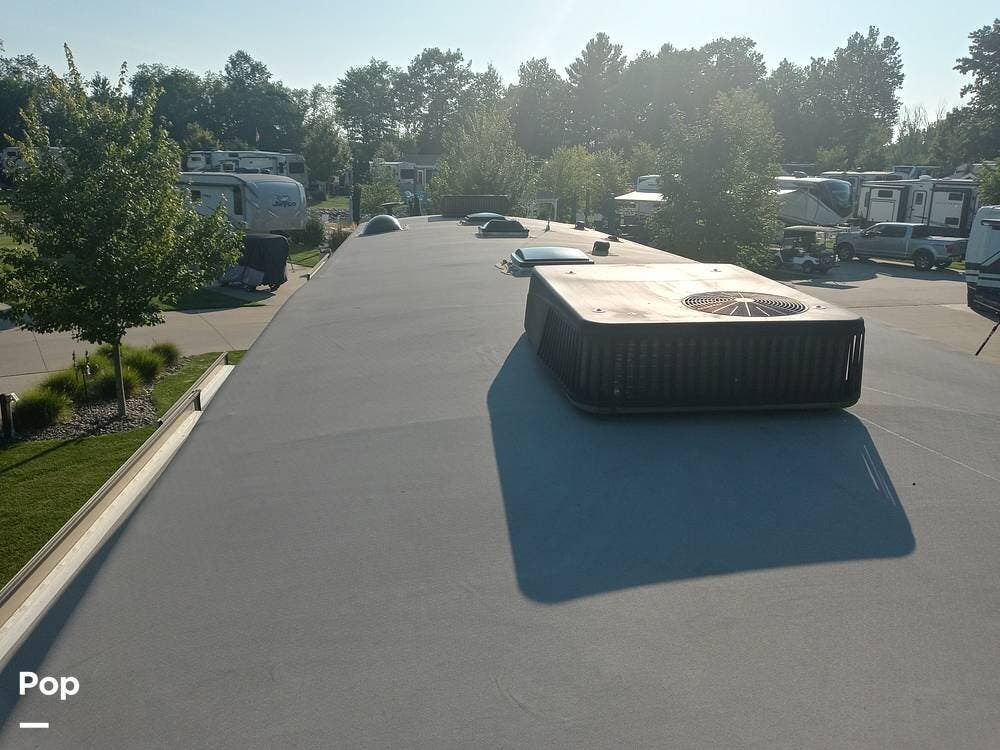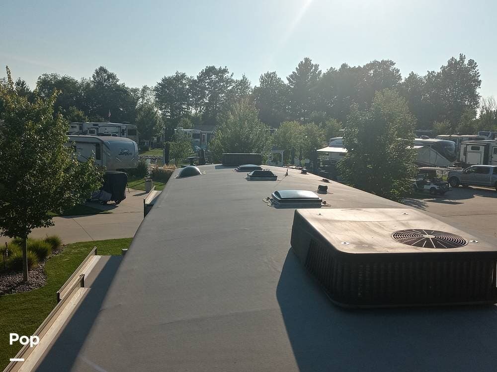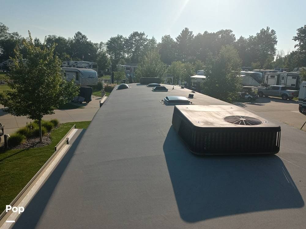 The unit has an upgraded roof and a dual-power upgraded fridge that comes with two awnings, set up for a three-camera system, four slide-outs, and two 15,000 BTU A/C units.