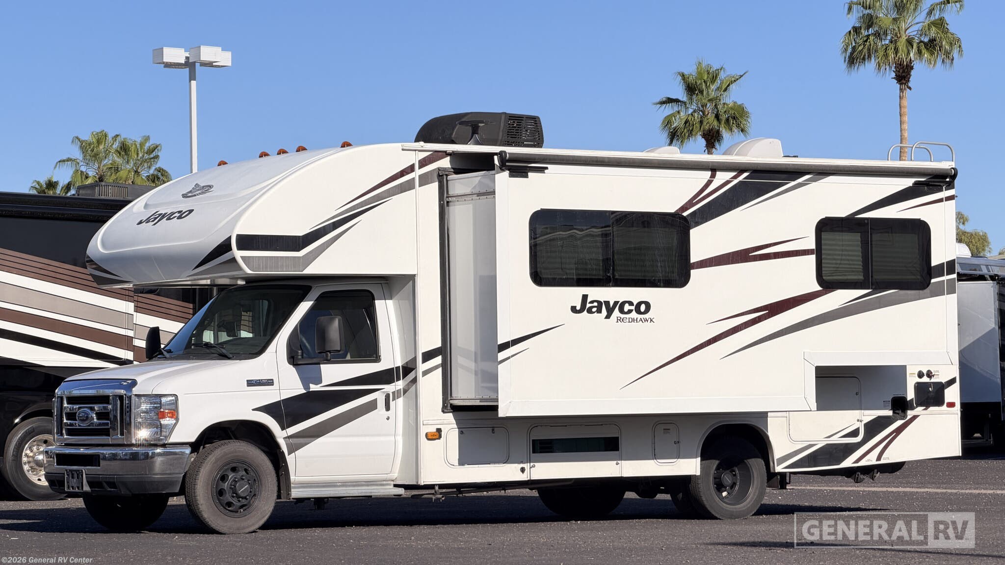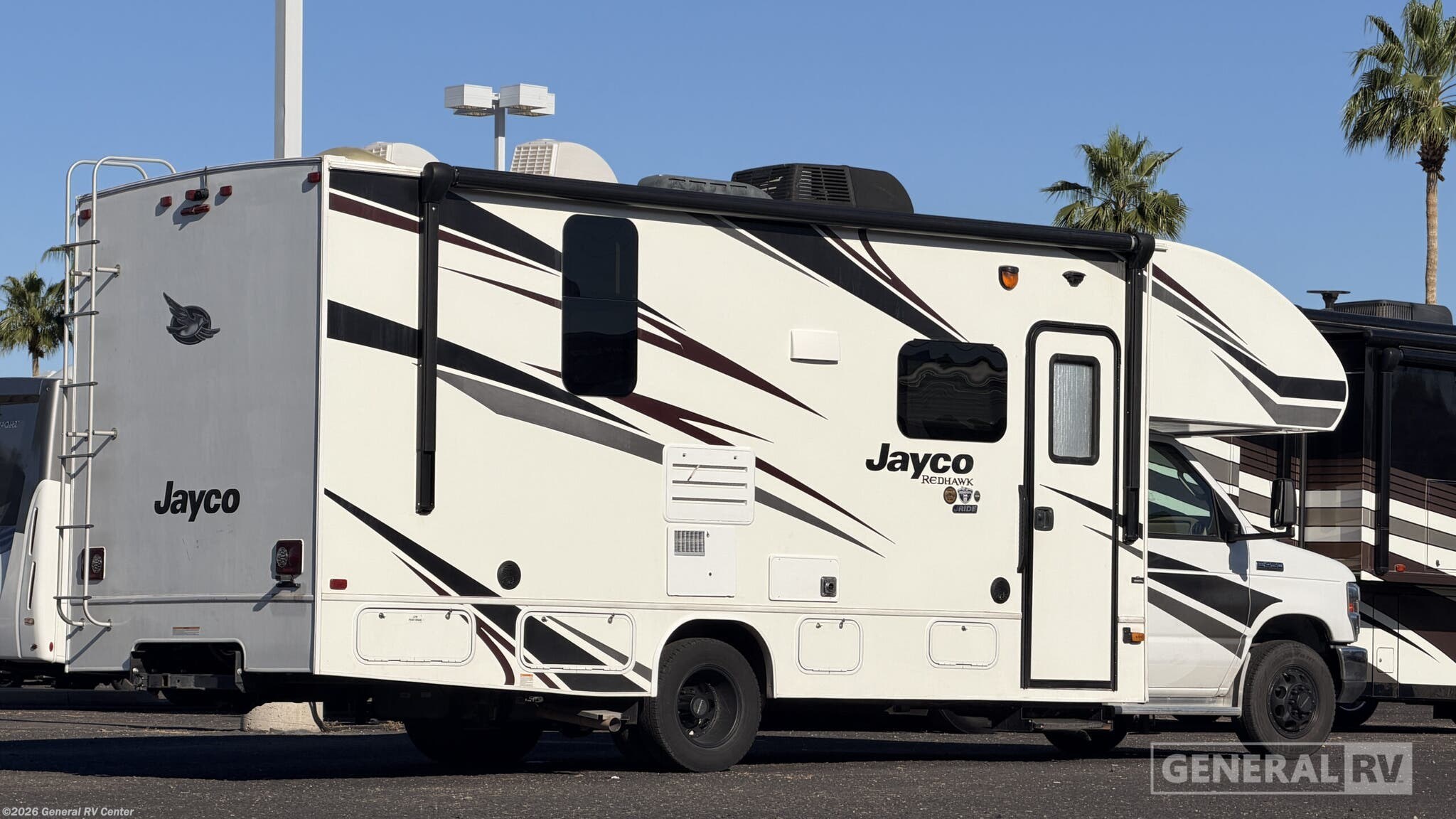 Jayco Redhawk 24B class C gas motorhome highlights: Cab-Over Bunk U-Shaped Dinette Rear Corner Bath Pantry/Wardrobe Enjoy camping the right way, inside this Jayco Redhawk 24B motorhome! You can easily get squeaky clean in the rear corner bath with the 30" x 36" shower, and keep your essentials handy inside the medicine cabinet. If you have prepared too much of a delicious meal, no worries! You can conveniently store the leftovers inside the 8 cu. ft. double door refrigerator and enjoy them once again. There are lots of overhead cabinets for you to bring along all of your camping necessities and there is even outside storage too. If you want some fresh air but don't want to get a sunburn, then grab a chair and your favorite drink, and head underneath the 16' electric patio awning! With any Jayco Redhawk class C gas motorhome you will get reliability and value on the open road. From the molded, seamless fiberglass front cap protecting you from the wind and rain, and the JRide package for the ultimate driving experience, to the rear backup camera that feeds directly to your in-cab monitor to help you reverse with more visibility, you will find satisfaction for years to come. Inside, you can stand tall with a seven-foot ceiling height, cook your meals at the three-burner range with 9,000 BTU SuperBurner and piezo igniter plus convection microwave (n/a 31XL), plus dine at the Jayco-exclusive easy operation, legless dinette table. Come see why you should own a Redhawk motorhome today!