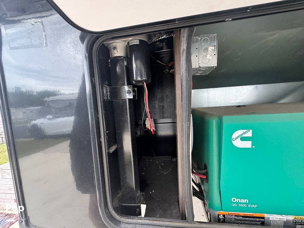 The exterior features two slides, a sliding side-door deck entry, a rear garage-ramp patio, two awnings, a pop-up television, a 5.5kW EVAP generator, two 30-pound propane tanks, and compartmental storage.