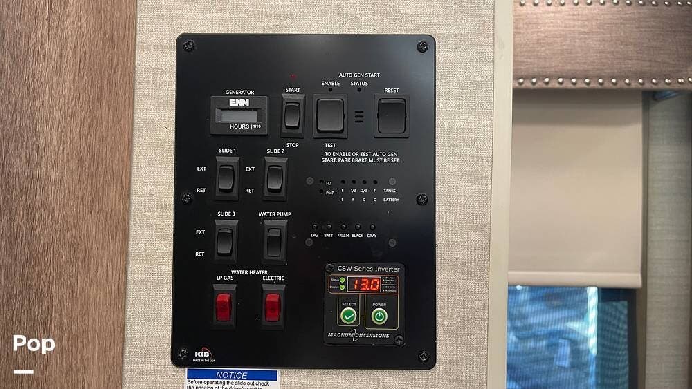 The spacious layout, with three slides, comfortably sleeps 6+ and will make being on the road a real treat. Traveling down the road or at your off-grid campsite, the Onan 8.0kW generator (190 hrs) will deliver all the power you need to be comfortable. The roof-mounted Roadtrip satellite antenna (works with Dish or DirecTV) will come in handy as well.